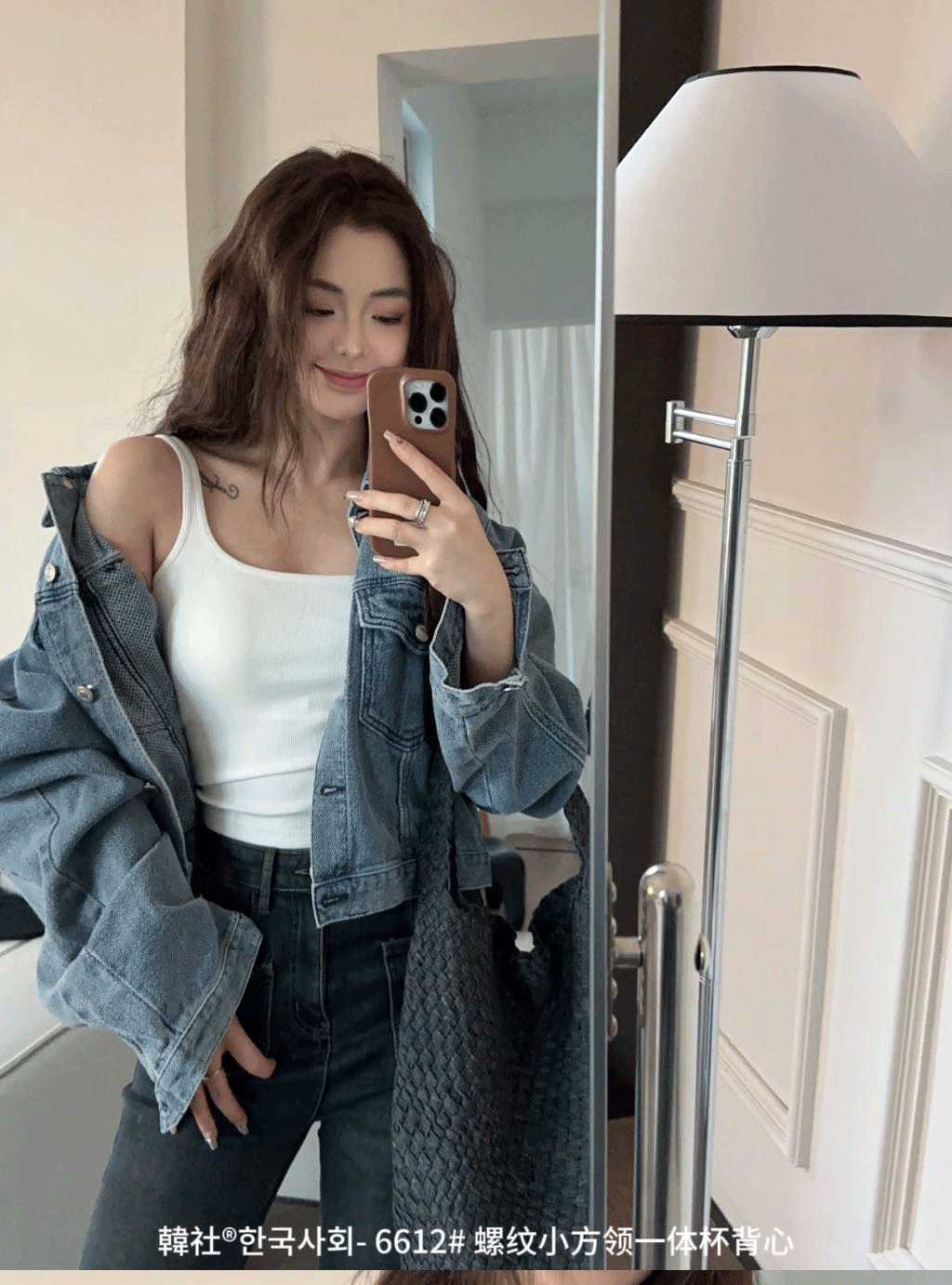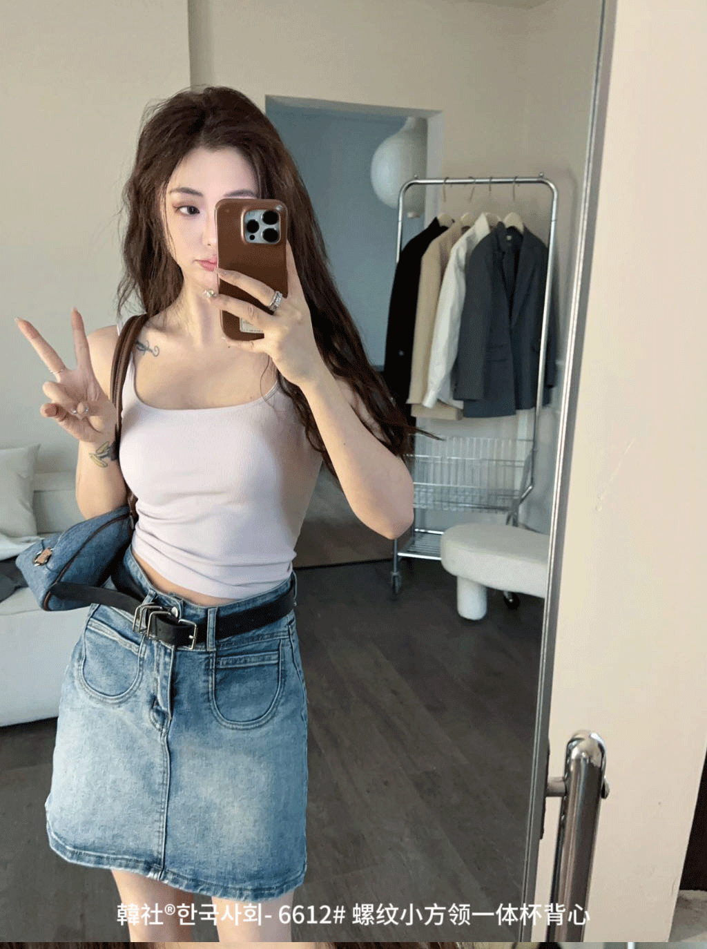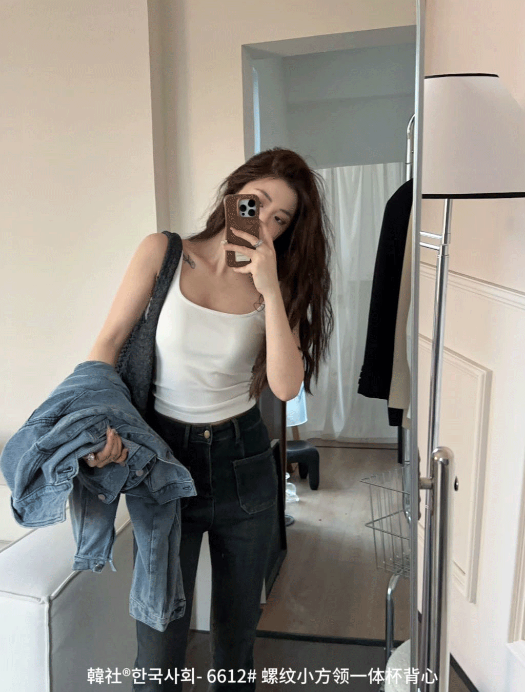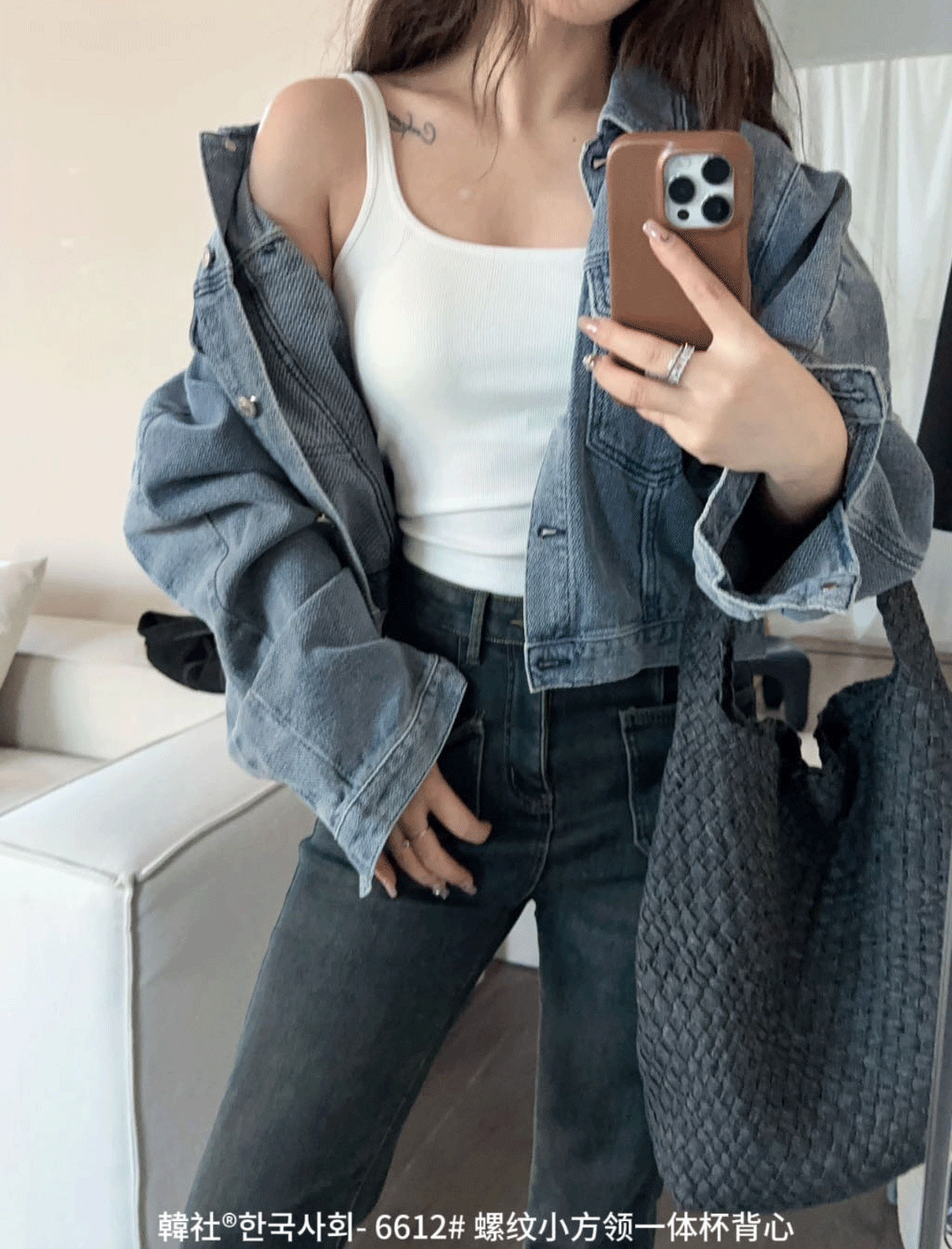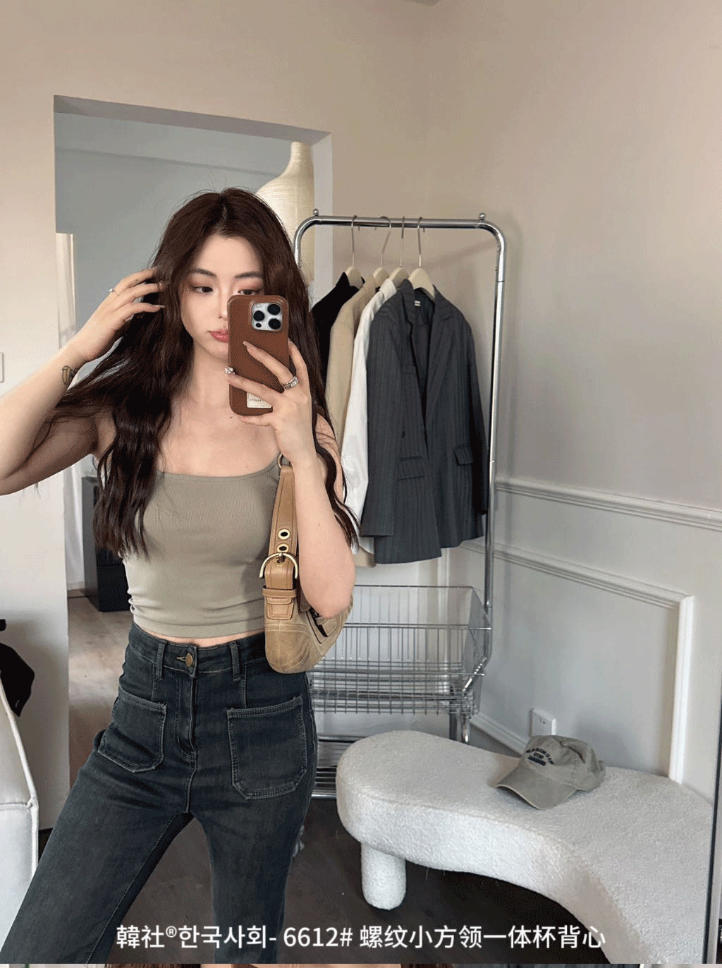 6612 Threaded Small Square Collar Sling Fixed Cup Vest 여성용 슬림 핏 내복 외부 착용 슬림 해 보이는 파라 가슴을 덮는 아름다운 뒷 조끼스토어 가기