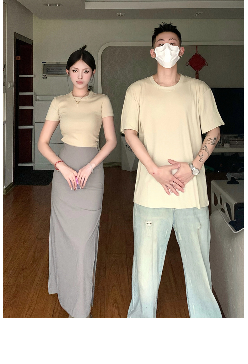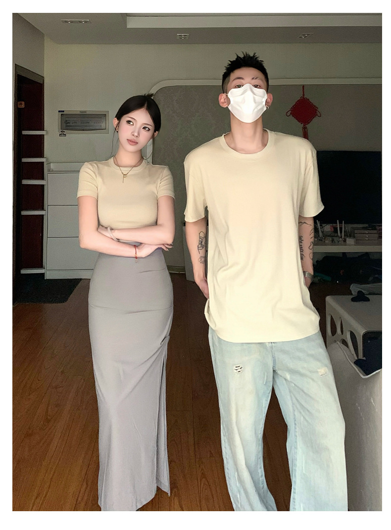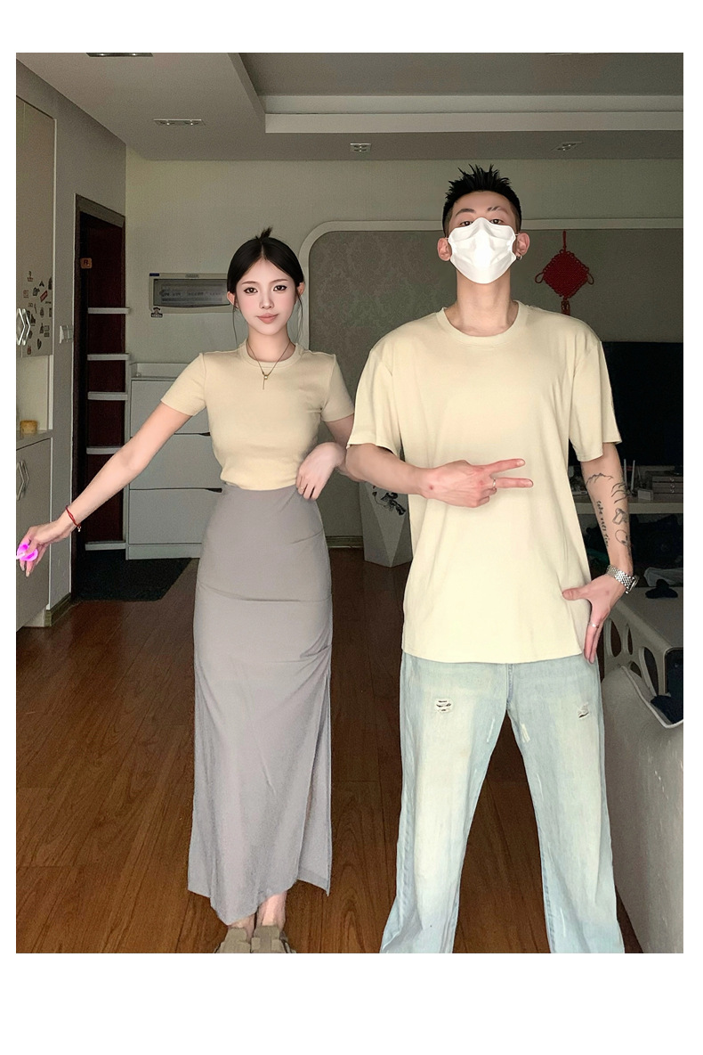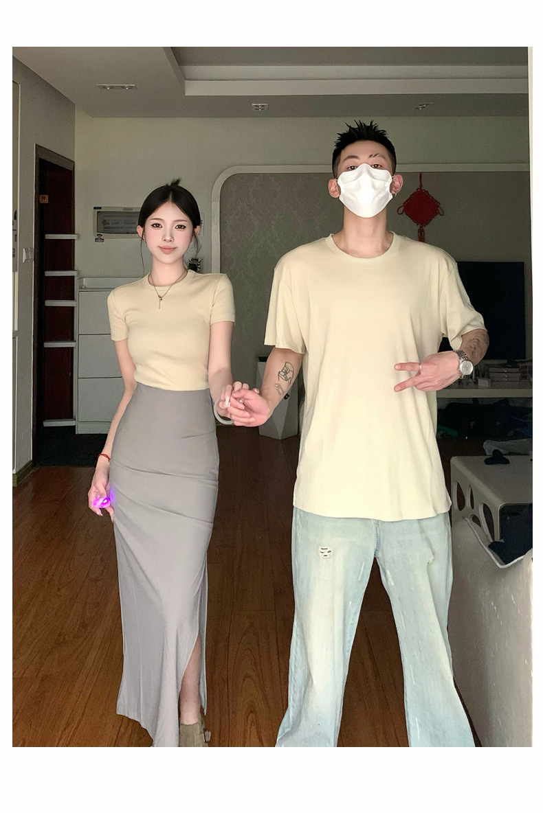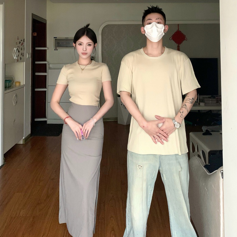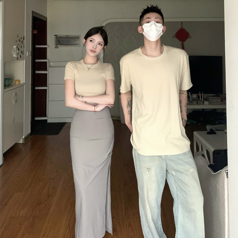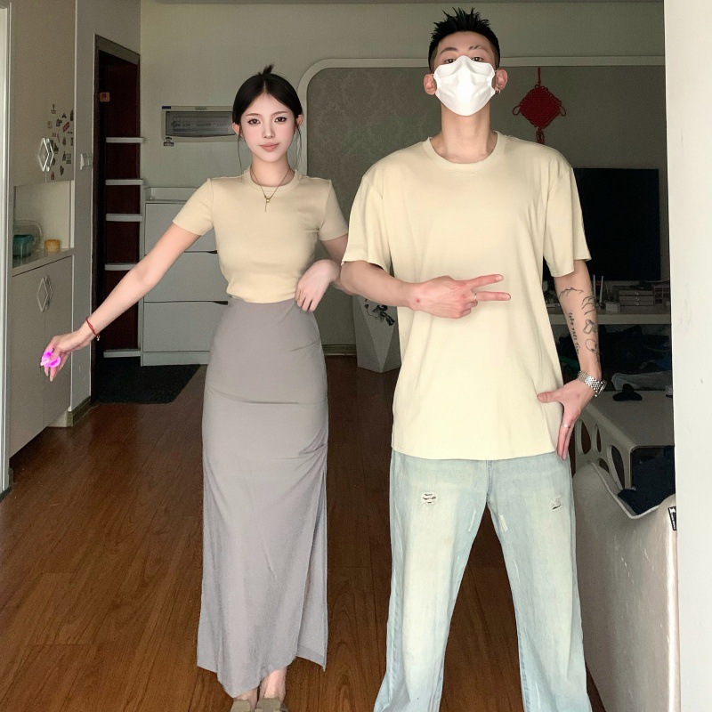 리얼 샷 여름 순수 커플 캐주얼 간단한 반팔 남자와 여자의 셔츠 스커트