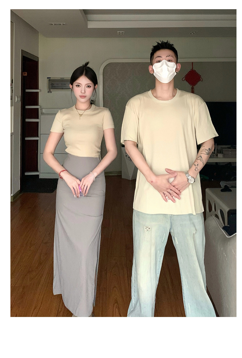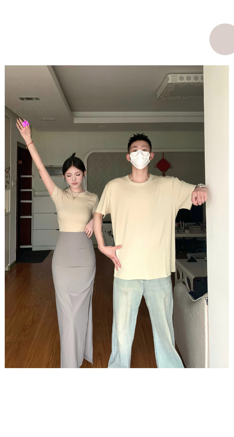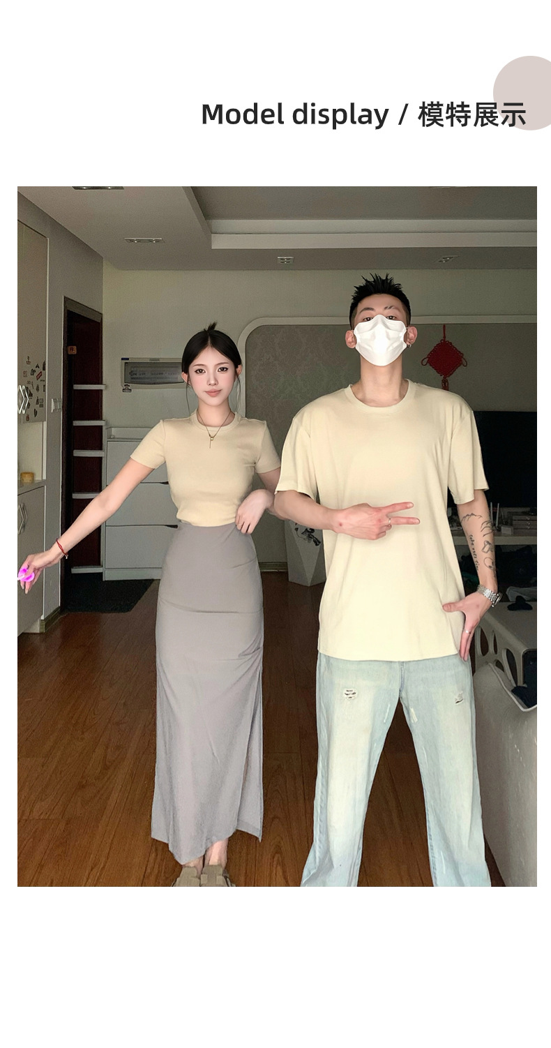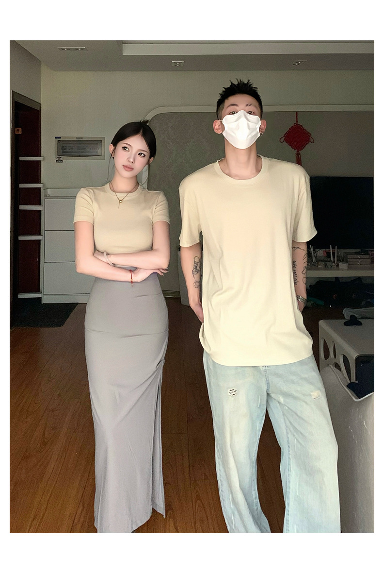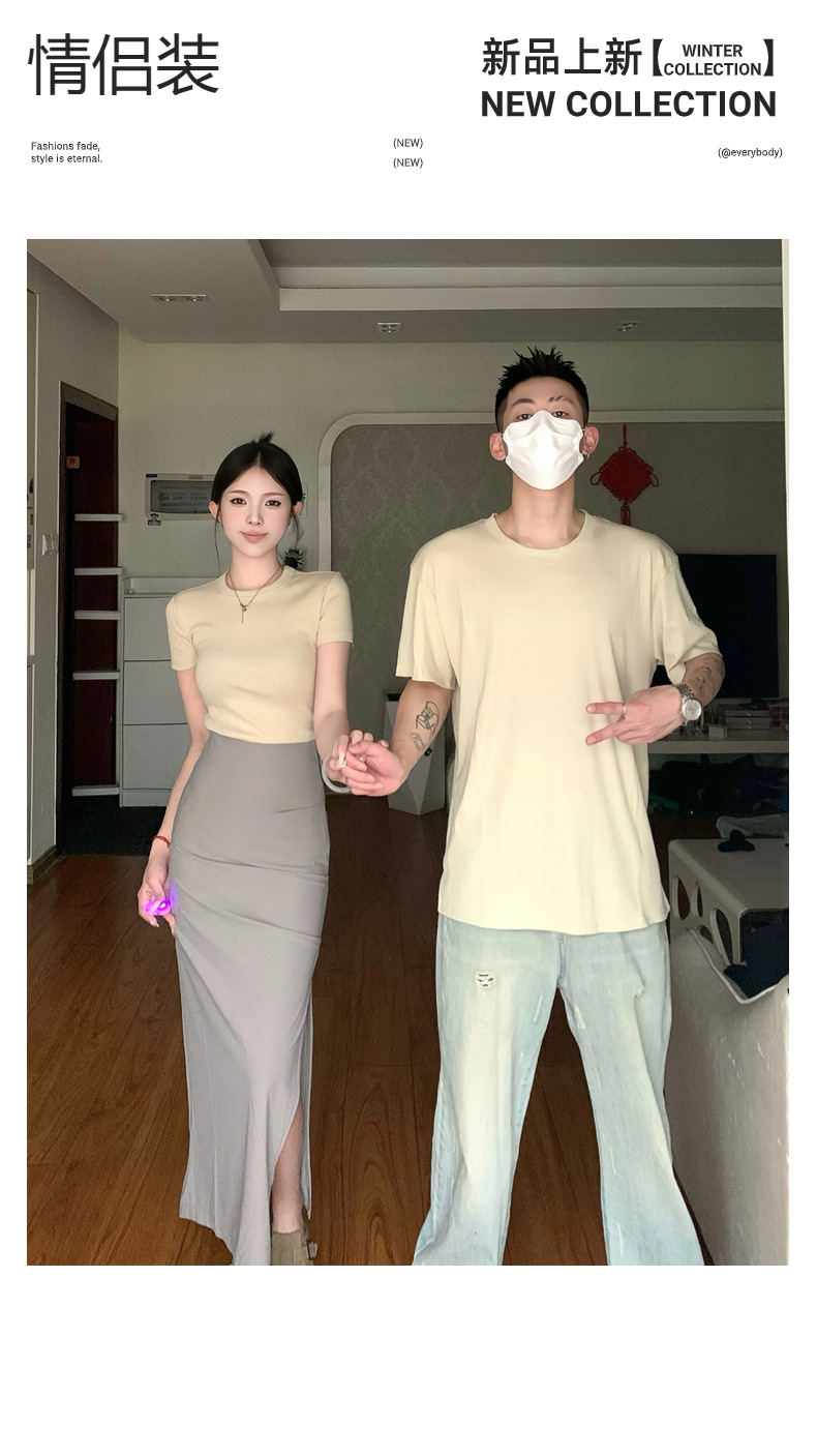 리얼 샷 여름 순수 커플 캐주얼 간단한 반팔 남자와 여자의 셔츠 스커트