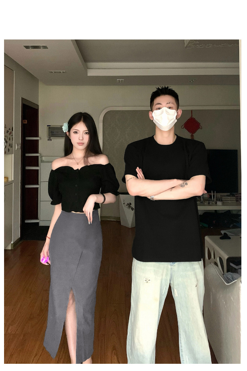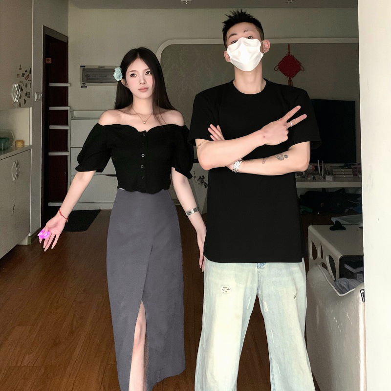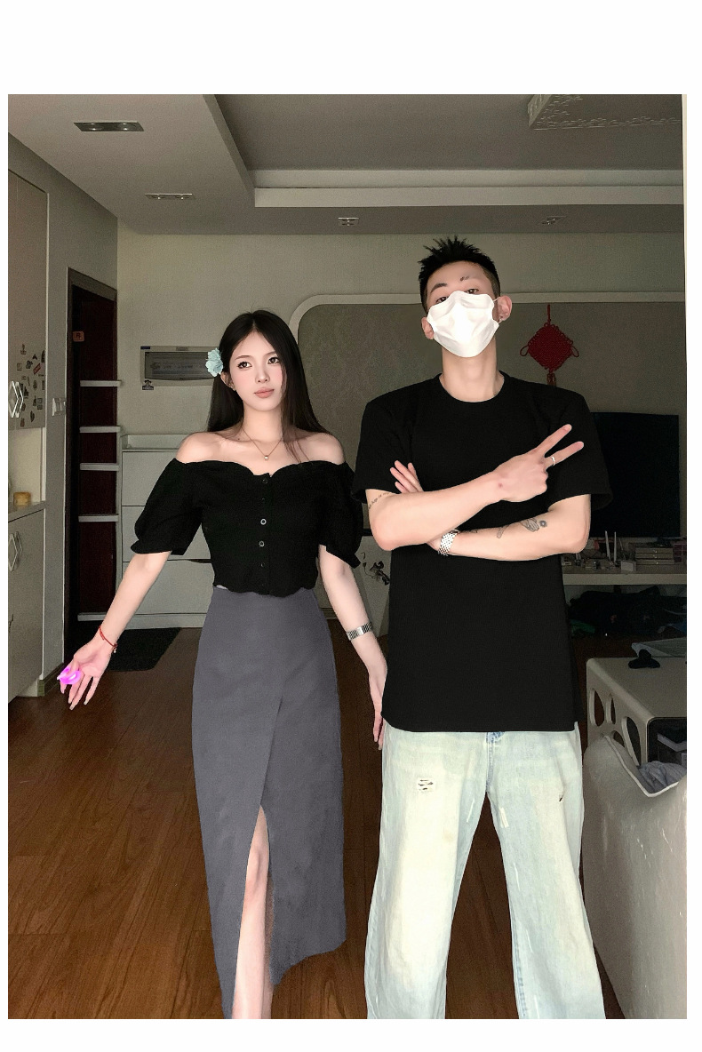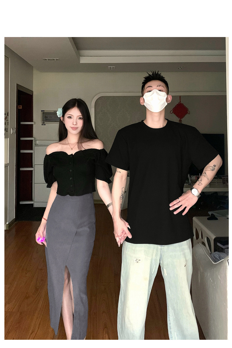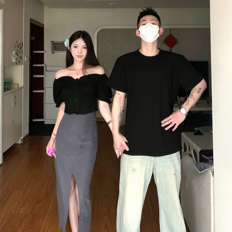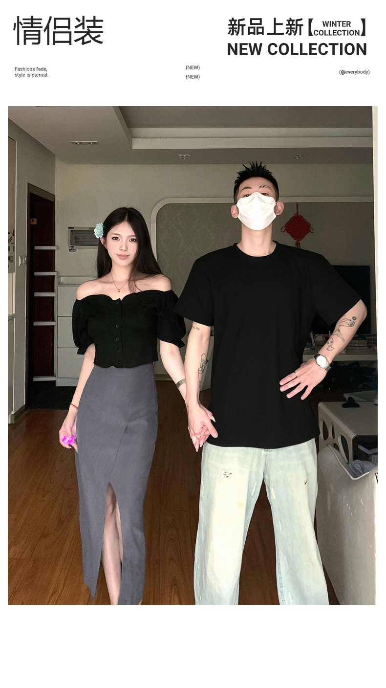 남성용 리얼 샷 커플의 블랙 반팔 짧은 섹시한 어깨 탑 셔츠스토어 가기