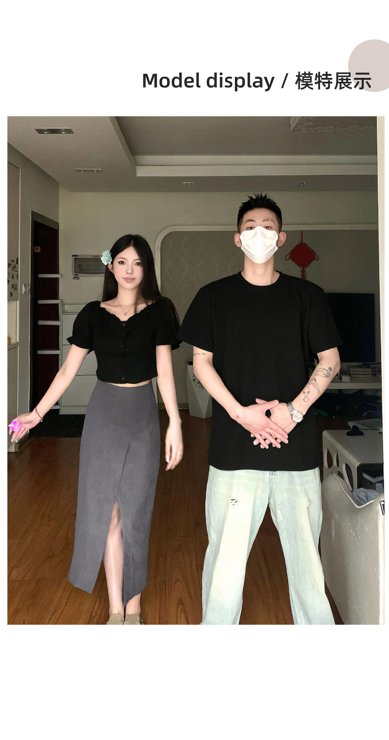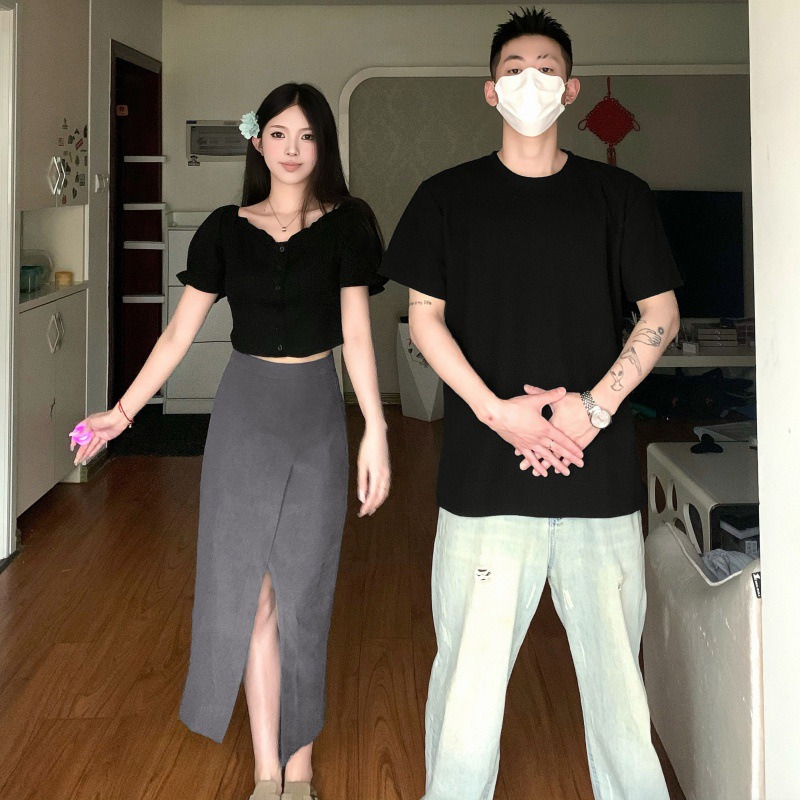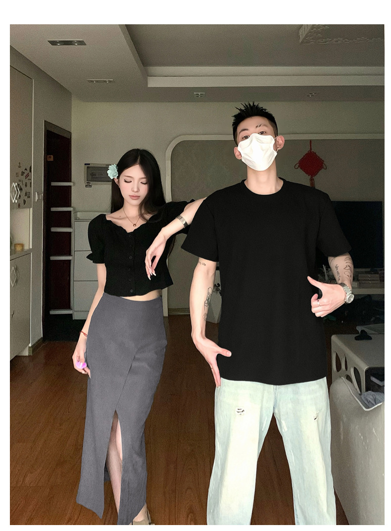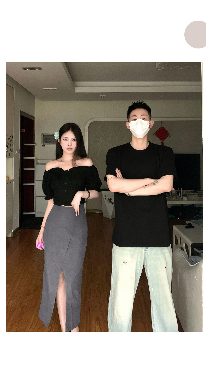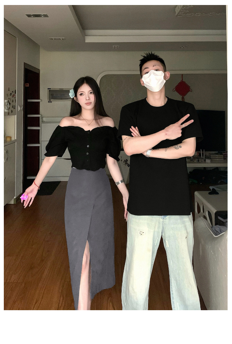 남성용 리얼 샷 커플의 블랙 반팔 짧은 섹시한 어깨 탑 셔츠스토어 가기