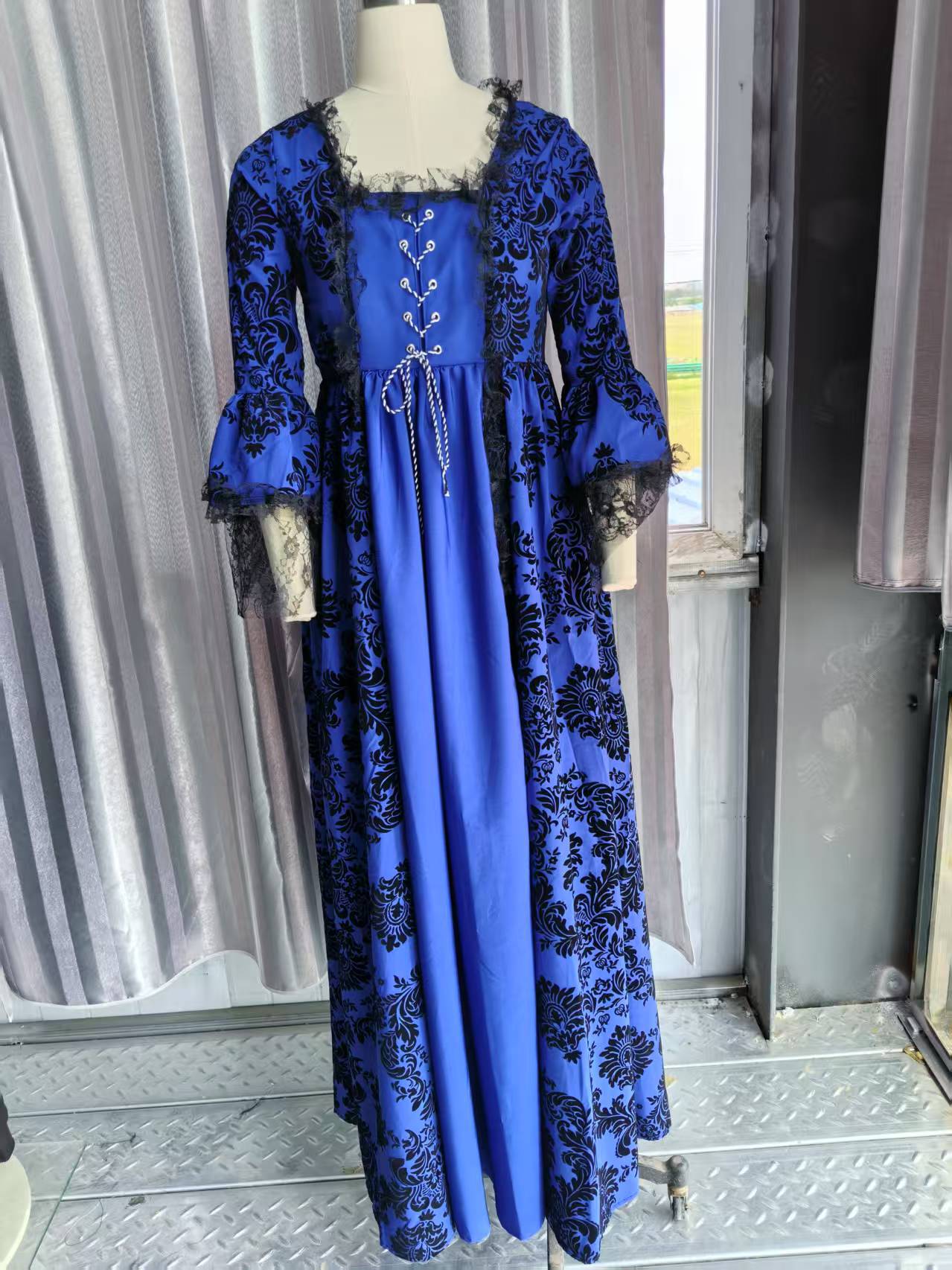 국경을 넘는 새로운 빈티지 궁전 원피스 인쇄 레이스 스티칭 대형 벨 슬리브 중세 원피스 아마존스토어 가기