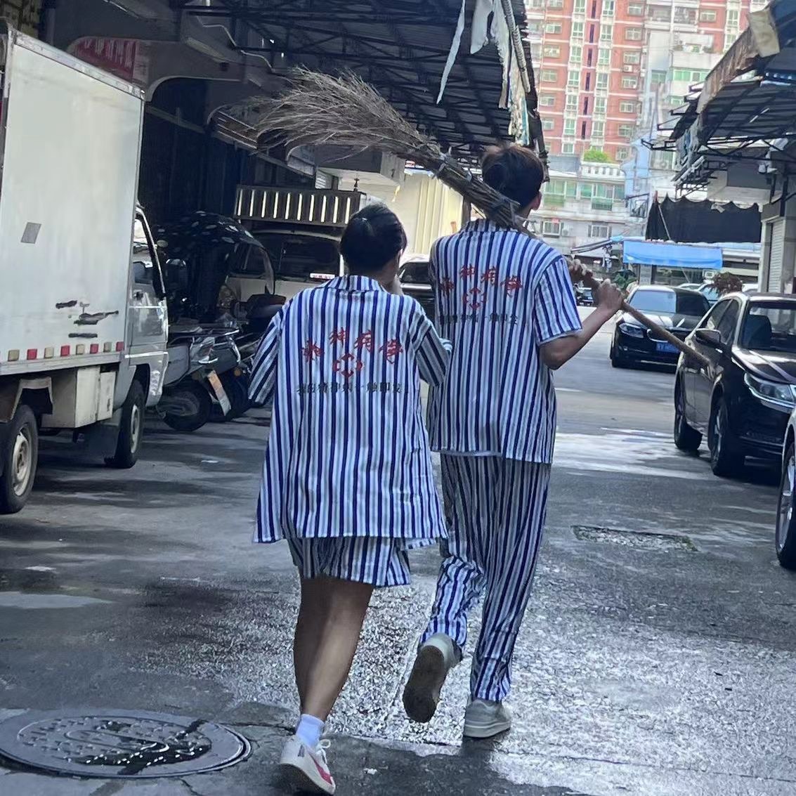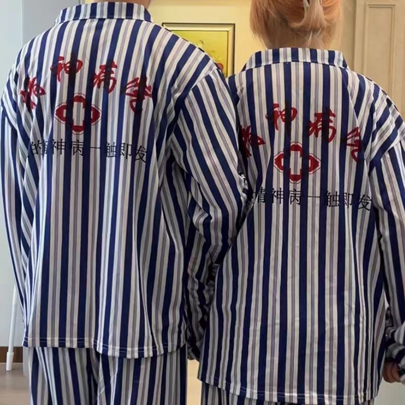 정신 병원 잠옷 남녀 커플 홈 재미 파자마 세트 홈 옷 봄과 여름 길고 짧은 소매 바지 반바지스토어 가기