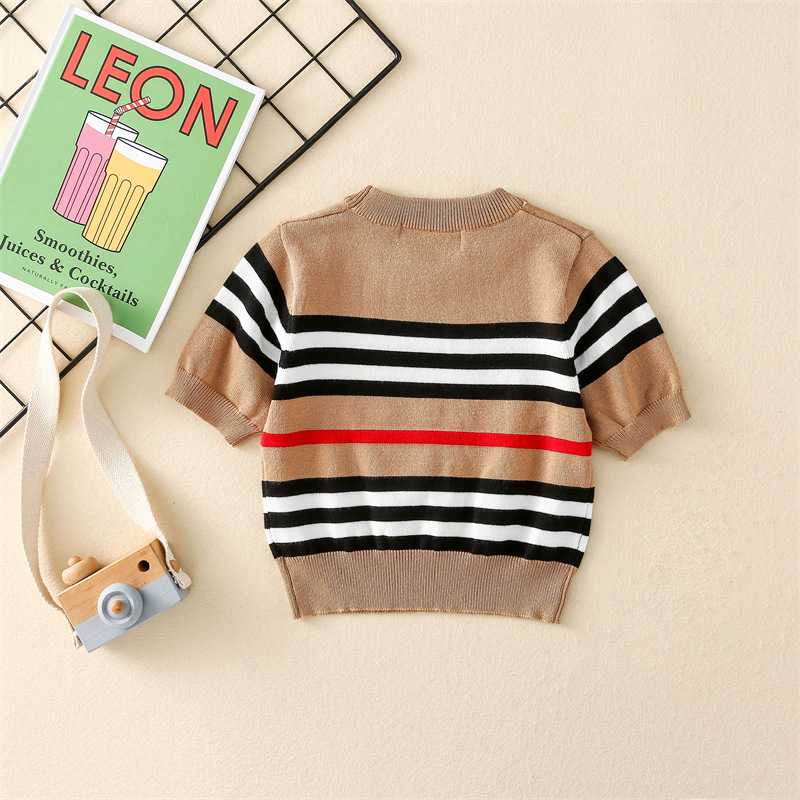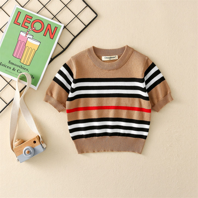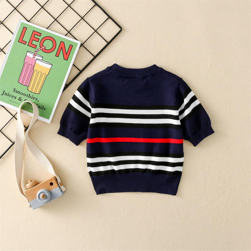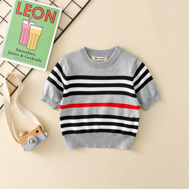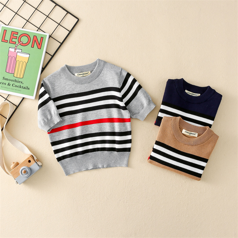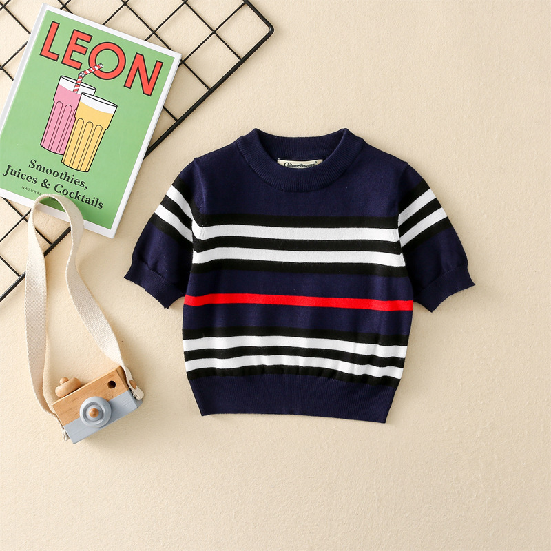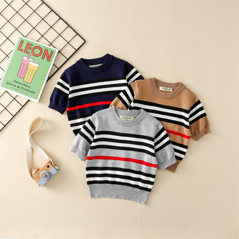 시의원 새 여름 반팔 니트웨어 어린이 크루 넥 스트라이프 풀오버 패셔블 올매치 베이스 셔츠