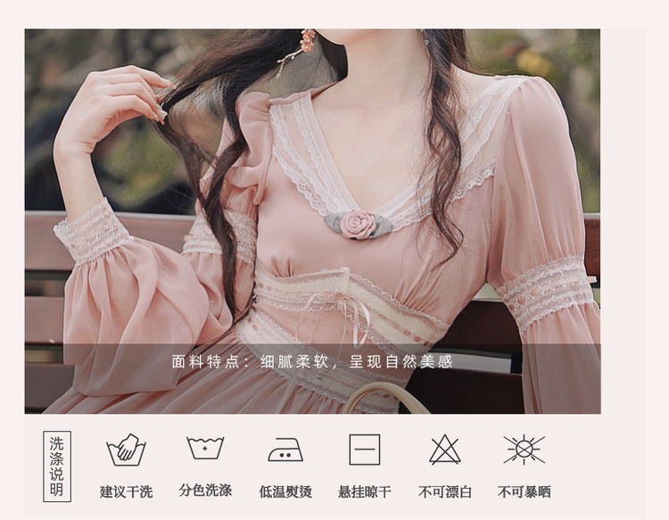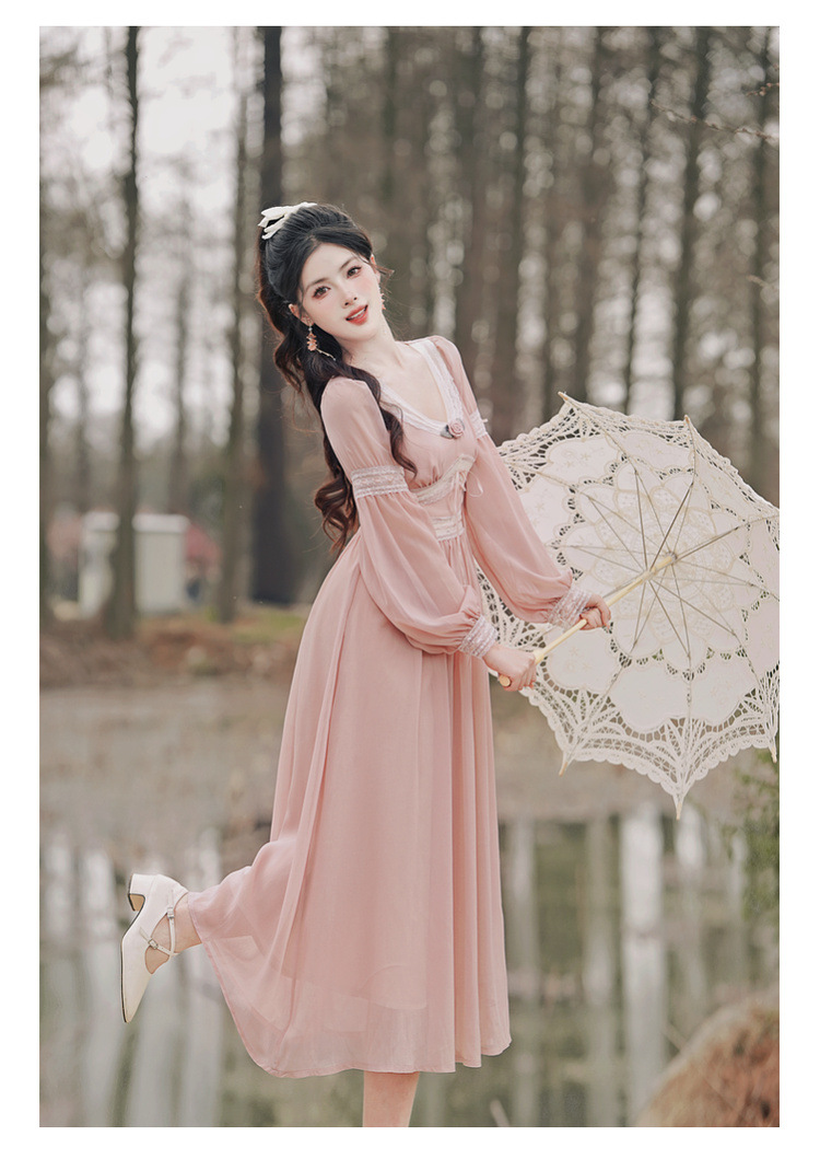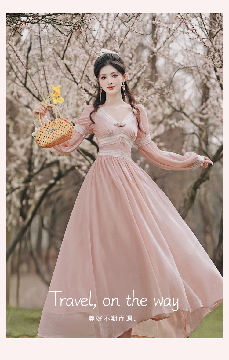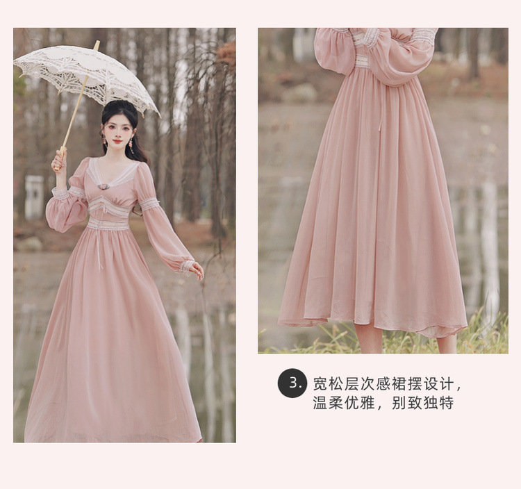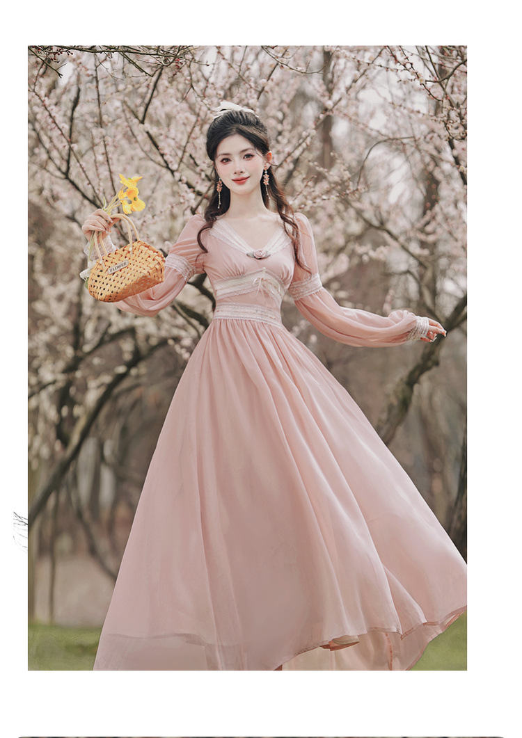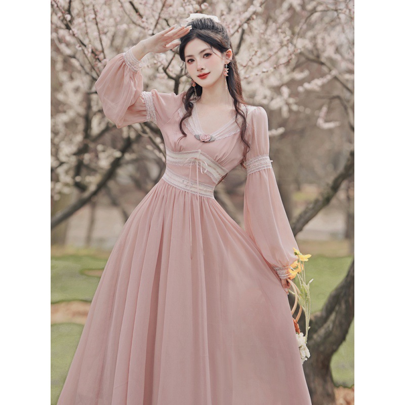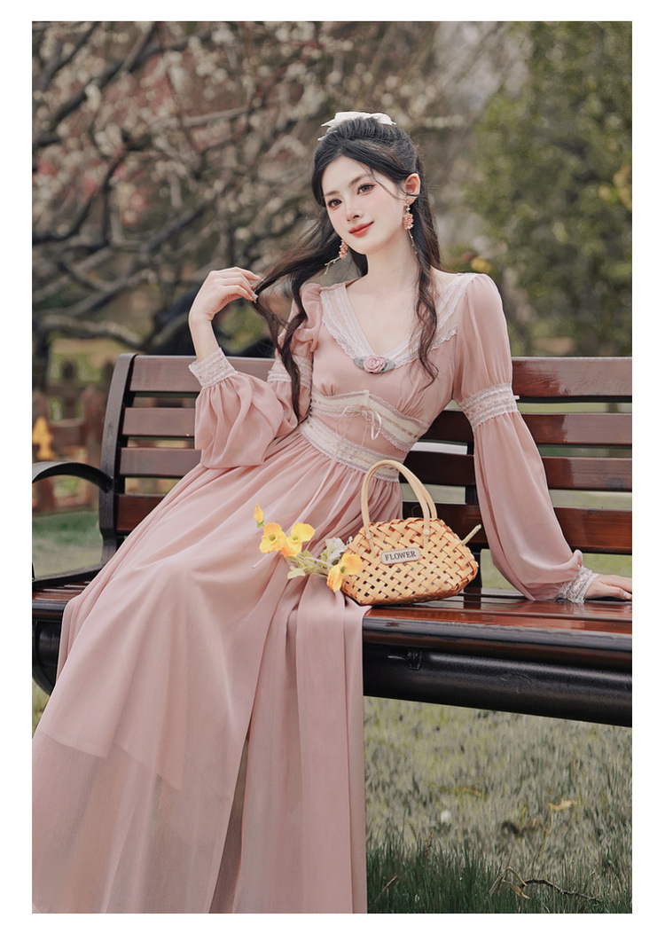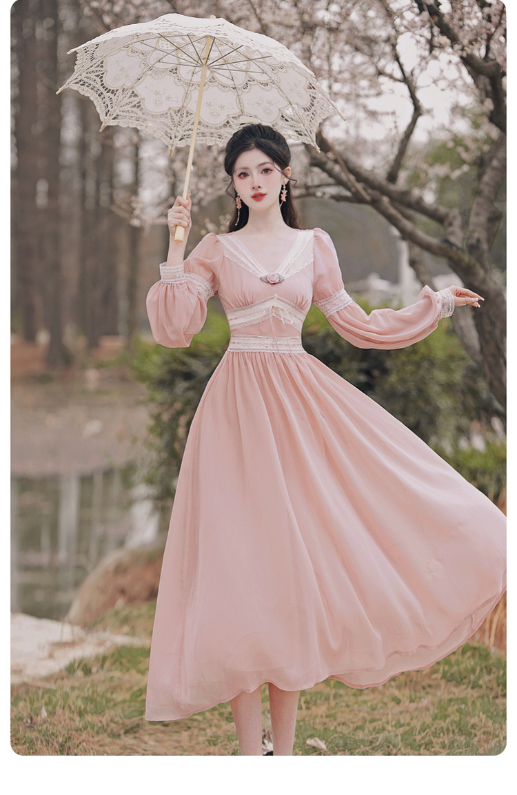 6833 # 진짜 샷 스팟 기질 달콤한 쉬폰 레이스 스티칭 꽃 V 넥 긴 소매 원피스 선반 40