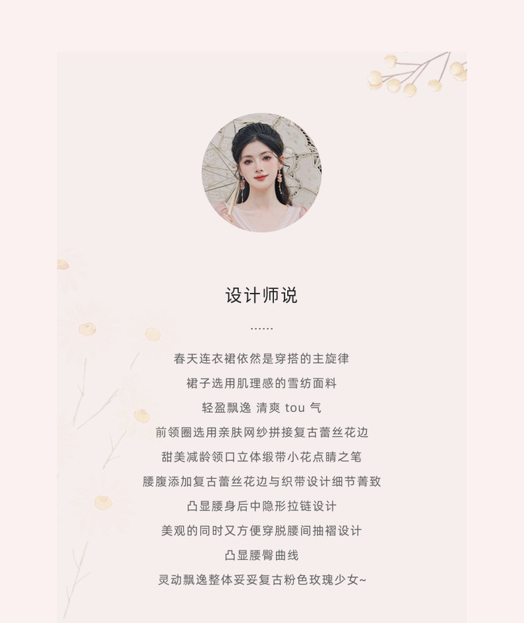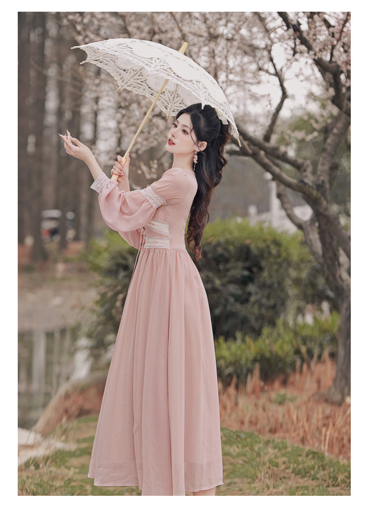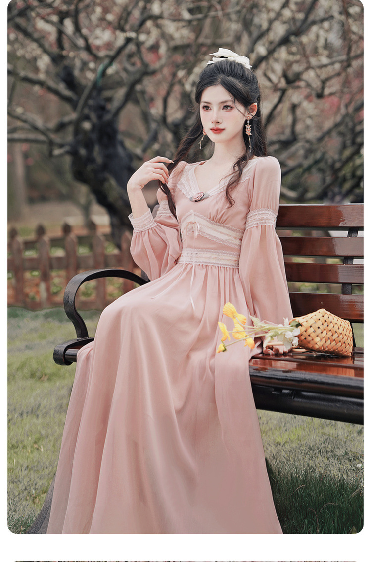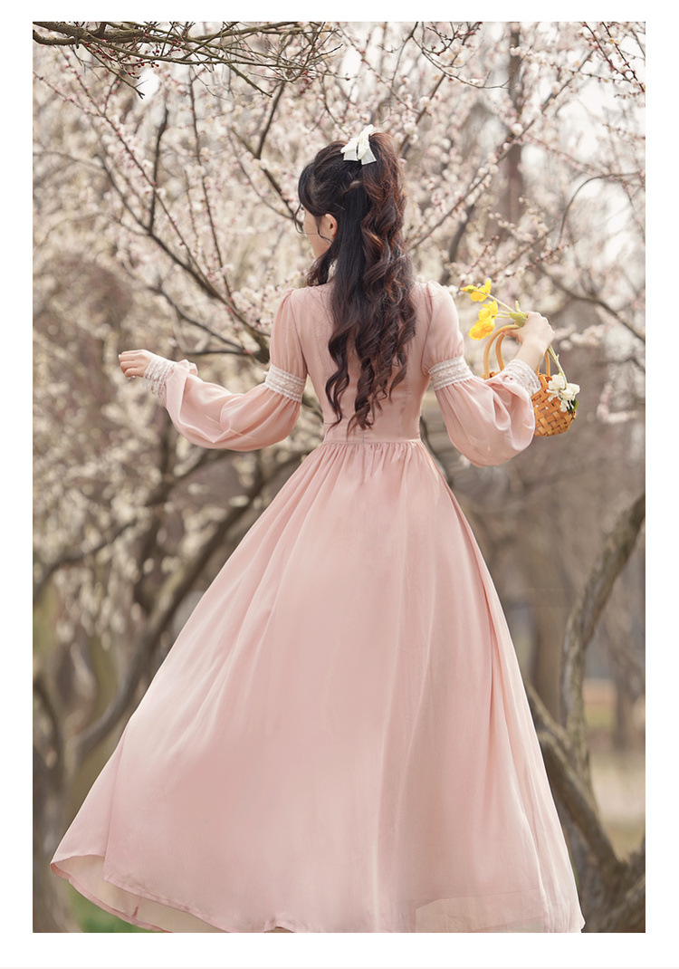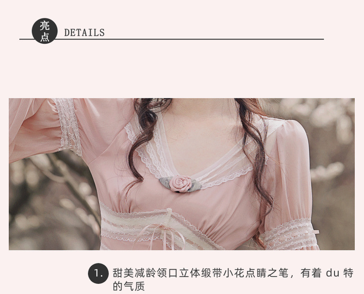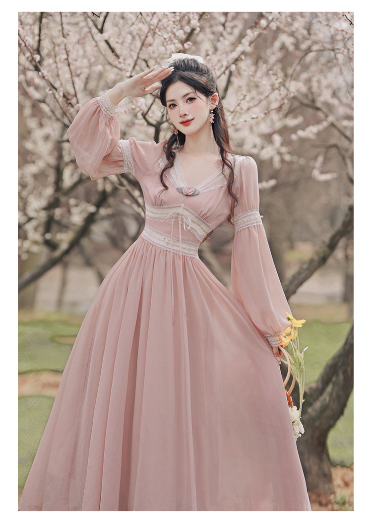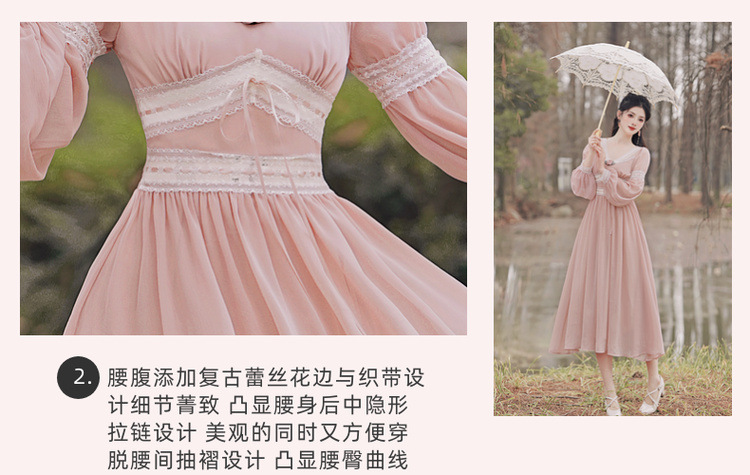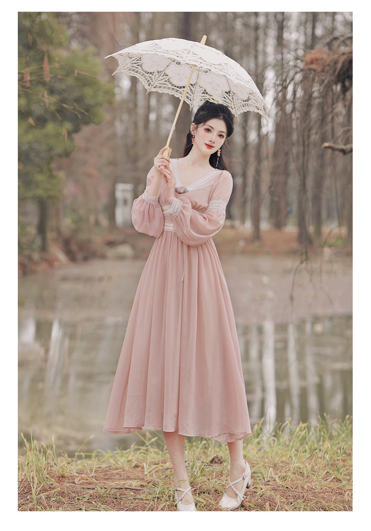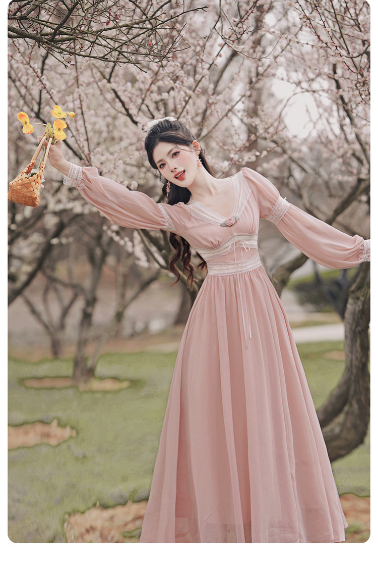 6833 # 진짜 샷 스팟 기질 달콤한 쉬폰 레이스 스티칭 꽃 V 넥 긴 소매 원피스 선반 40