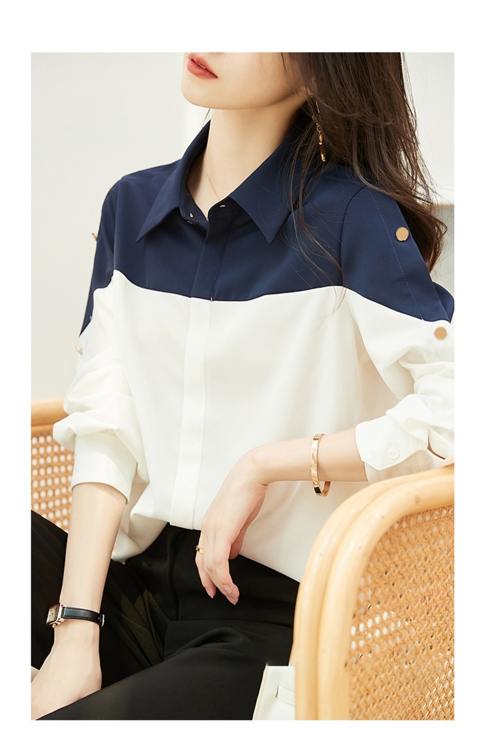 이른 봄 새로운 색상 대비 간단한 편안한 올 매치 슬림 핏 바느질 긴팔 쉬폰 셔츠 느슨한 폴로 칼라 탑