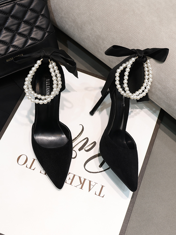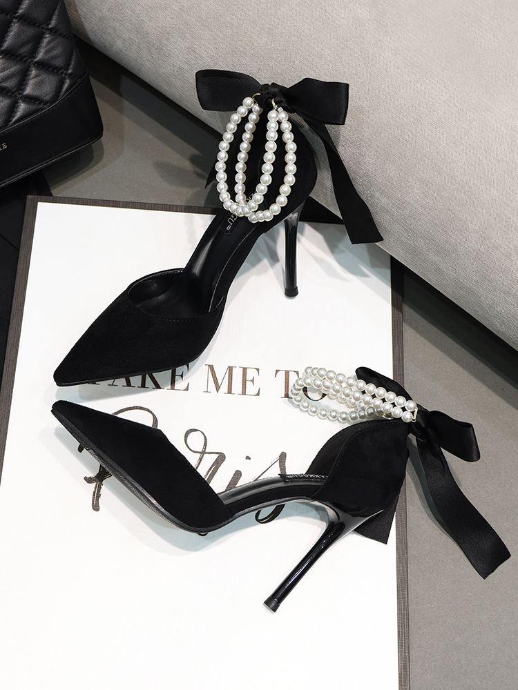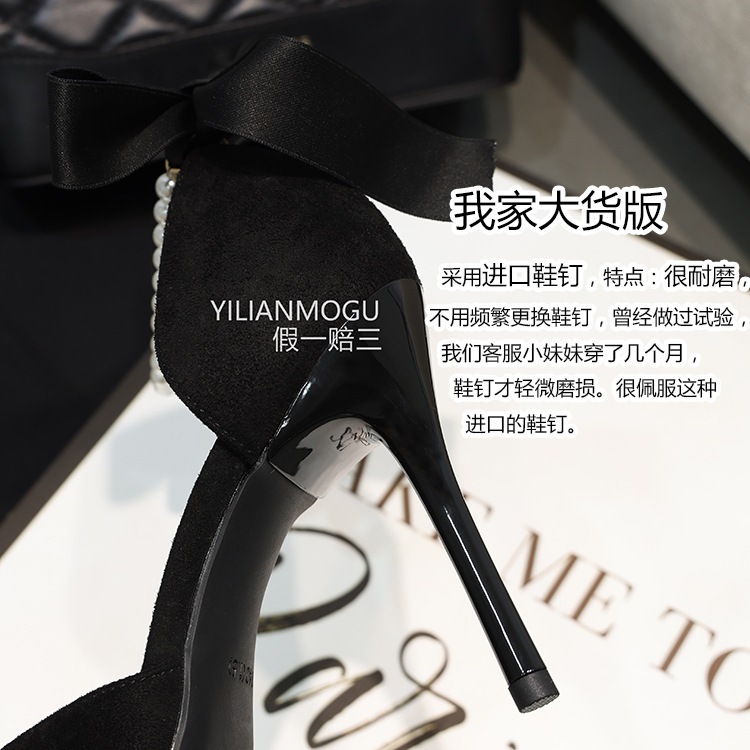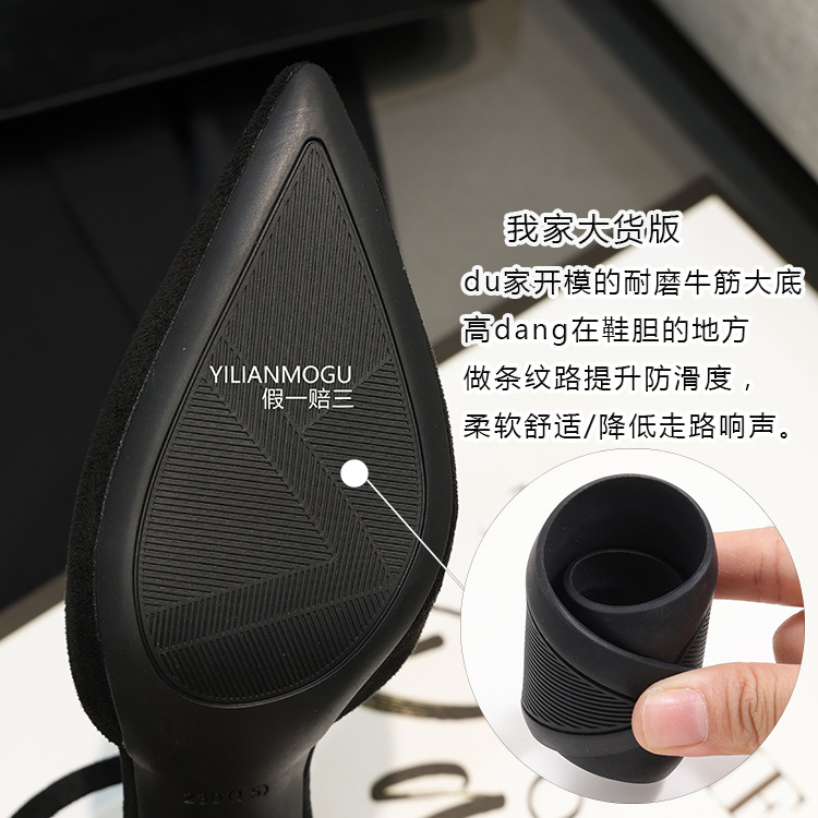 2024 새로운 봄 검은 뾰족한 스틸레토 힐 신발 여성 패션 활 한 단어 버클 샌들 도매스토어 가기