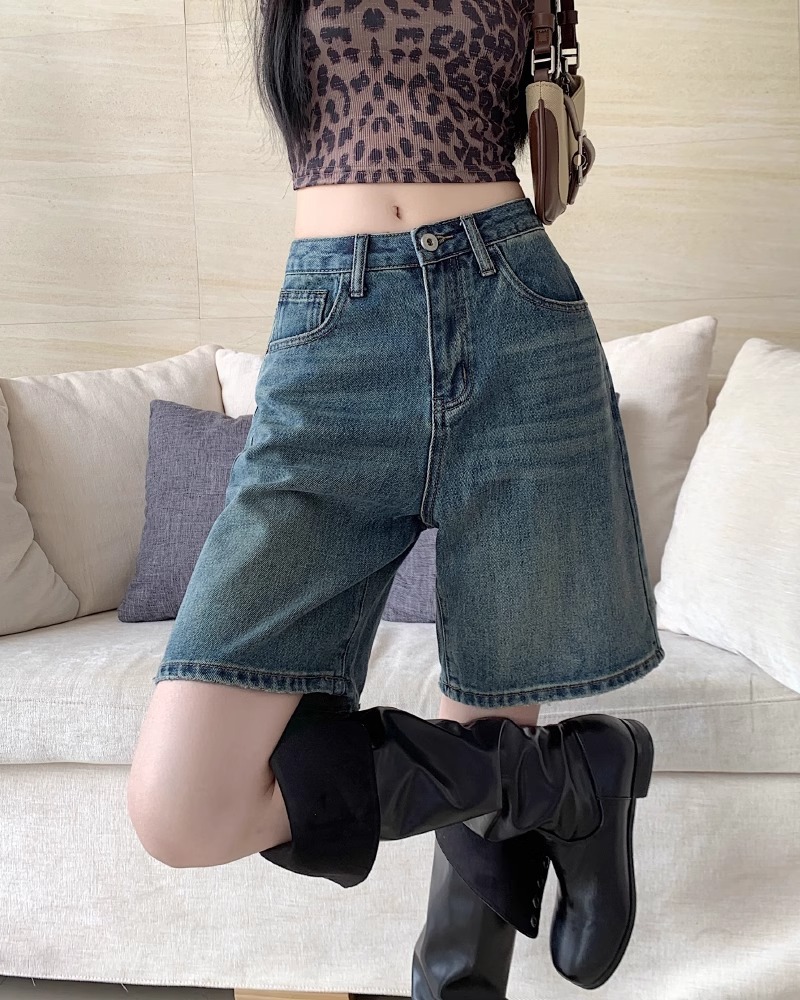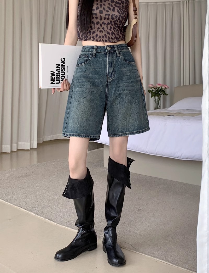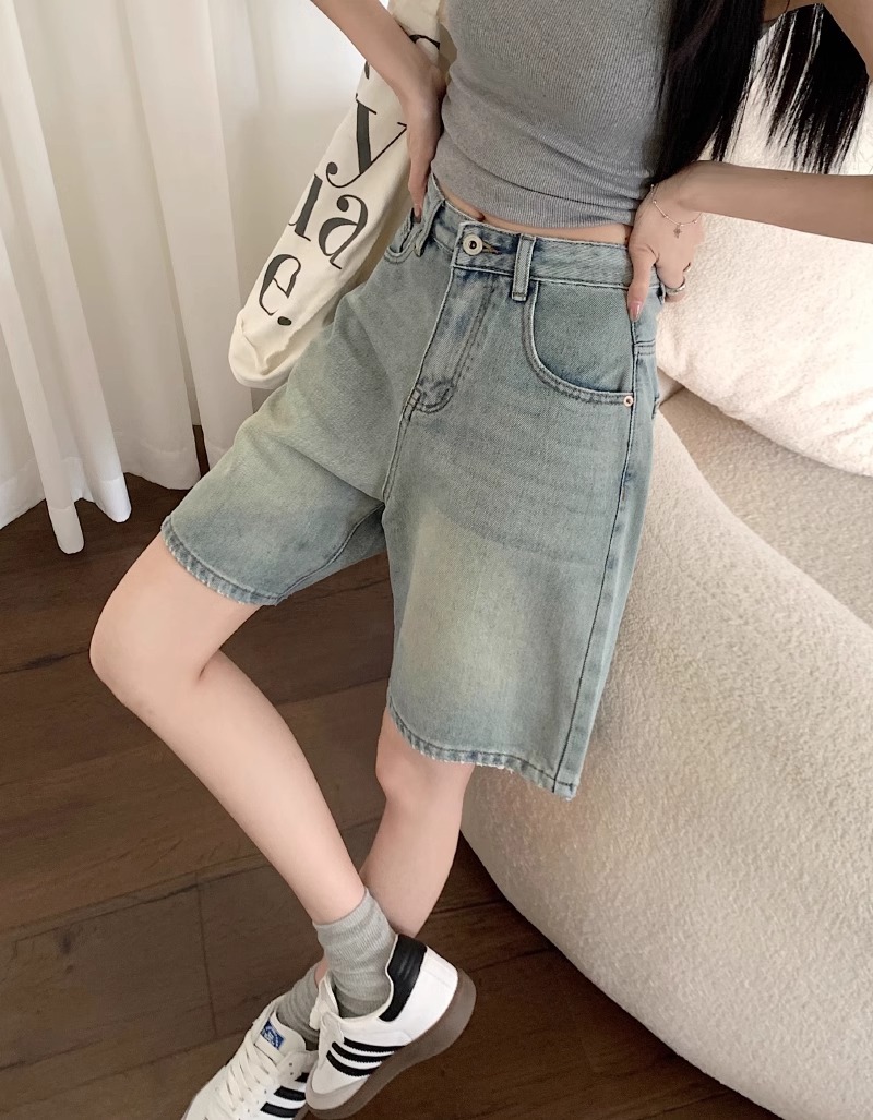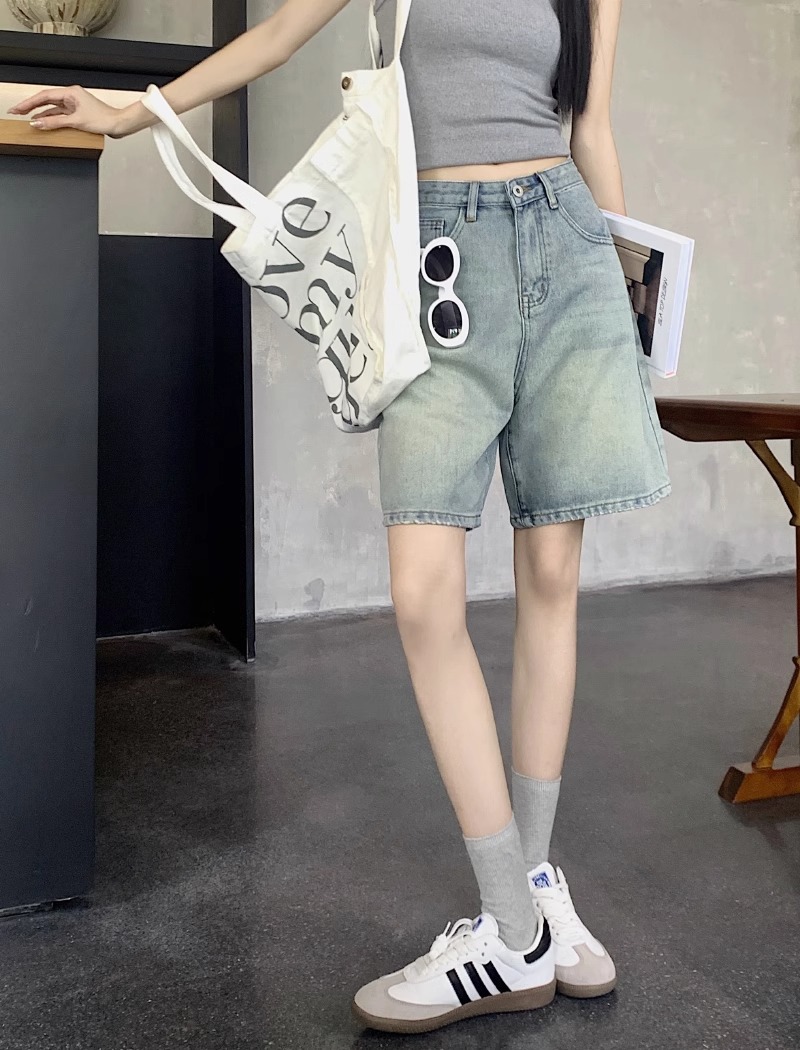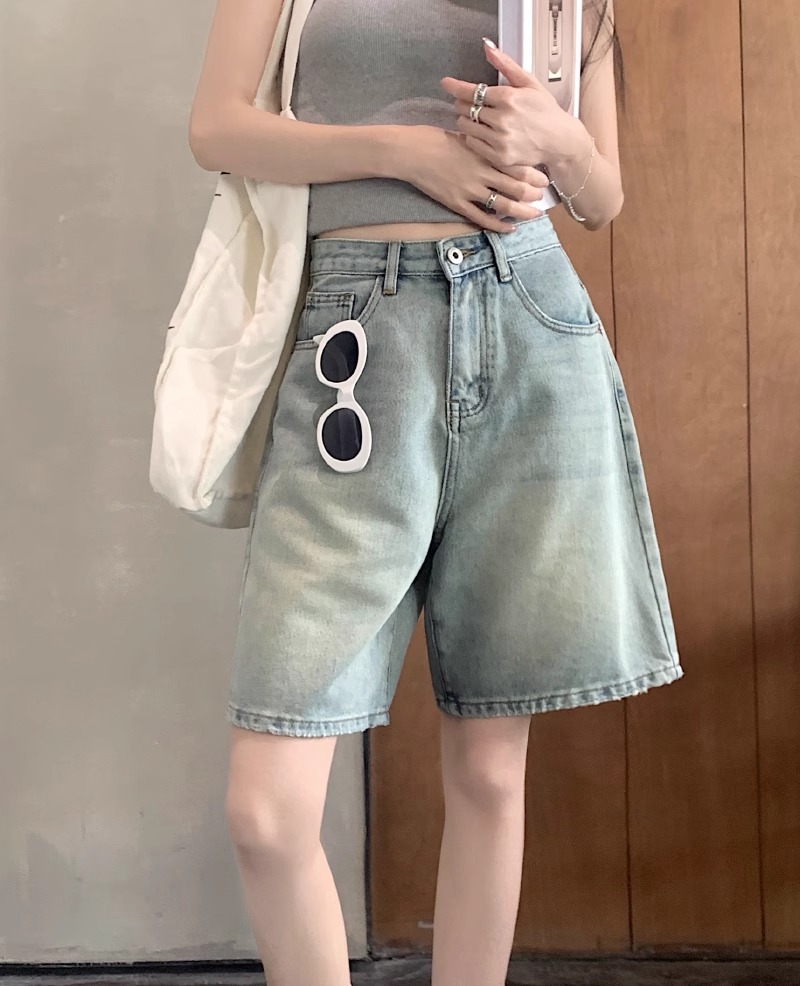 빈티지 데님 반바지 여자 여름 2024 새로운 높은 허리 느슨한 슬리밍 모든 경기 바지 넓은 다리 스트레이트 다리 바지스토어 가기