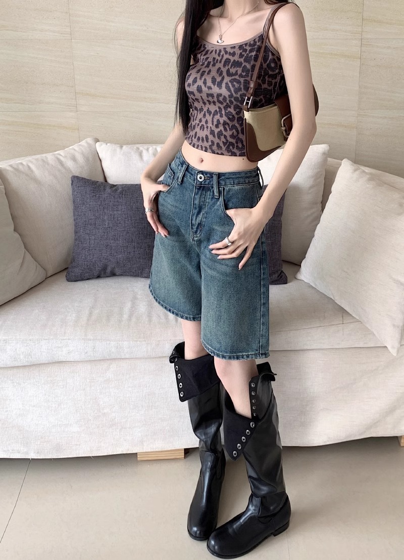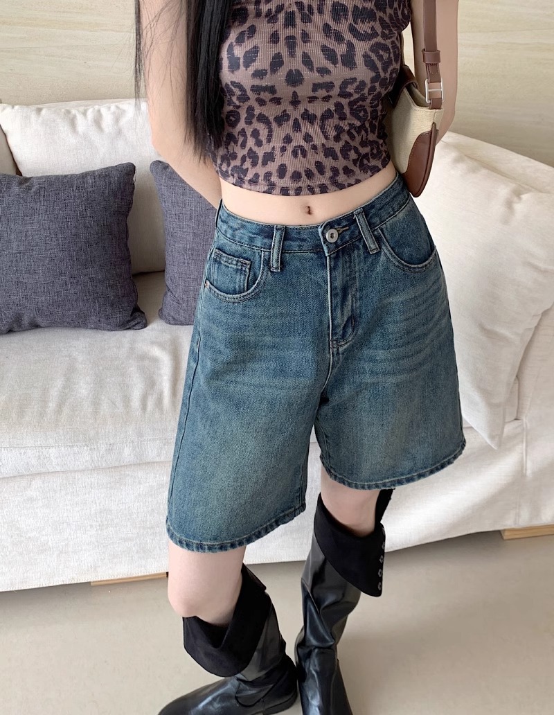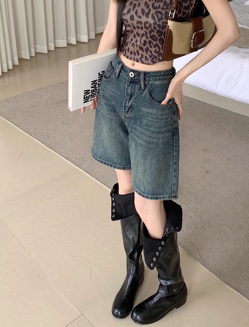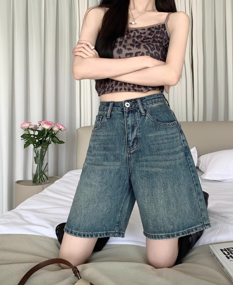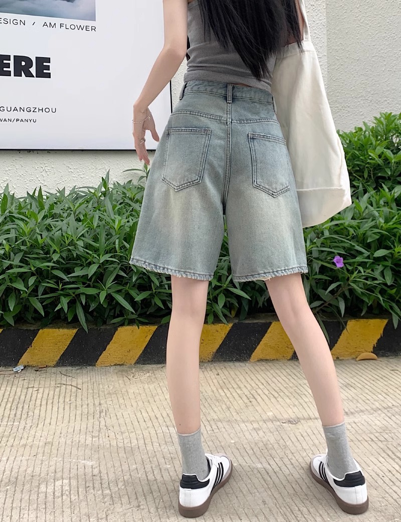 빈티지 데님 반바지 여자 여름 2024 새로운 높은 허리 느슨한 슬리밍 모든 경기 바지 넓은 다리 스트레이트 다리 바지스토어 가기