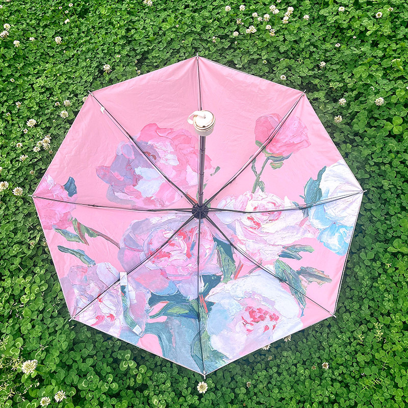 블랙 글로시 자외선 차단 여성용 우산, 자외선 차단, 핑크색 모란 접이식 우산, 비와 햇빛 모두 사용 가능, UPF50+