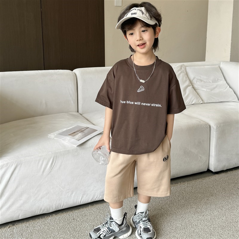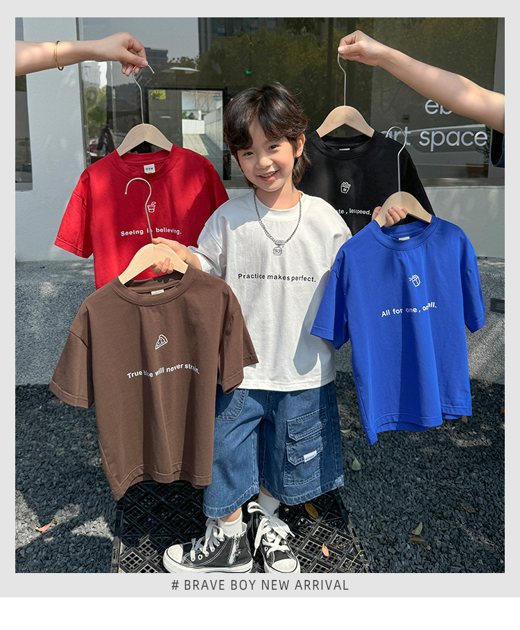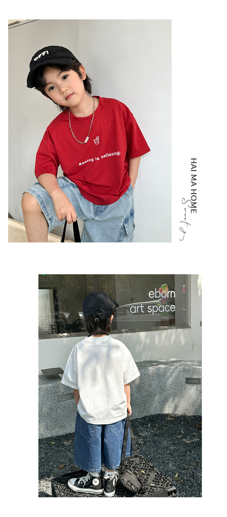 소년 다목적 단색 문자 스타일 순수 면화 반팔 티셔츠 2025 여름 새로운 스타일 어린이 Haima 가족 아동 의류 트렌드스토어 가기