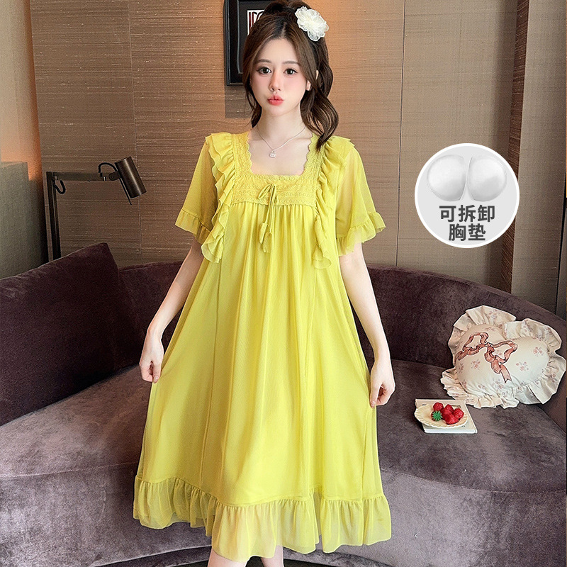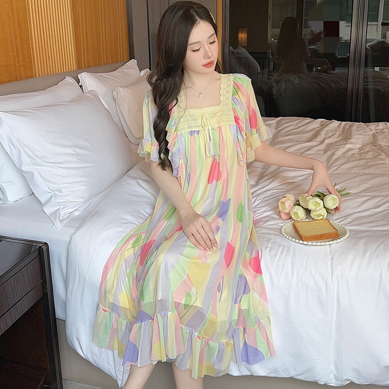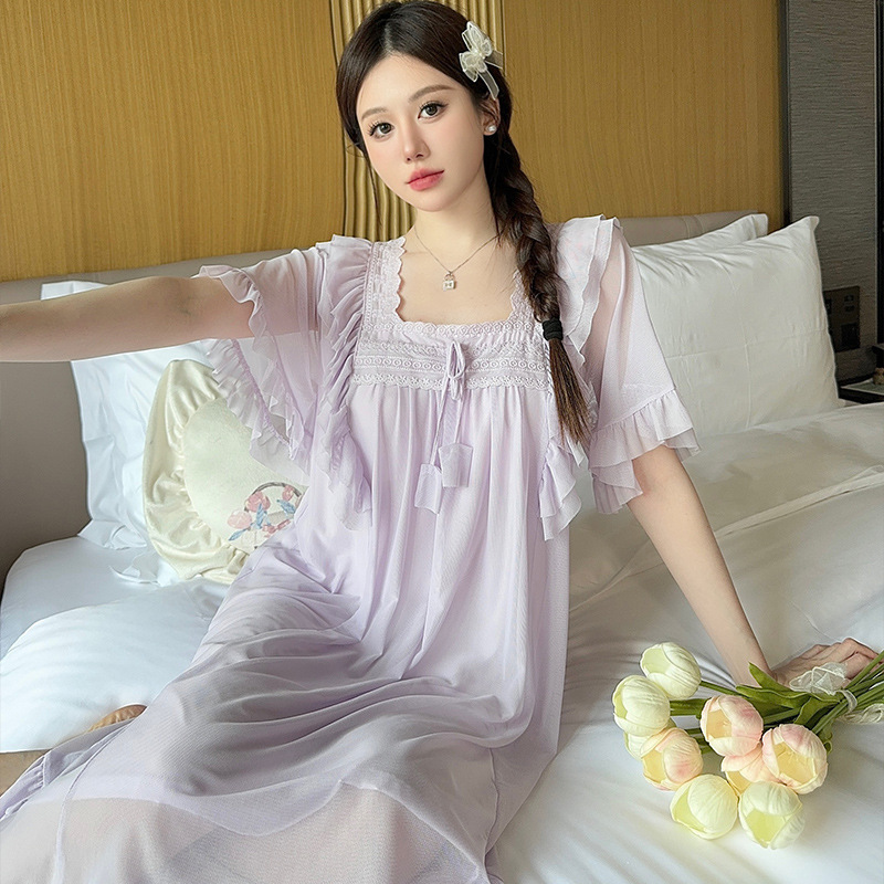 링 레이 여름 솔리드 컬러 레이스 보우 메쉬 팰리스 프린세스 스타일 롱 파자마 홈 의류 여성스토어 가기