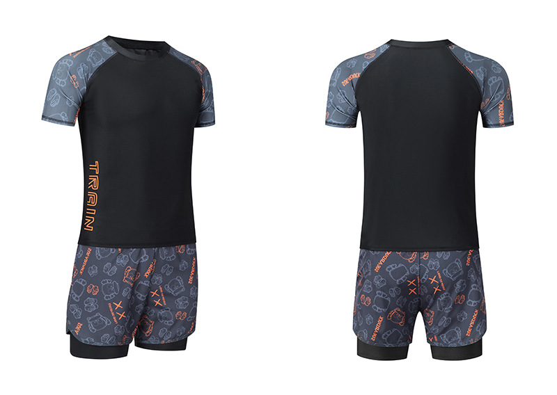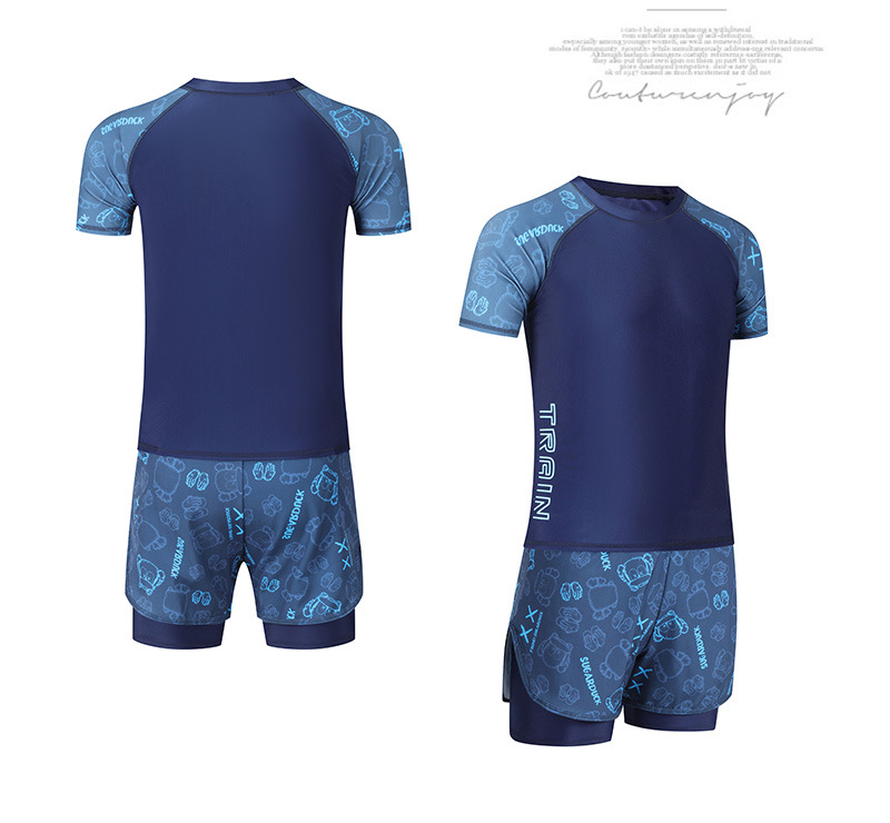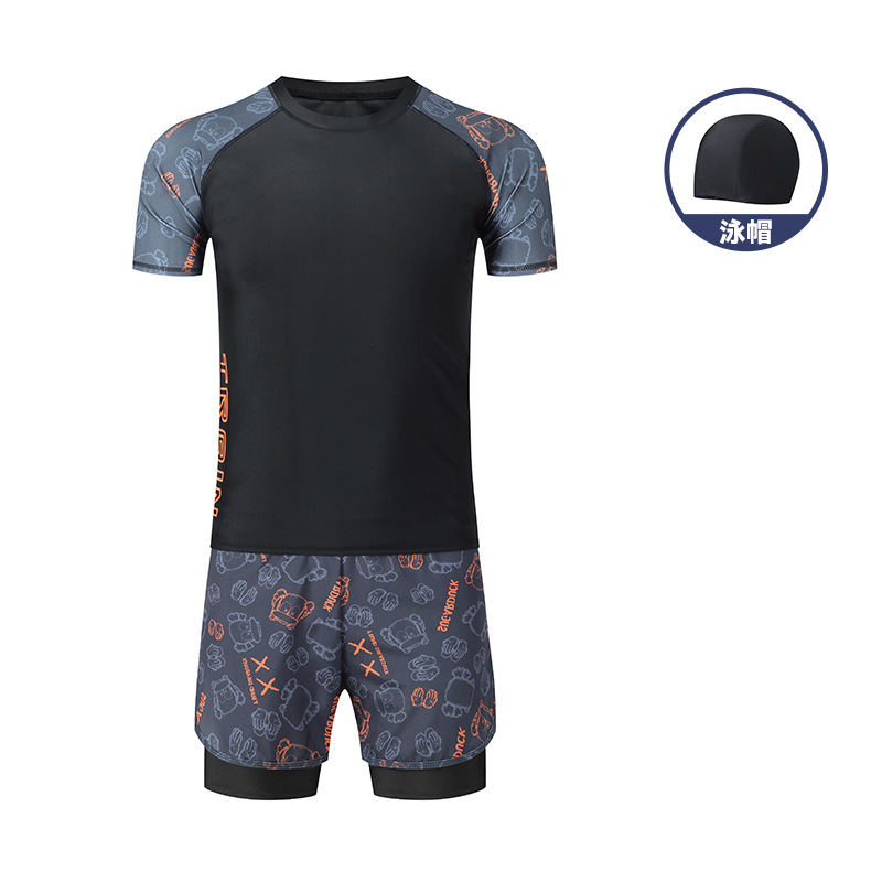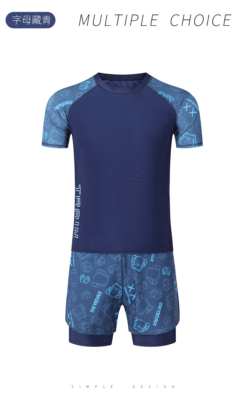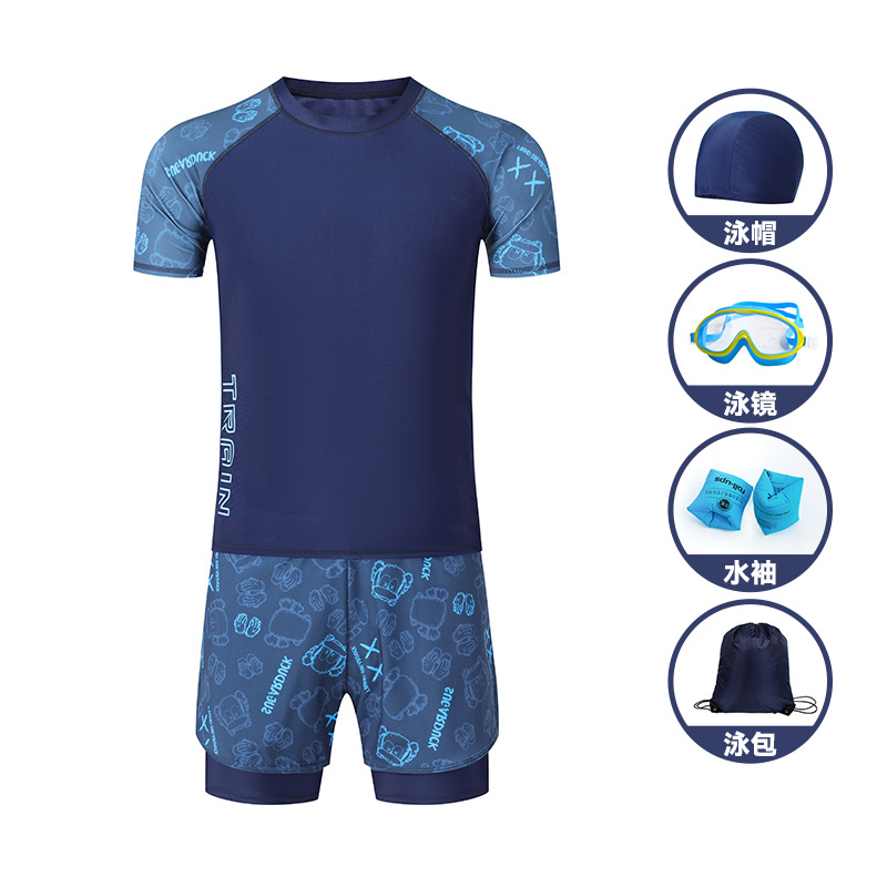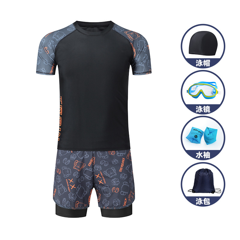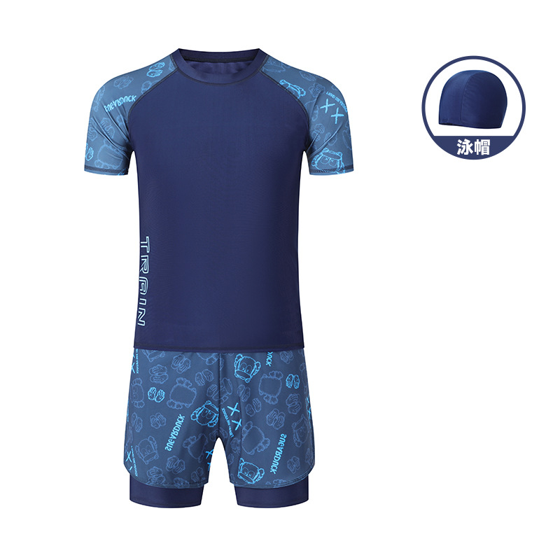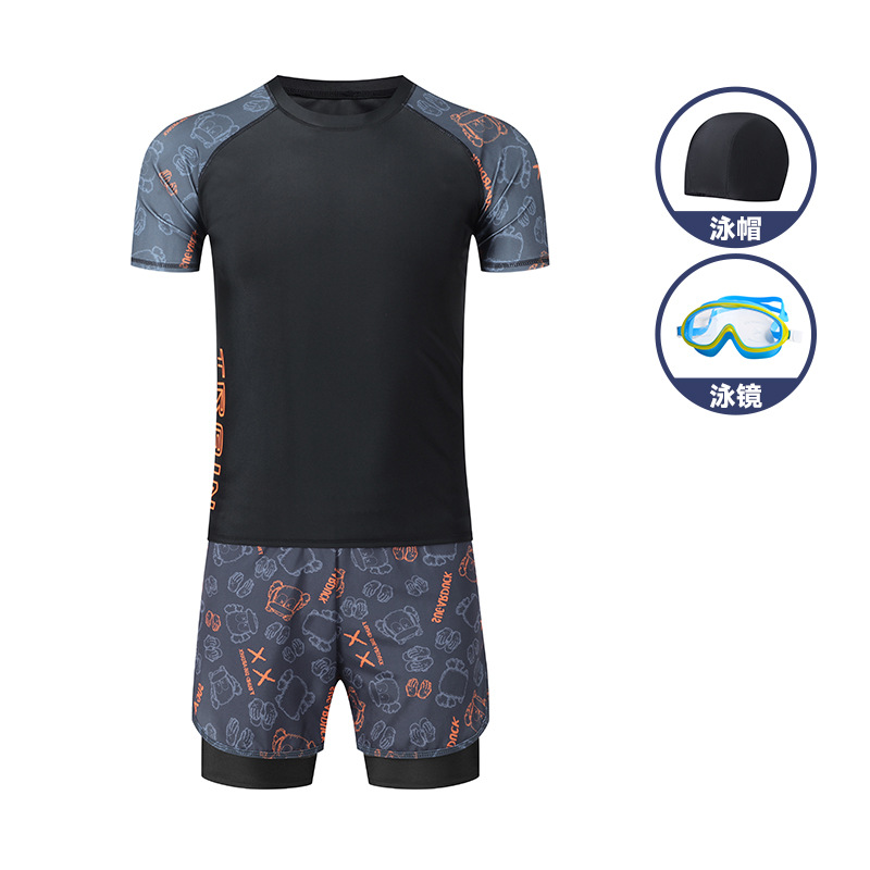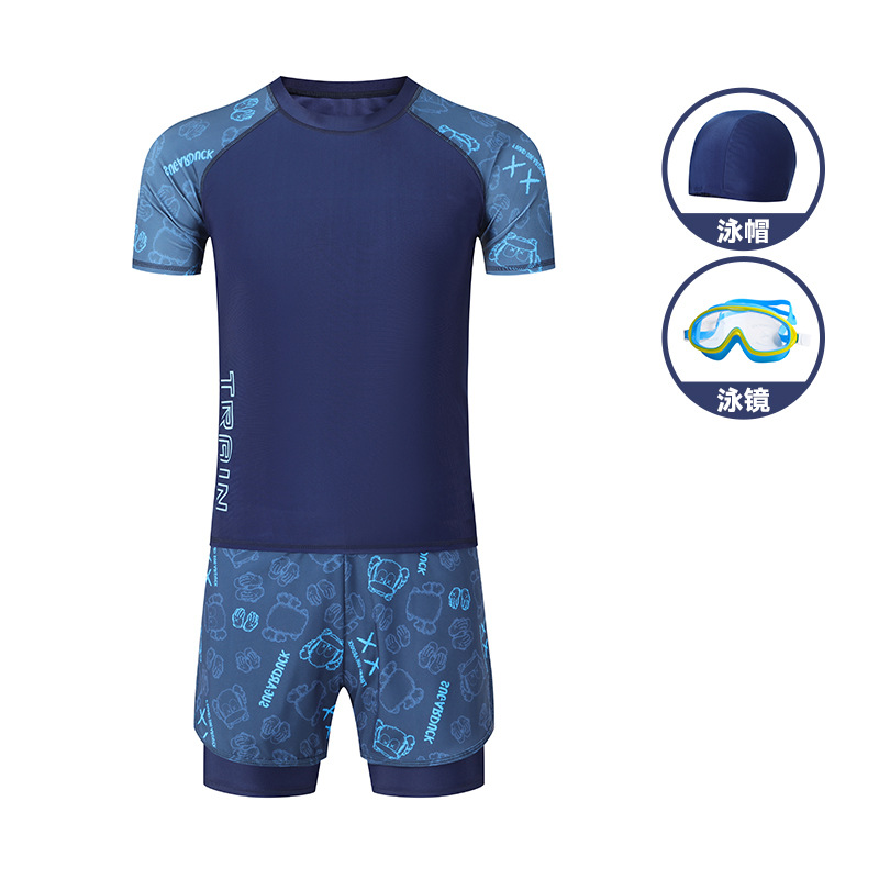 跨境速干小中大童儿童泳衣 卡通印花短袖分体三件套装男童游泳衣
