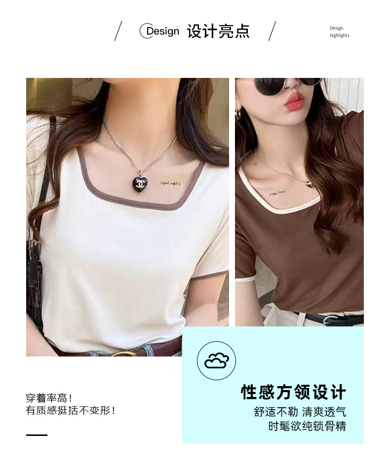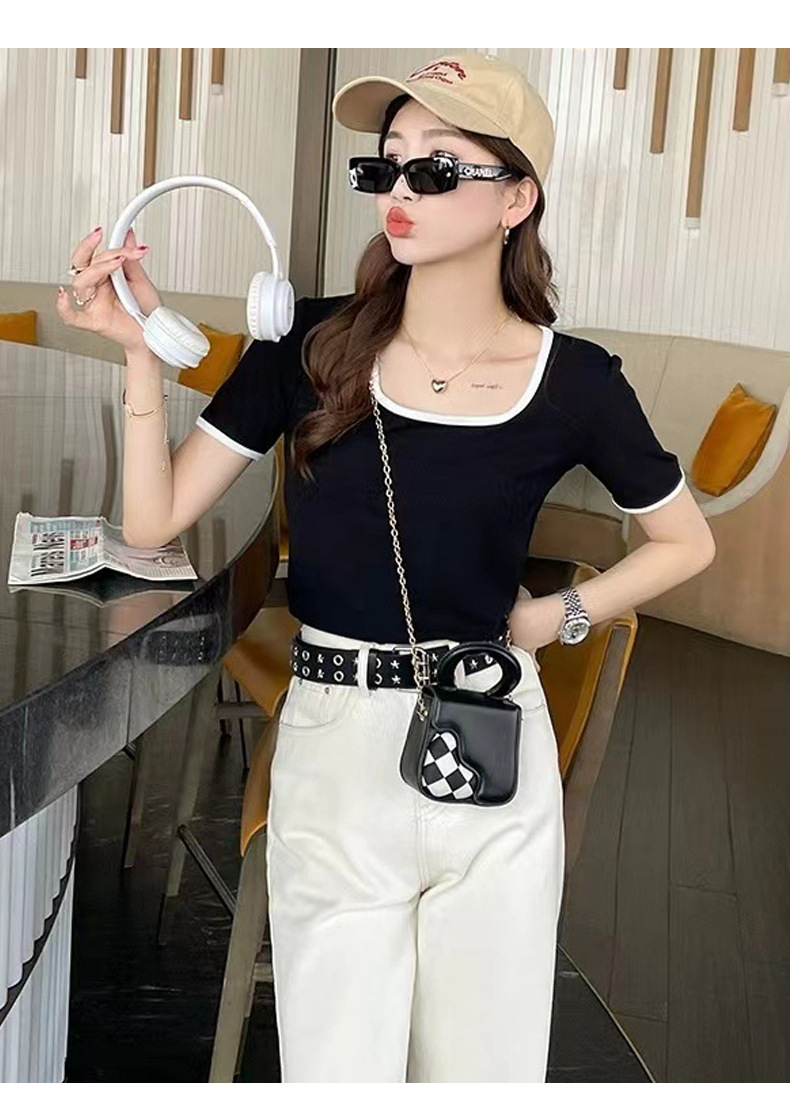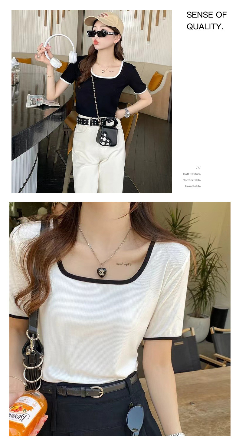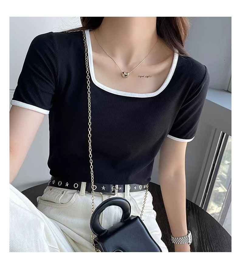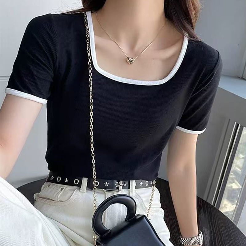 새로운 대비 색상 사각형 칼라 반팔 여성 티셔츠 대형 슬림 슬림 바닥 셔츠 탑 여성 여름 하이 엔드 감각