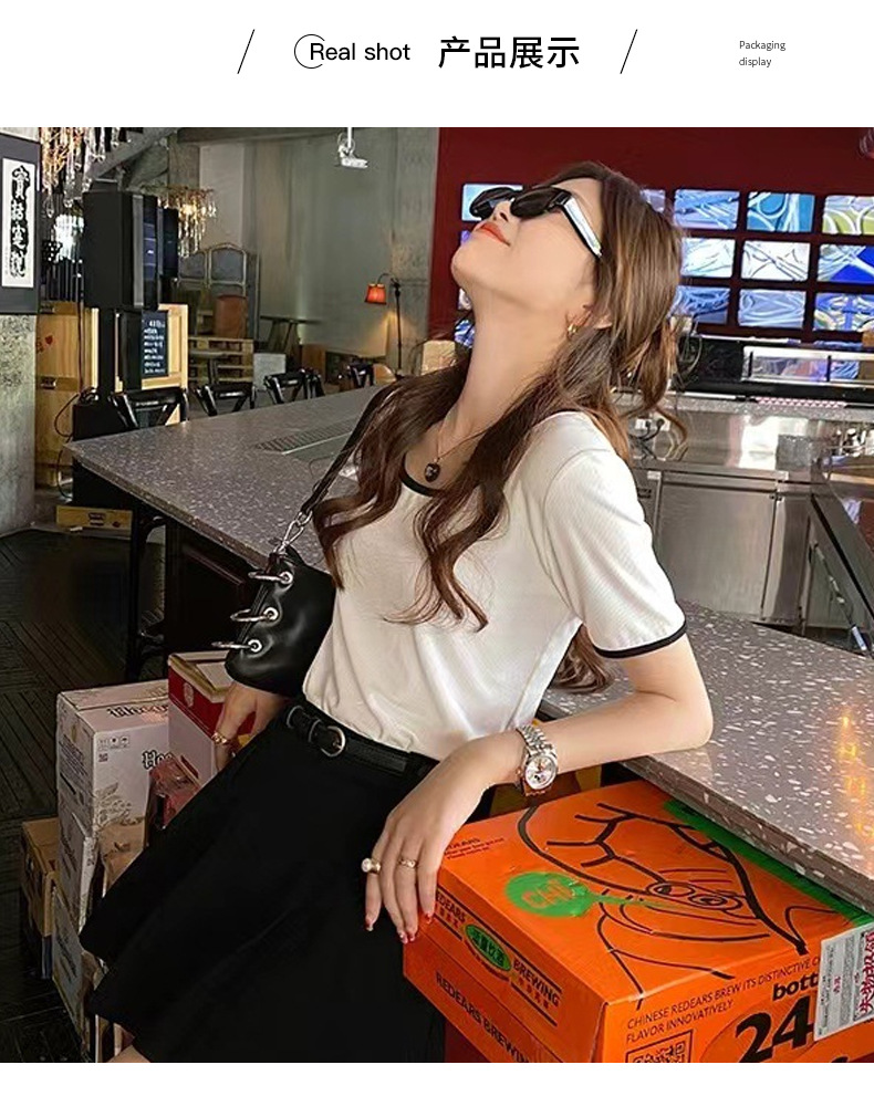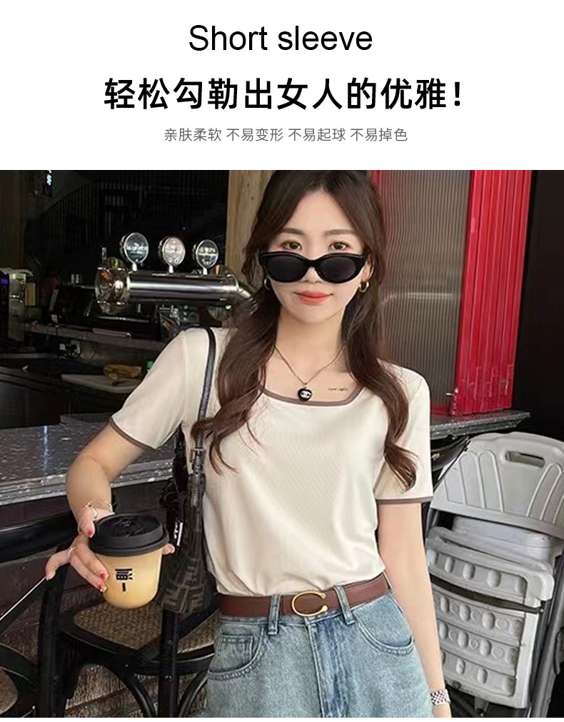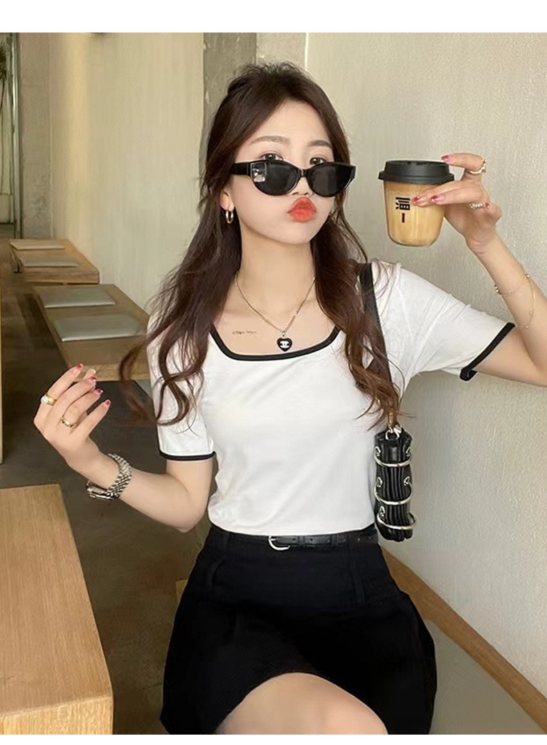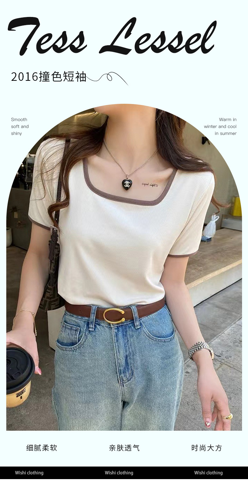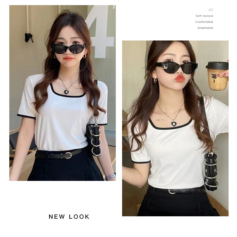 새로운 대비 색상 사각형 칼라 반팔 여성 티셔츠 대형 슬림 슬림 바닥 셔츠 탑 여성 여름 하이 엔드 감각스토어 가기