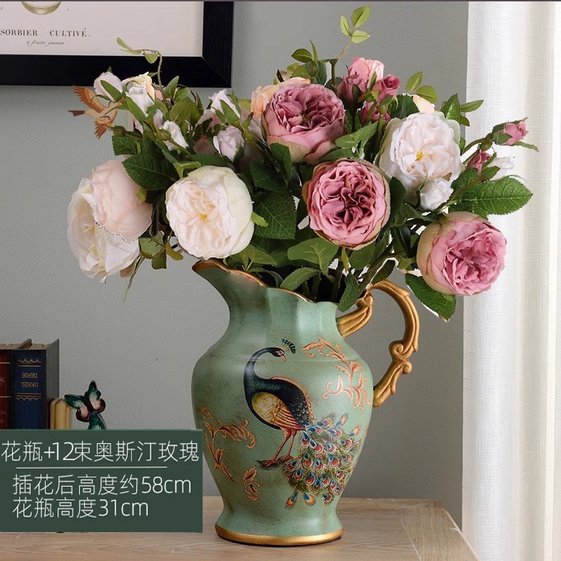 • 녹색 바탕 공작새 무늬 화병에 오스틴 장미 12송이
