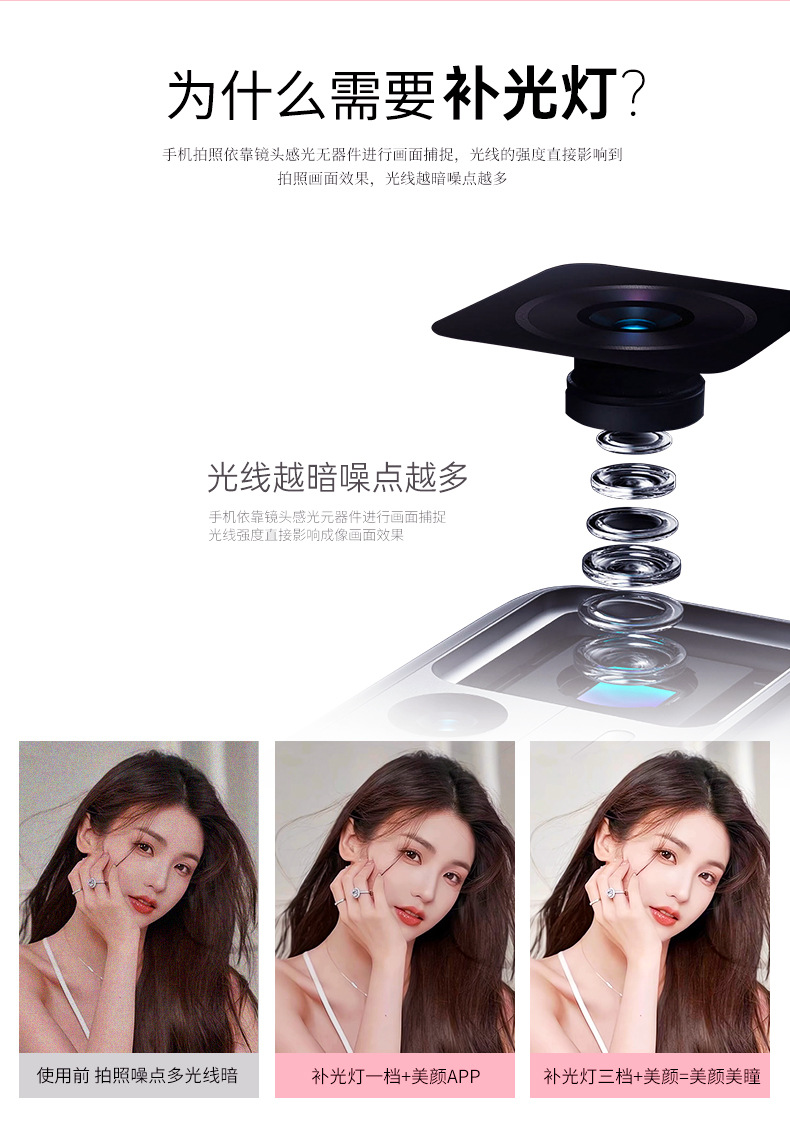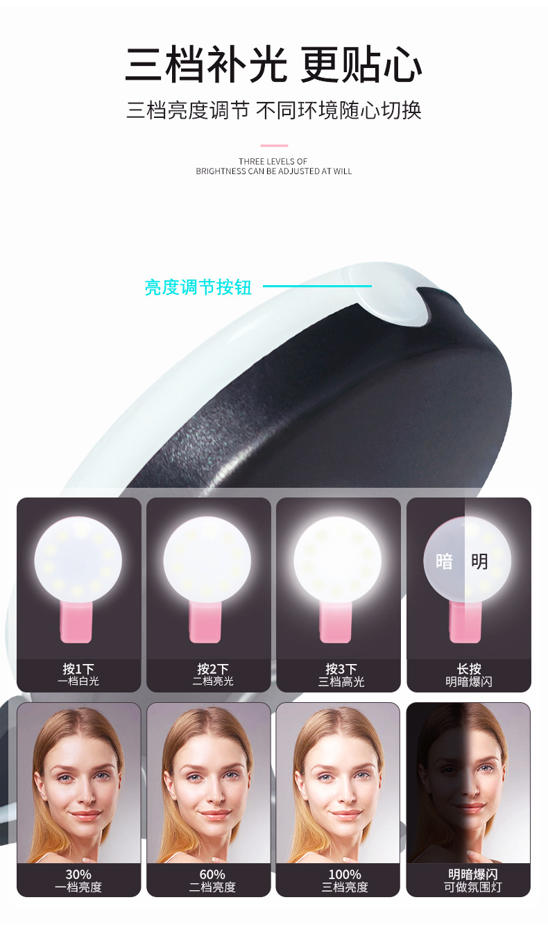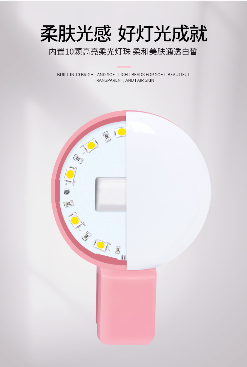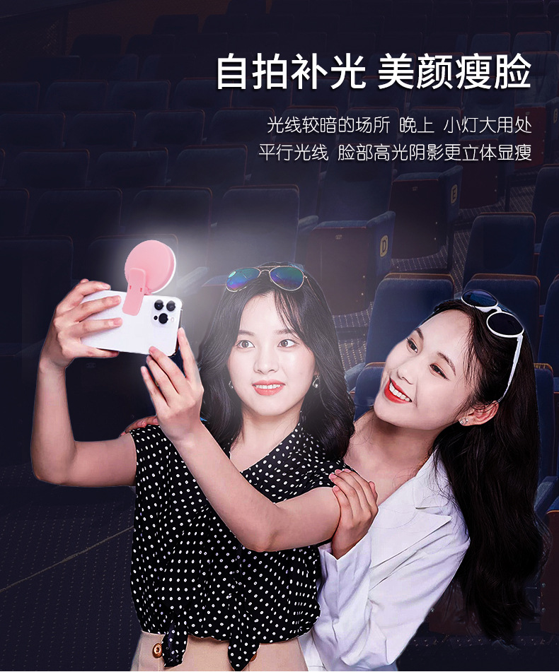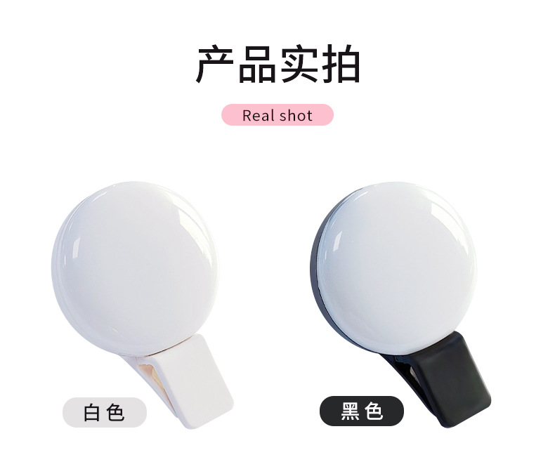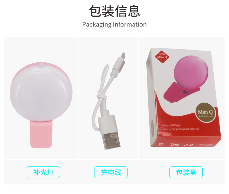 【产品包装】:中性英文彩盒+补光灯+充电线