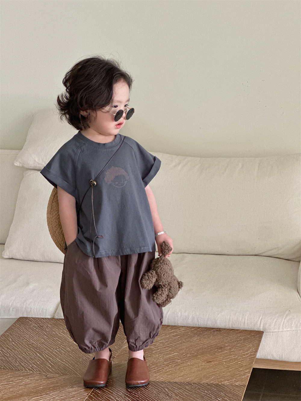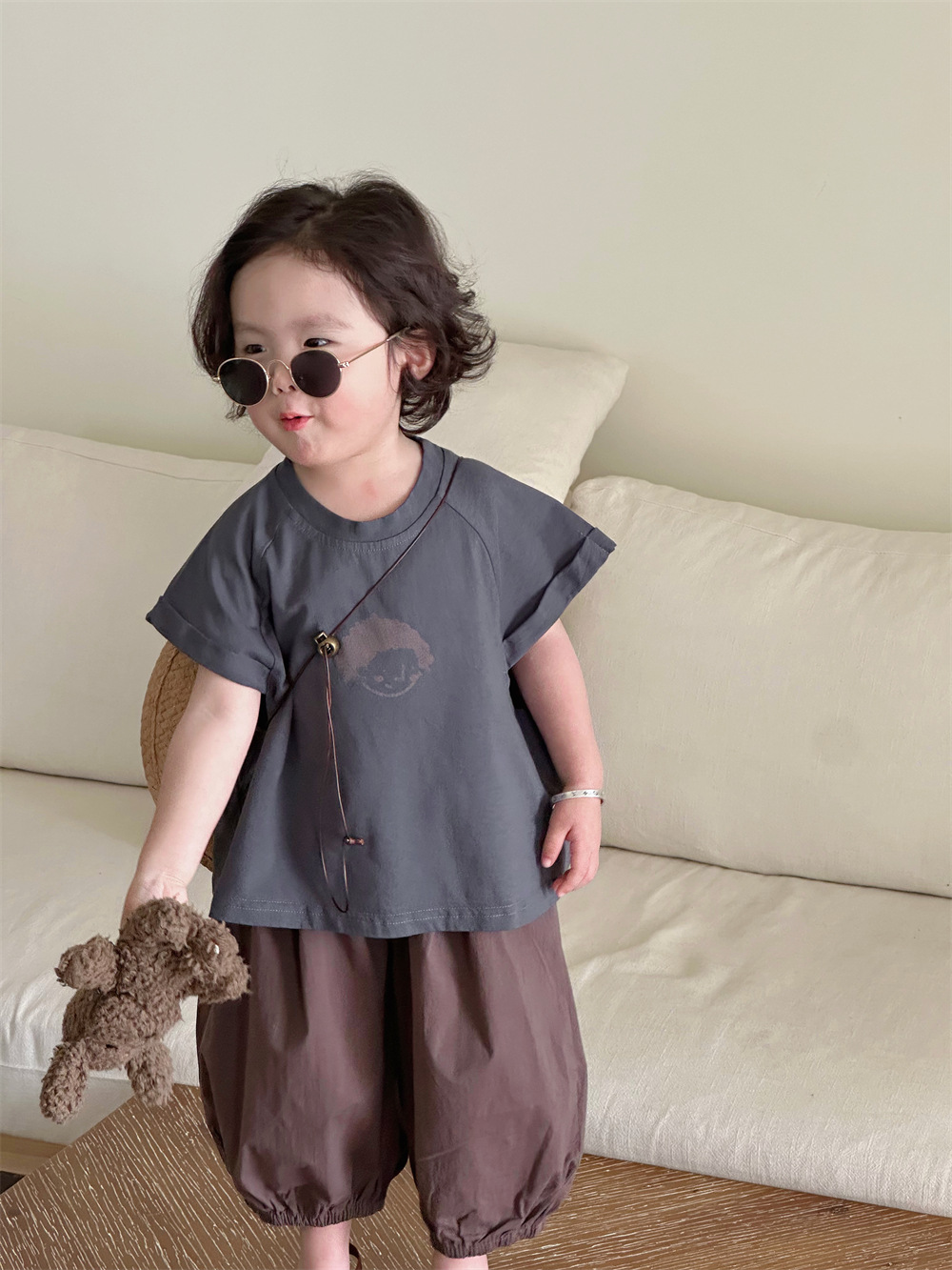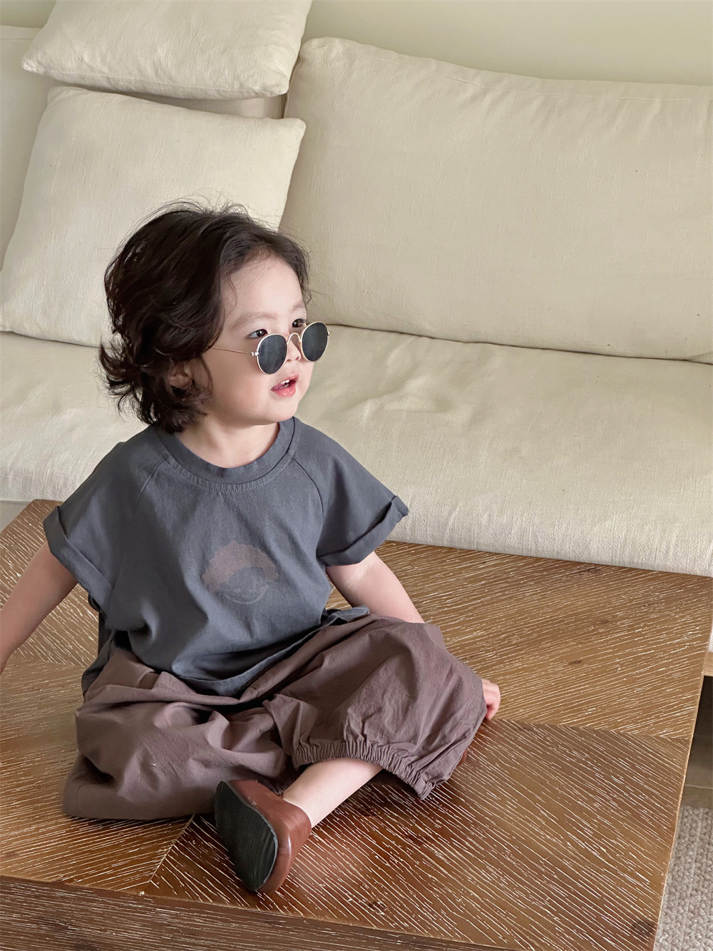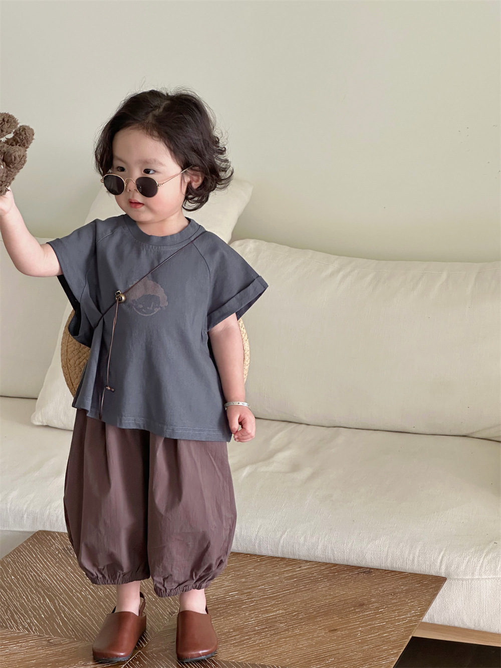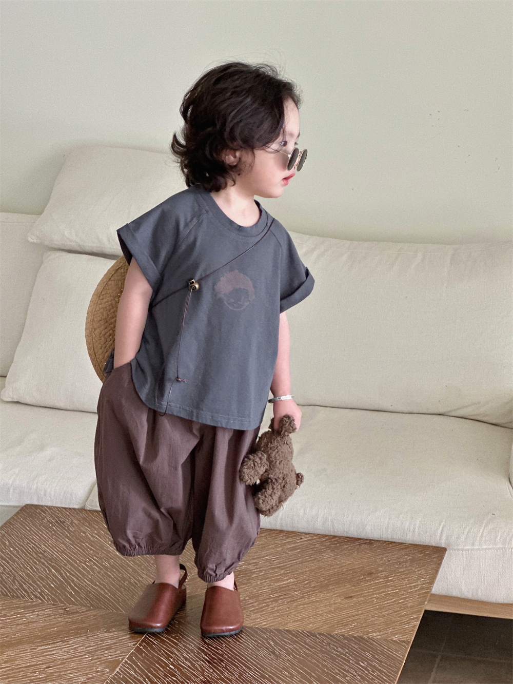 Montaigne Boys의 한국식 어깨 소매 여름 세트 2024 새로운 중소 아기 디자이너 투피스 스트레이트 세트