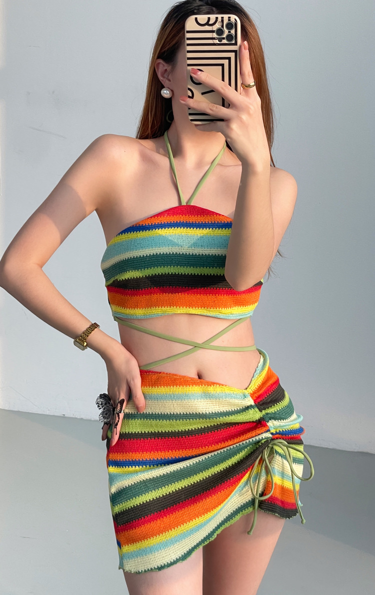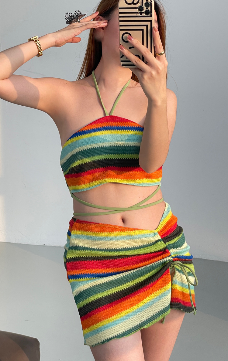 일본인과 한국 비키니 새로운 성적 아름다운 등 작은 가슴 모내기 목 스트랩 유행 줄무늬 스플릿 스커트 수영복 여성스토어 가기