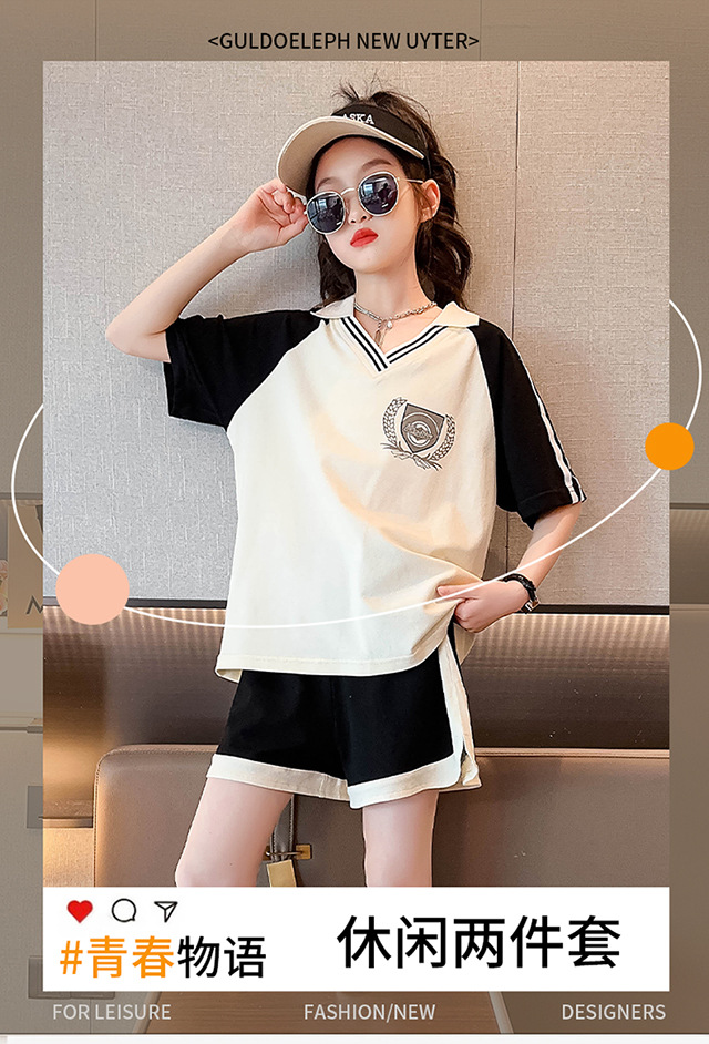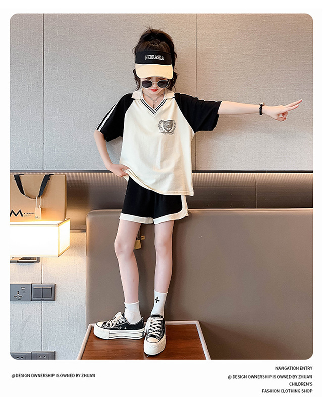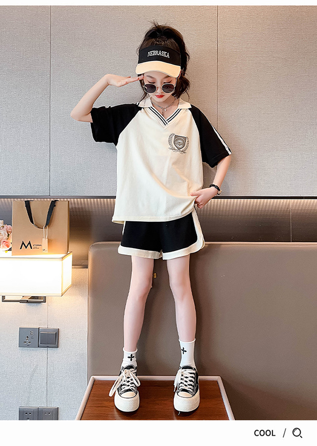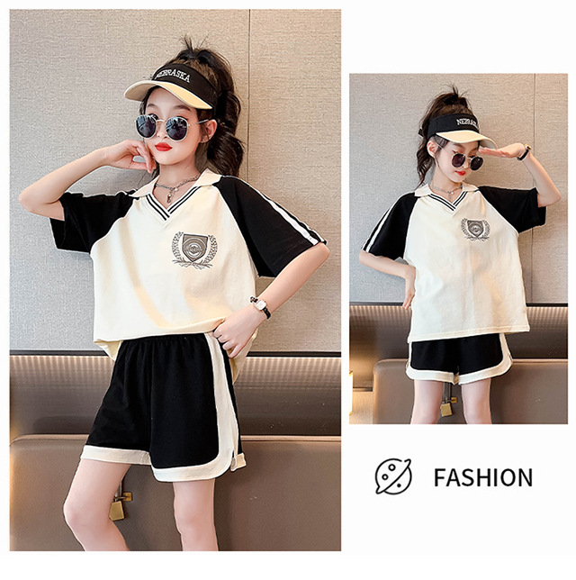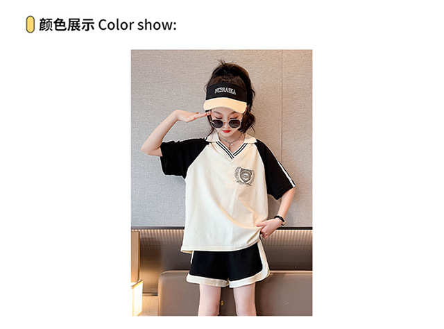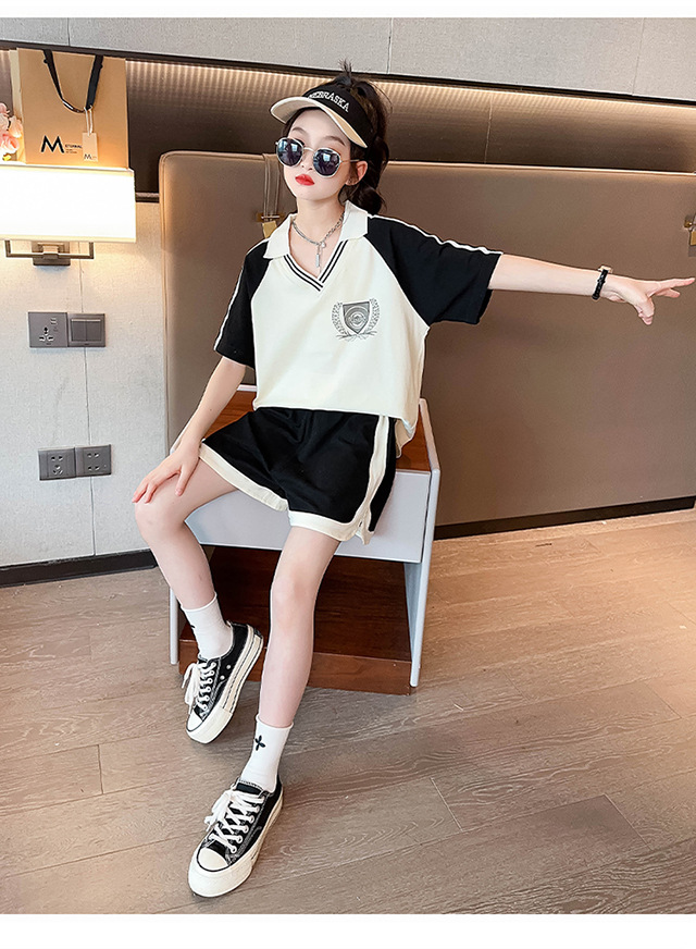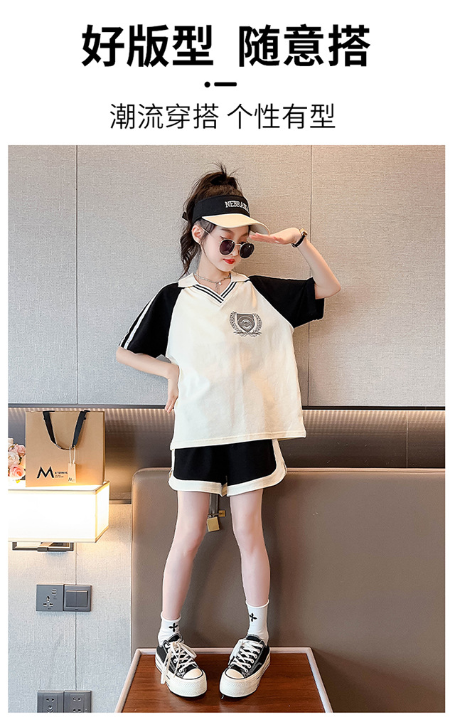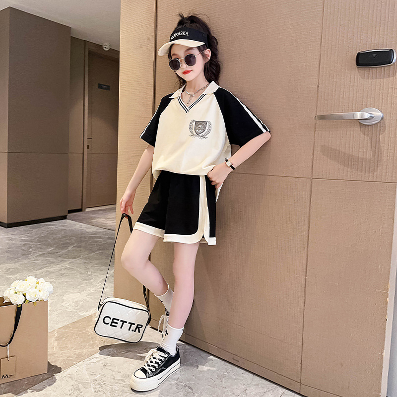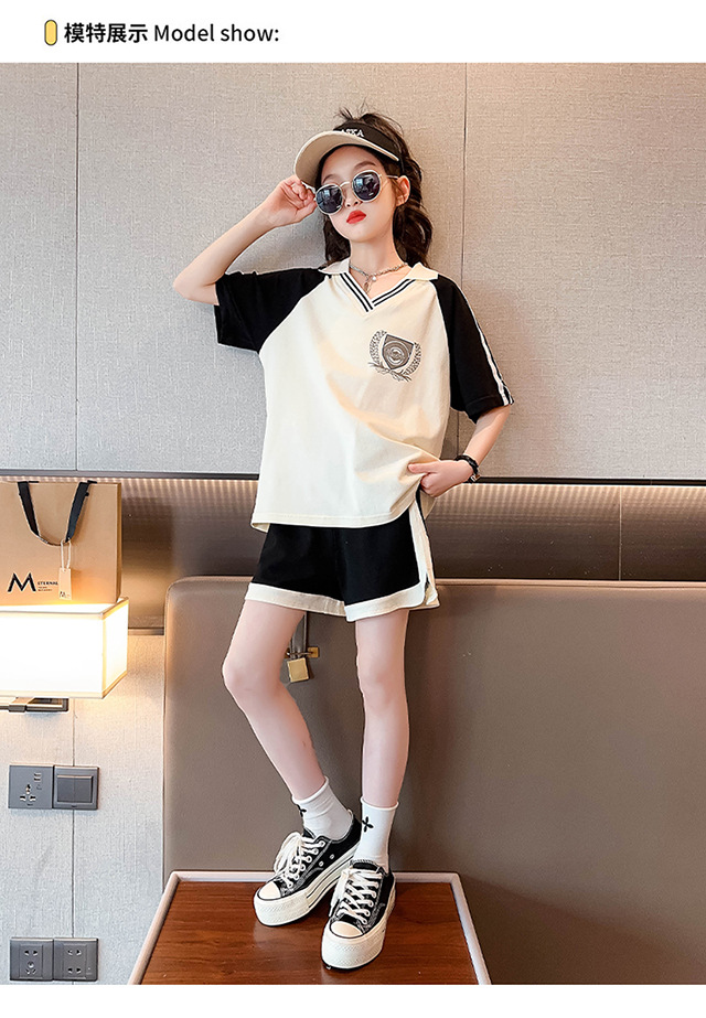 소녀 여름 세트 2024 새로운 대형 어린이 서양식 스포츠 레저 편지 컬러 매칭 반팔 티셔츠 투피스 세트 8