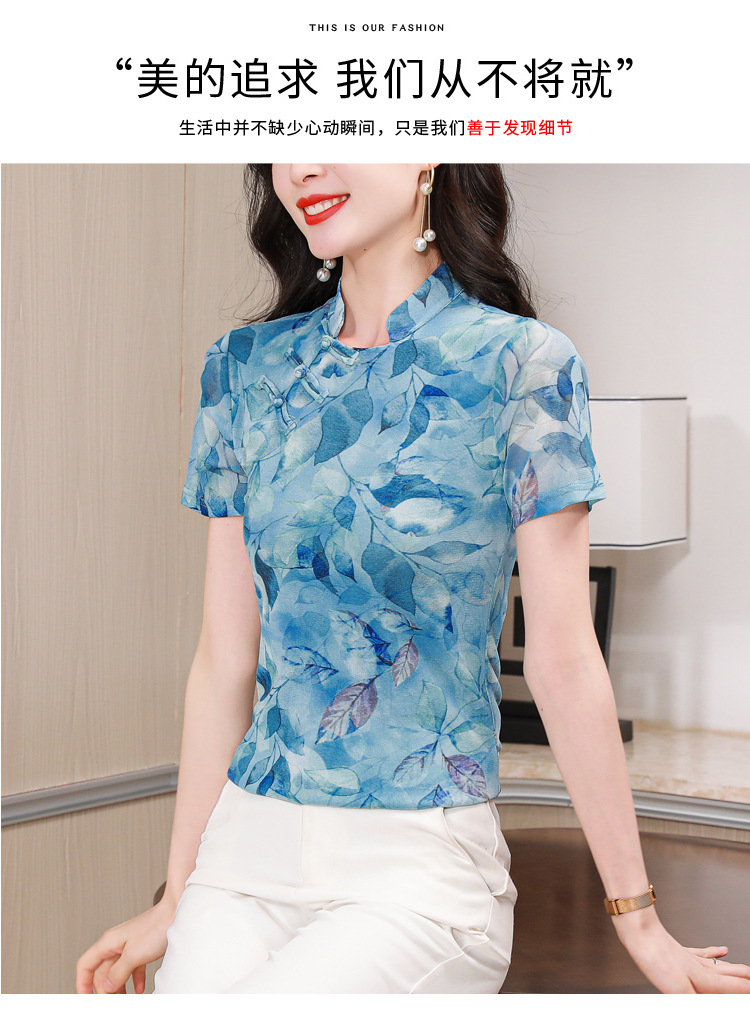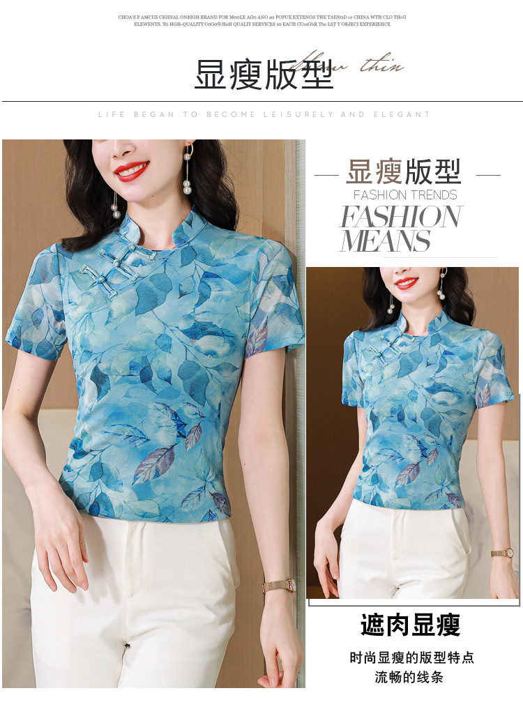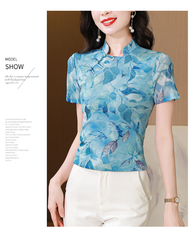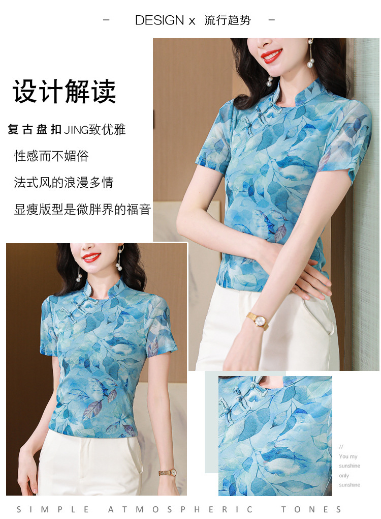 2024 스팟 중국 스타일 국가 스타일 새로운 스타일 메쉬 칼라 인쇄 스티칭 버클 슬림 핏 슬림 핏 올 매치 작은 셔츠 탑