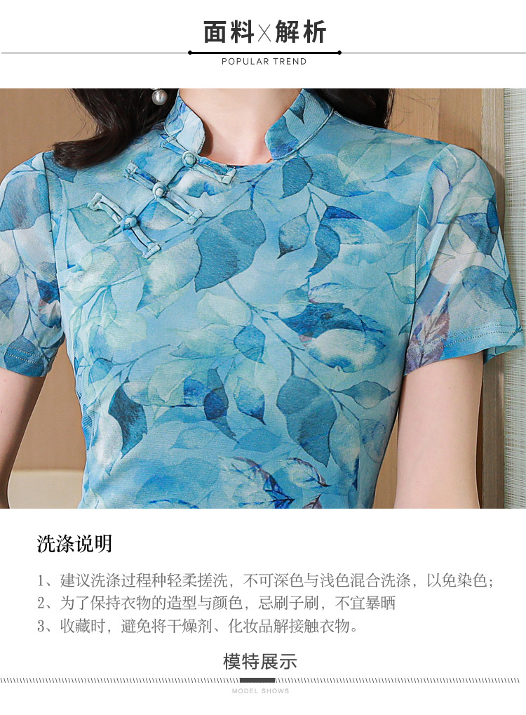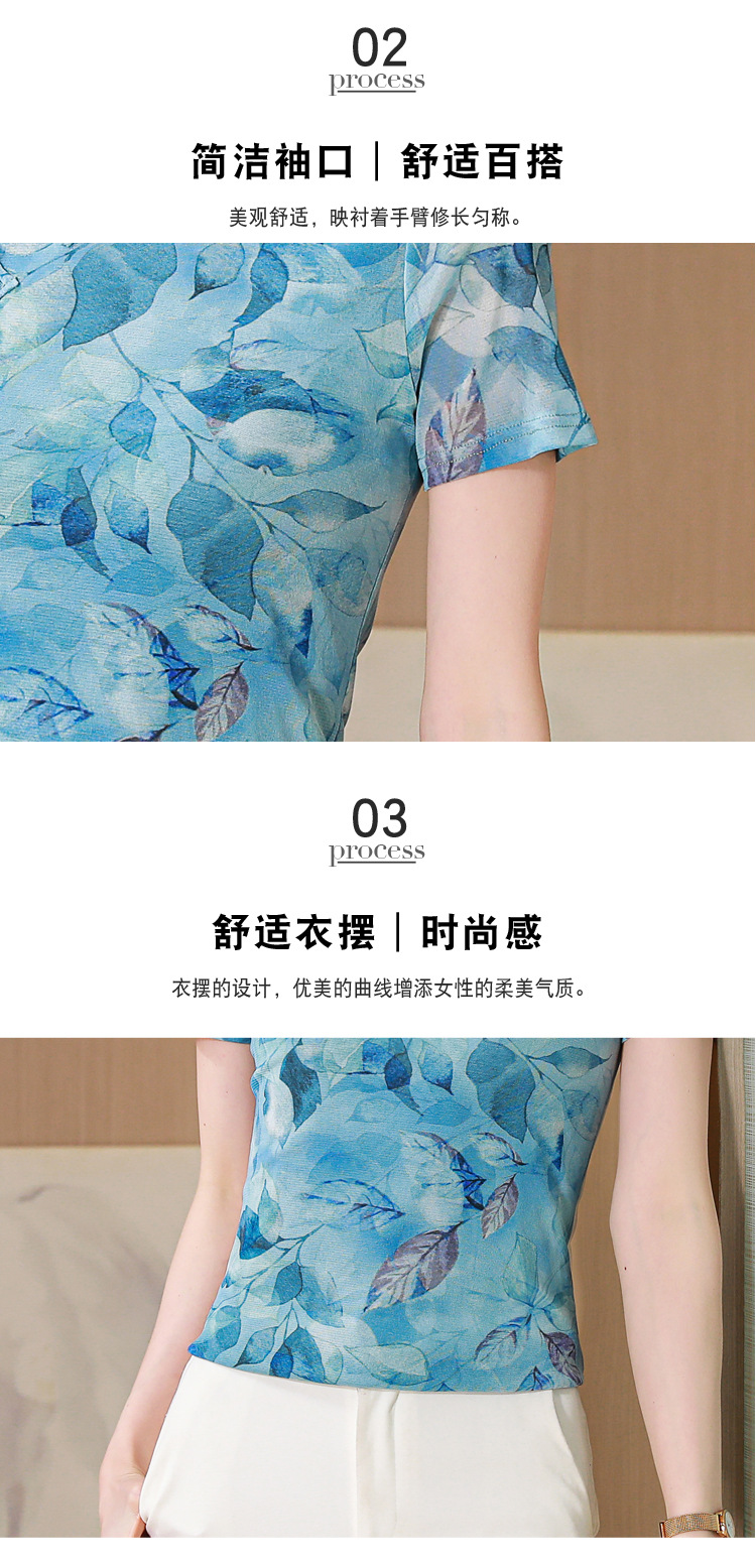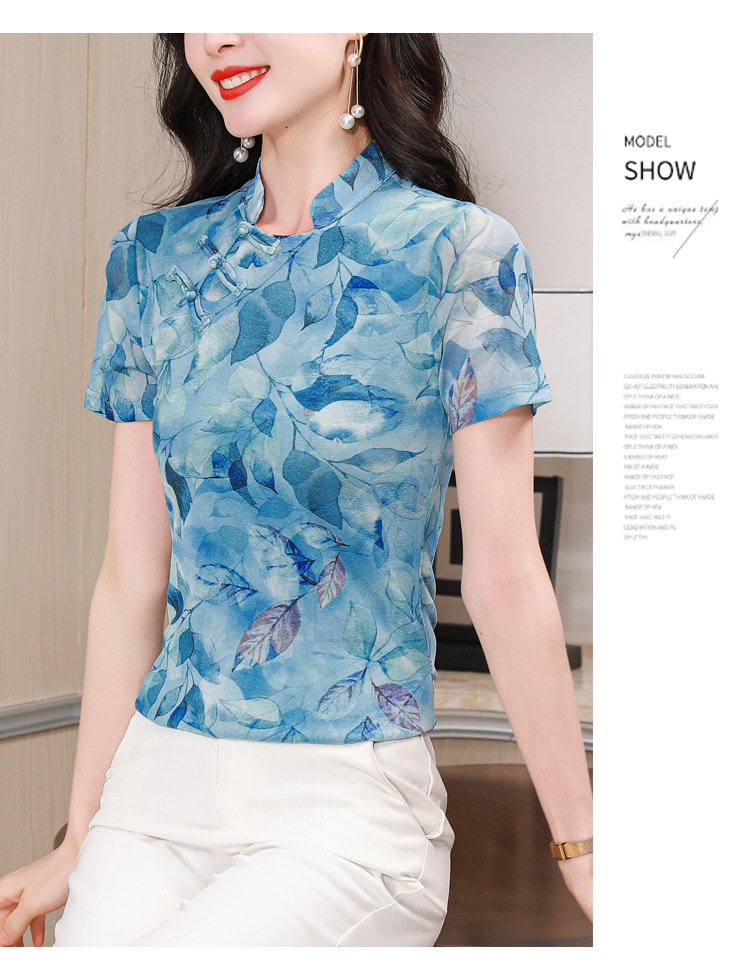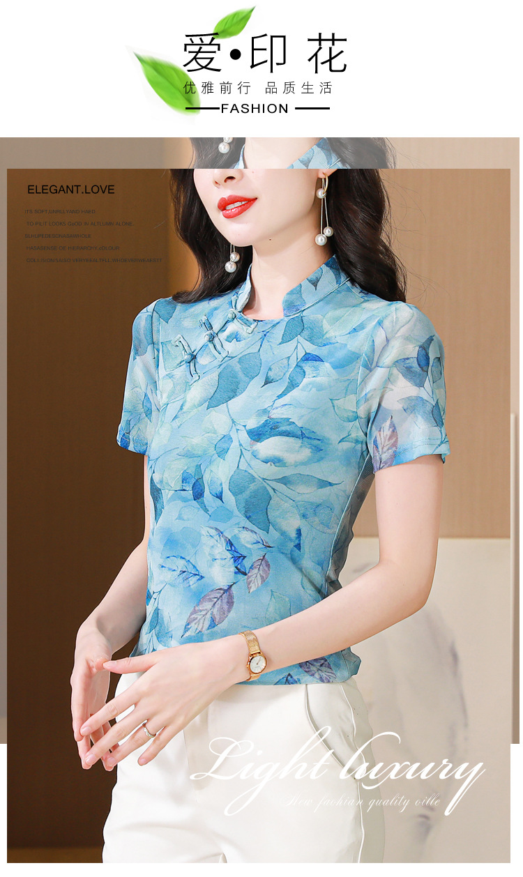 2024 스팟 중국 스타일 국가 스타일 새로운 스타일 메쉬 칼라 인쇄 스티칭 버클 슬림 핏 슬림 핏 올 매치 작은 셔츠 탑