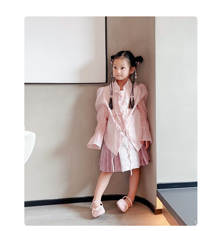 소녀 Guofeng 작은 가죽 신발 2024 여름 새로운 메쉬 할로우 세미 샌들 유행 중소 어린이 공주 신발