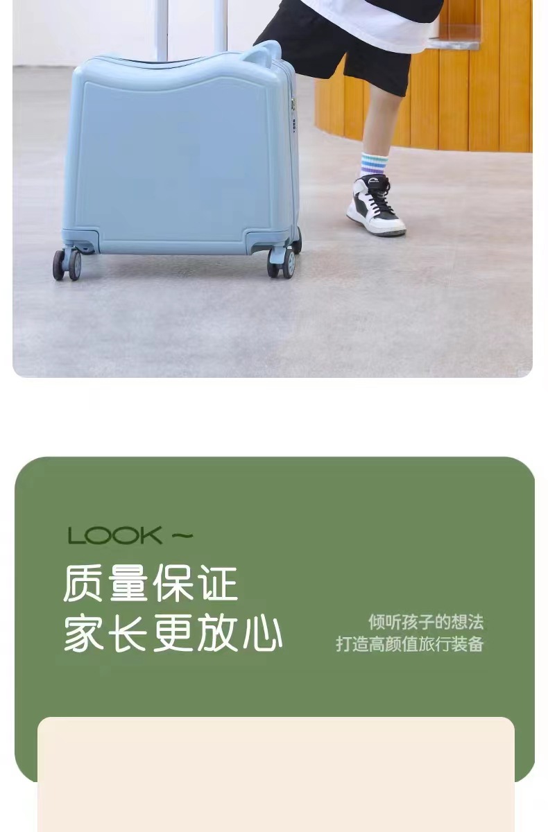 这款儿童骑行箱,拉杆拉起的高度(从轮子处量起)85CM。自身长(拉起露出部分)48CM