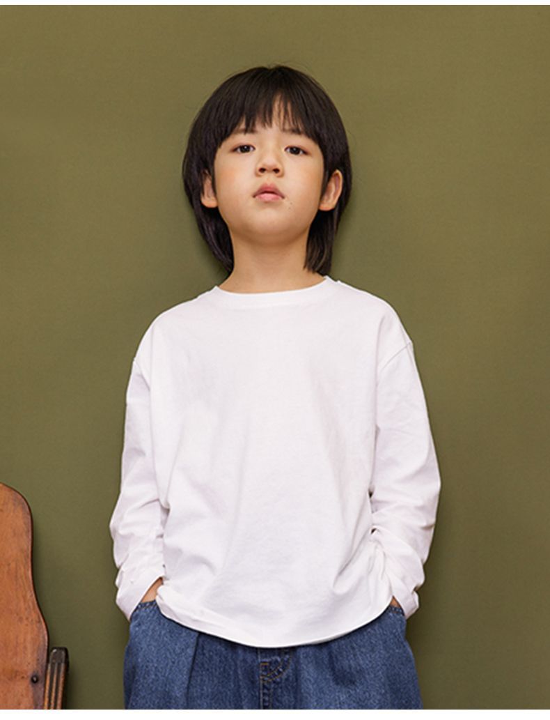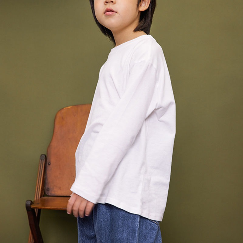 중다 아동면 긴팔 티셔츠 순수 화이트 보이즈 베이스 셔츠 2024 봄과 가을 둥근 목 단색 티셔츠