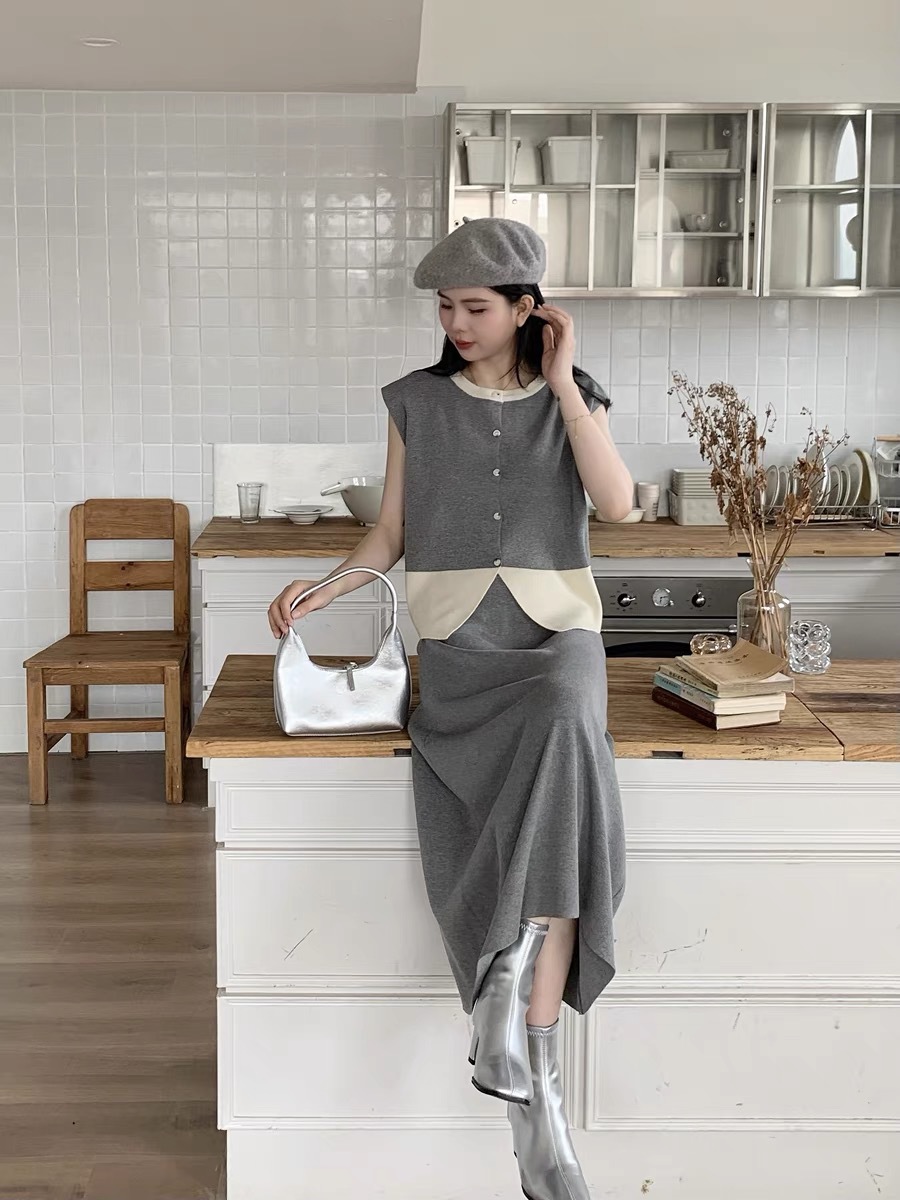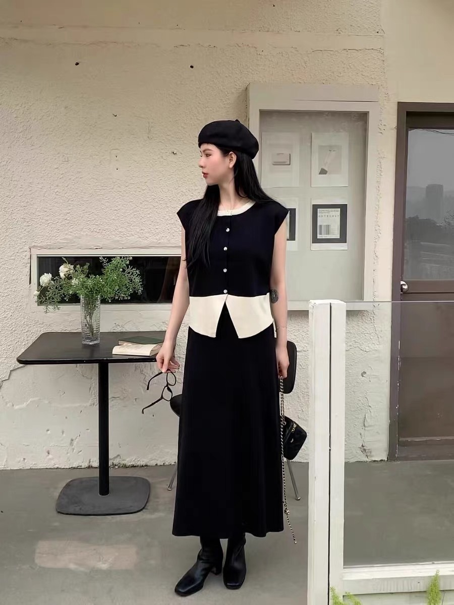 2024 새로운 디자인 라운드 넥 스티칭 브레스트 스웨터 여성 스커트 기질 패션 다재다능한 세트 여성