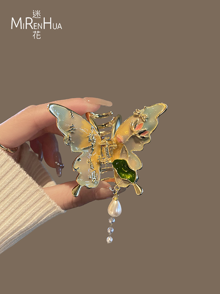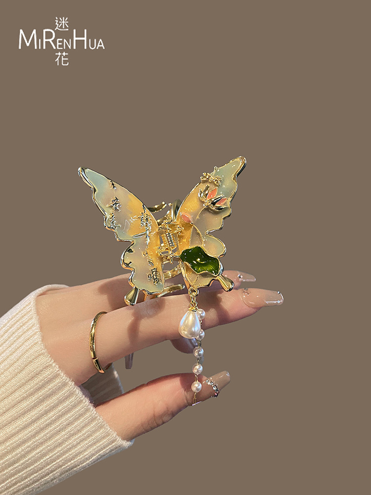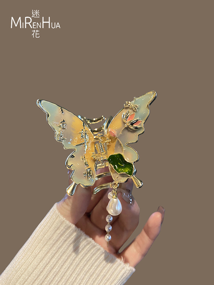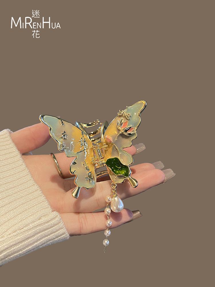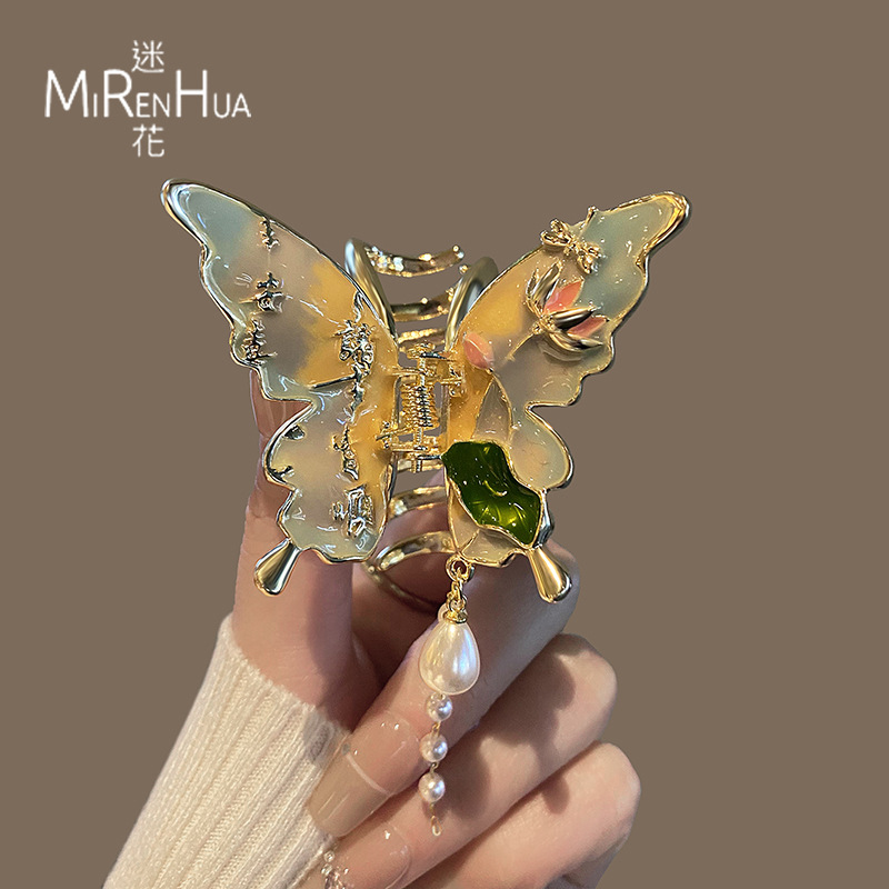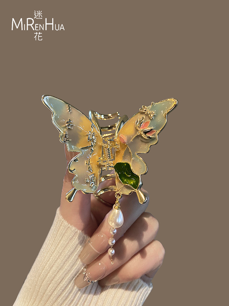 절묘한 나비 술 헤어 클립 여성용 중형 그릴 클립 헤드 하프 핀 상어 클립 고급 골동품 헤어 액세서리