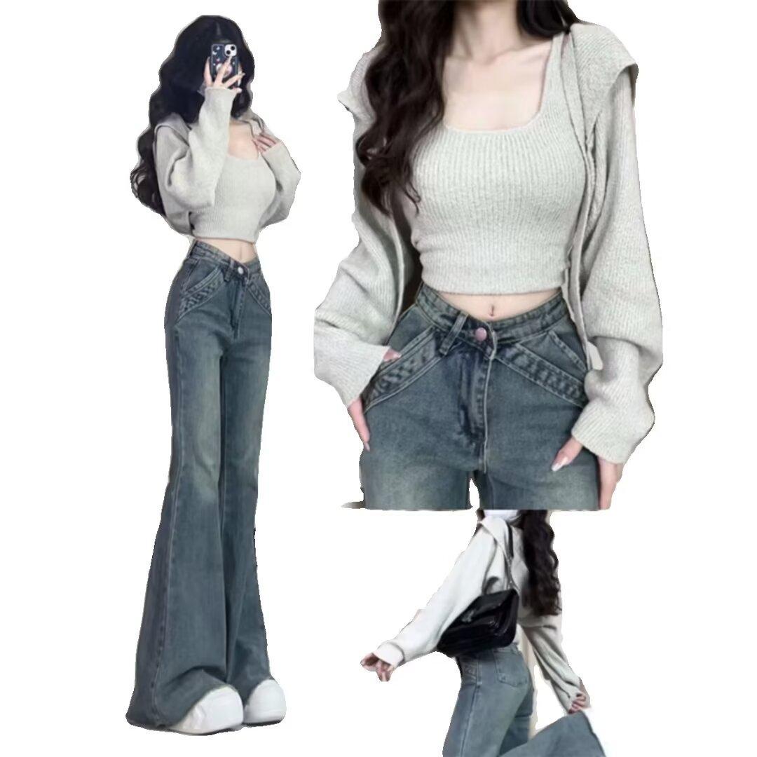 레트로 마이크로 lar 청바지 소녀 여름 2024 새로운 패션 브랜드 스타일 슬림 하이 허리 트럼펫 긴 바지스토어 가기