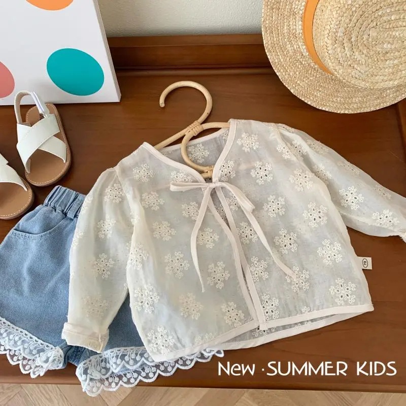 0-6 세 여름 소녀 자카드 에어컨 셔츠 여성 아기 단색 한국 얇은 코트 어린이 속이 빈 카디건 탑스토어 가기