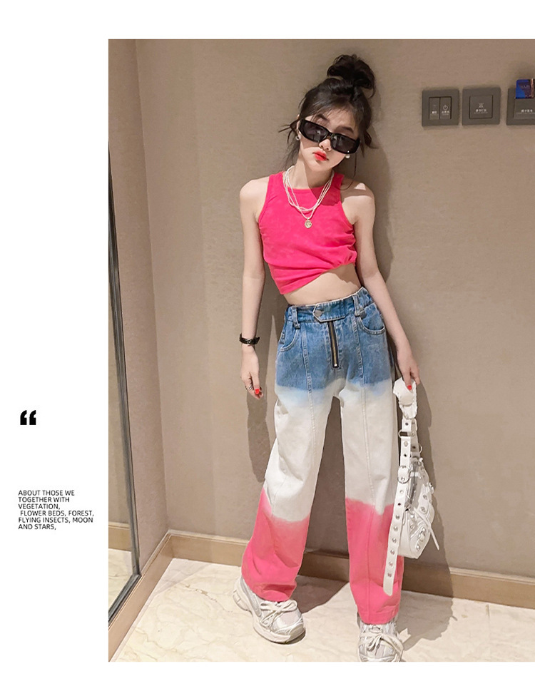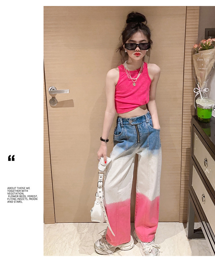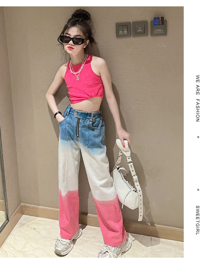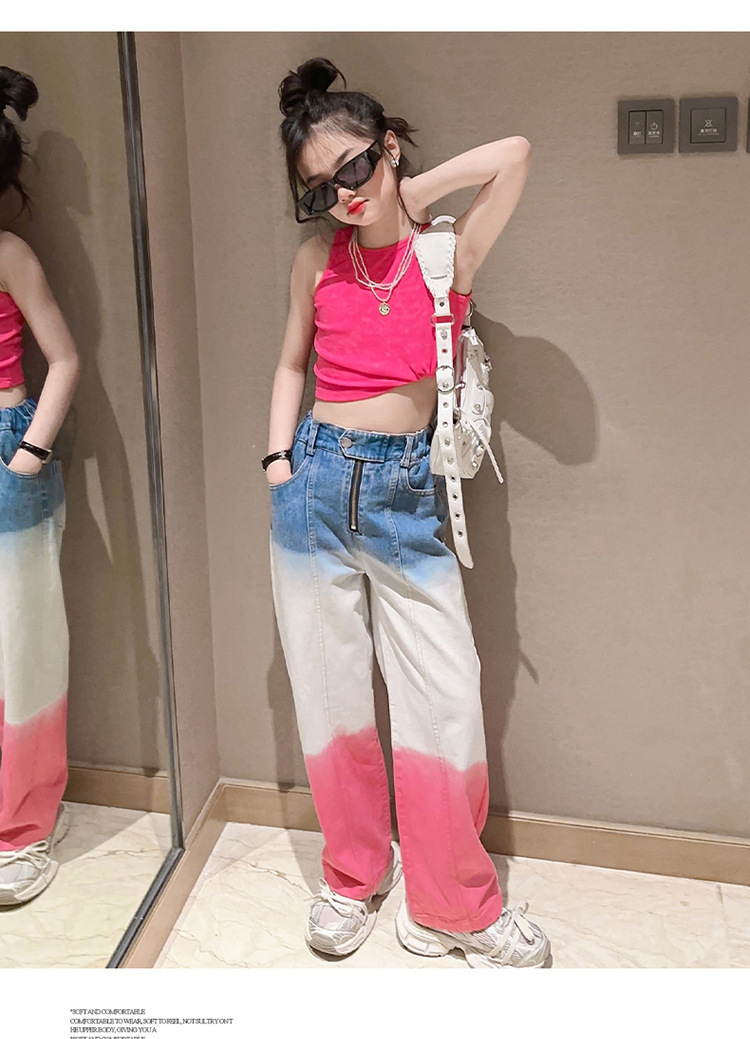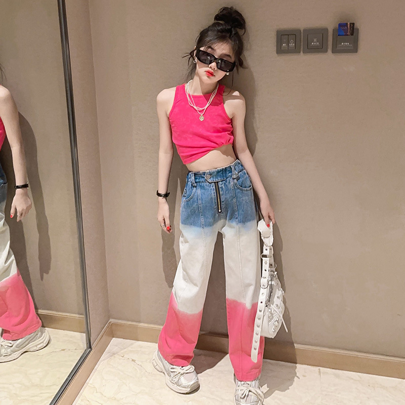 소녀의 여름 세트 2024 새로운 스타일 큰 소년 소녀의 세련된 조끼 데님 넓은 다리 바지 유행 어린이 투피스 세트