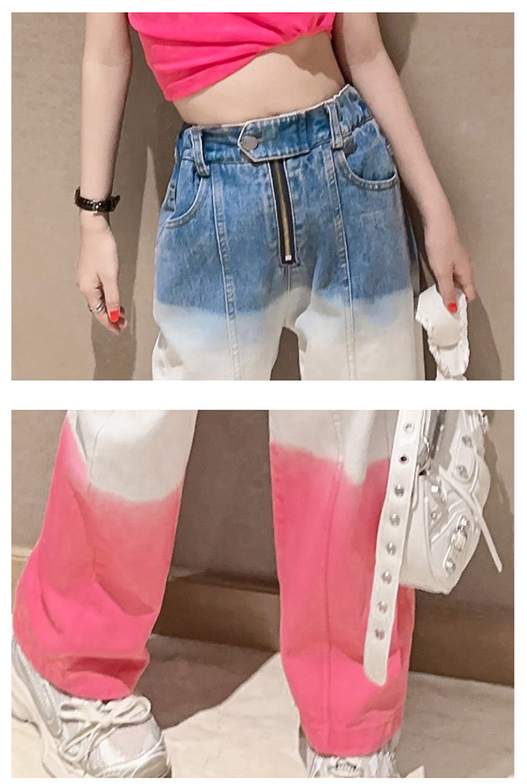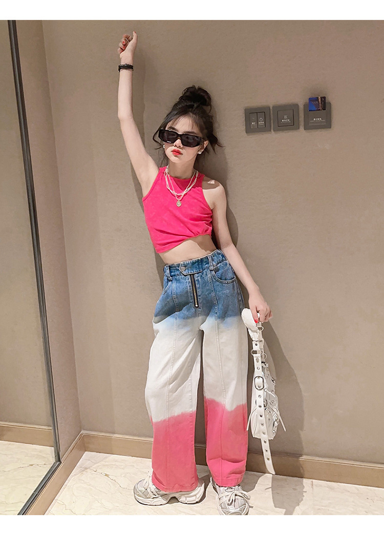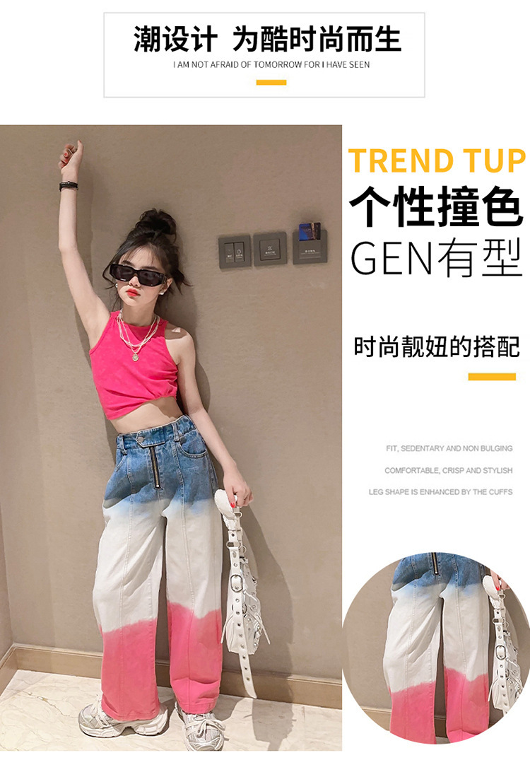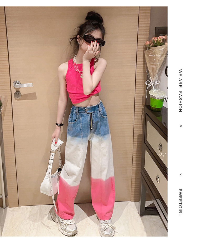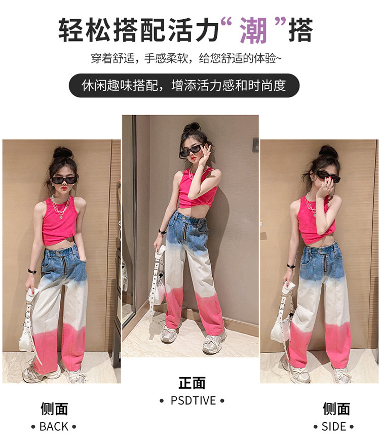소녀의 여름 세트 2024 새로운 스타일 큰 소년 소녀의 세련된 조끼 데님 넓은 다리 바지 유행 어린이 투피스 세트스토어 가기