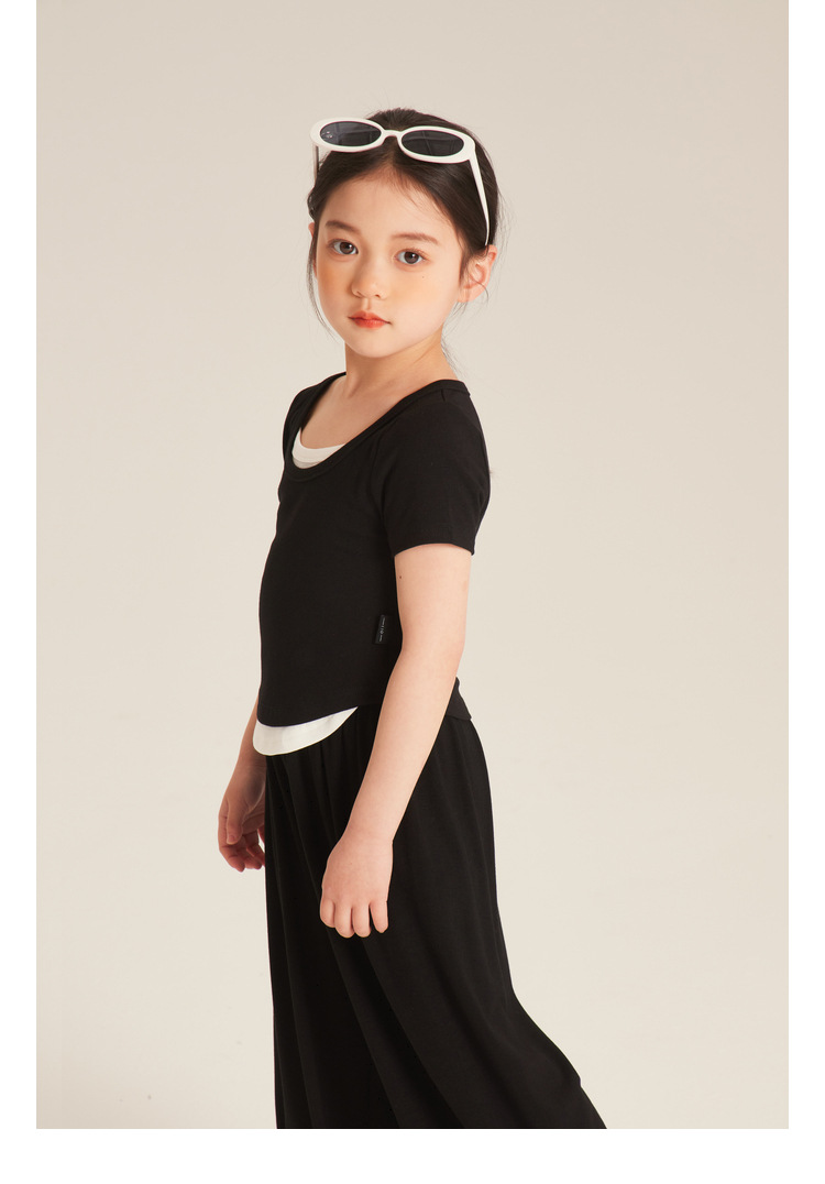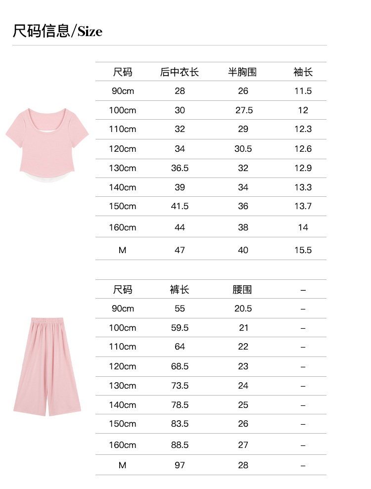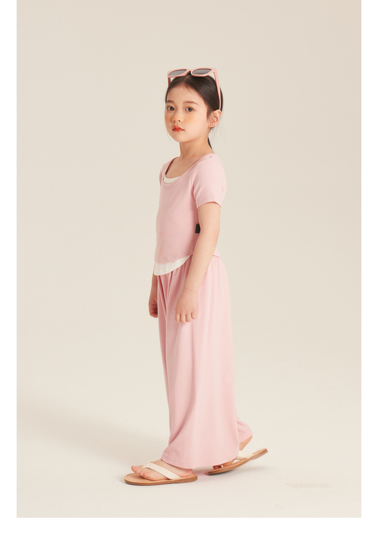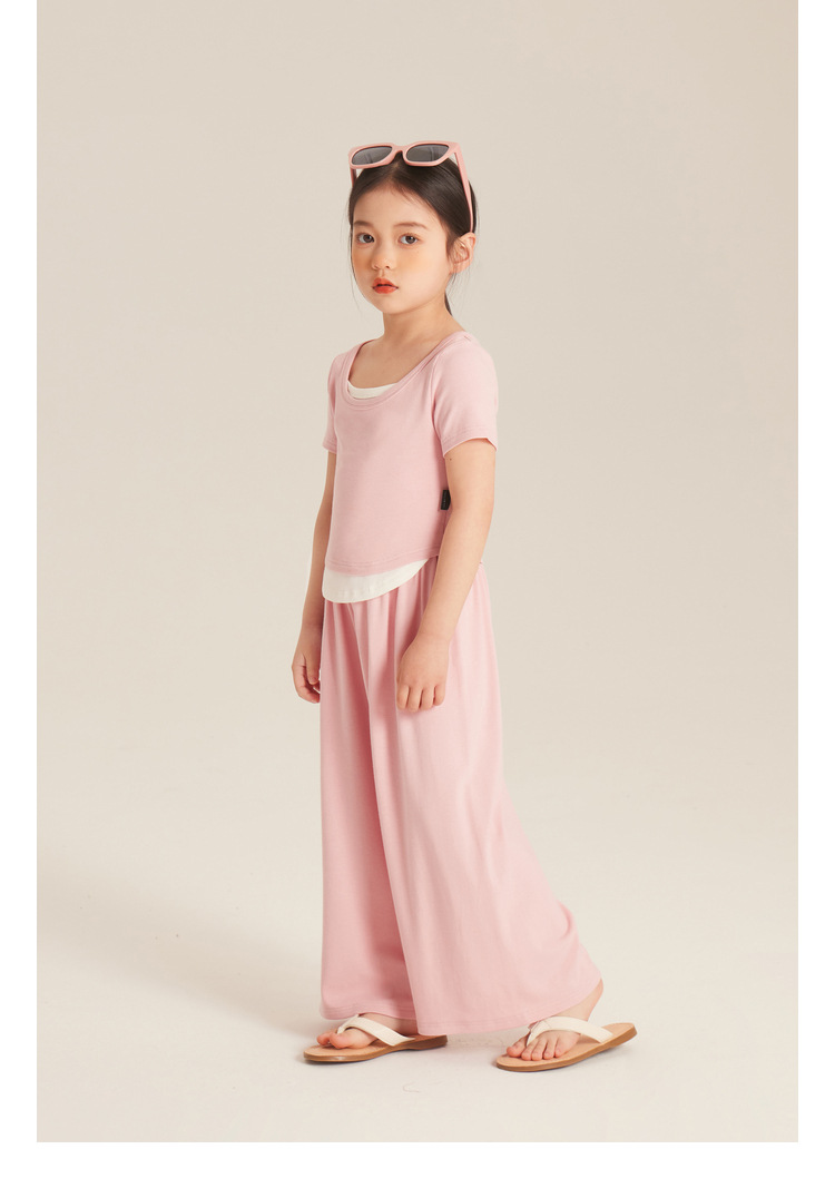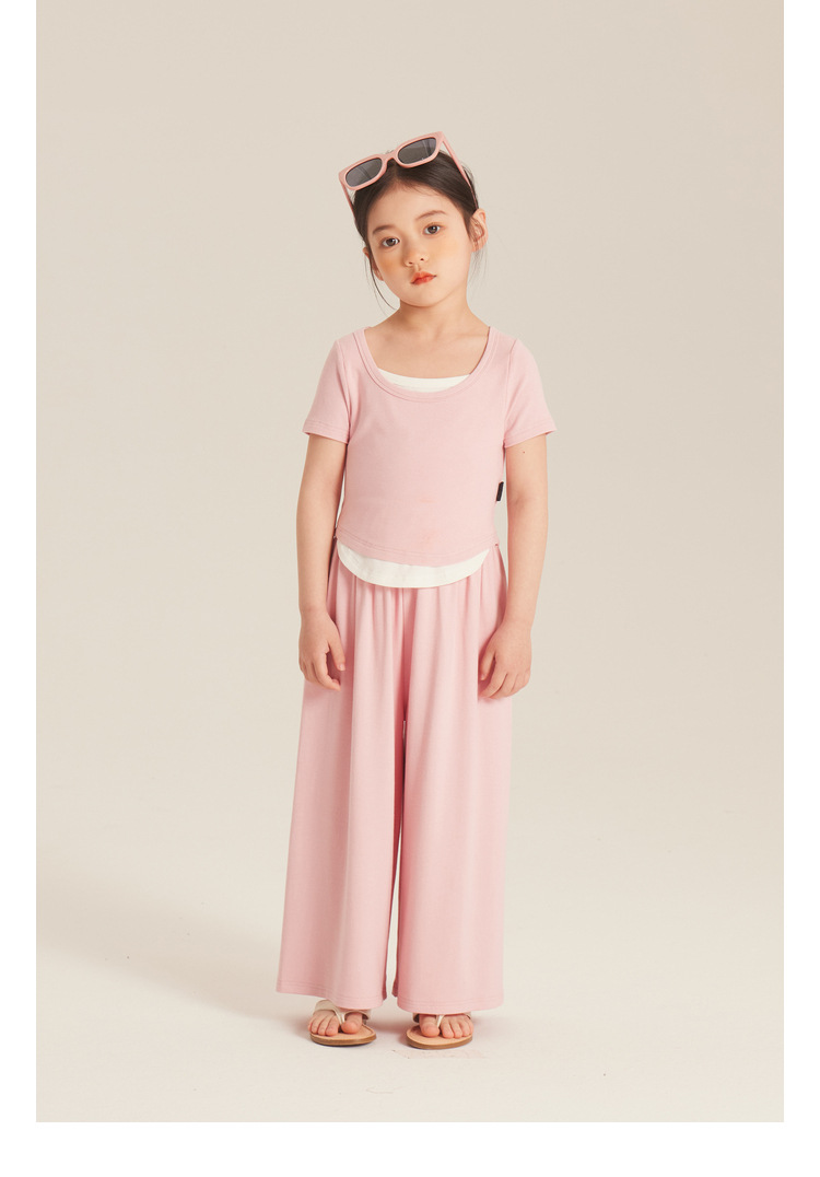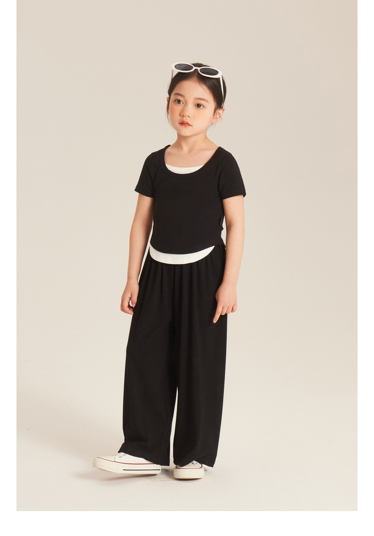 Amybaby Girls의 세트 2024 새로운 어린이 여름 가짜 투피스 반팔 최고 캐주얼 포장 넓은 다리 바지