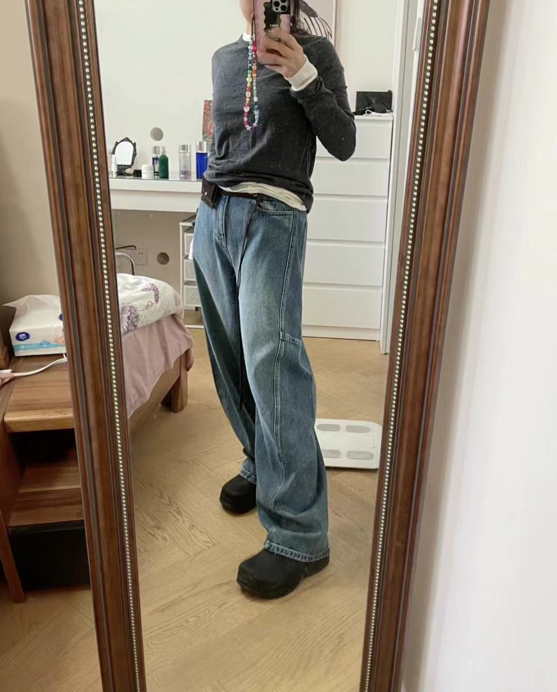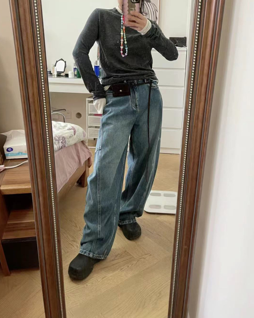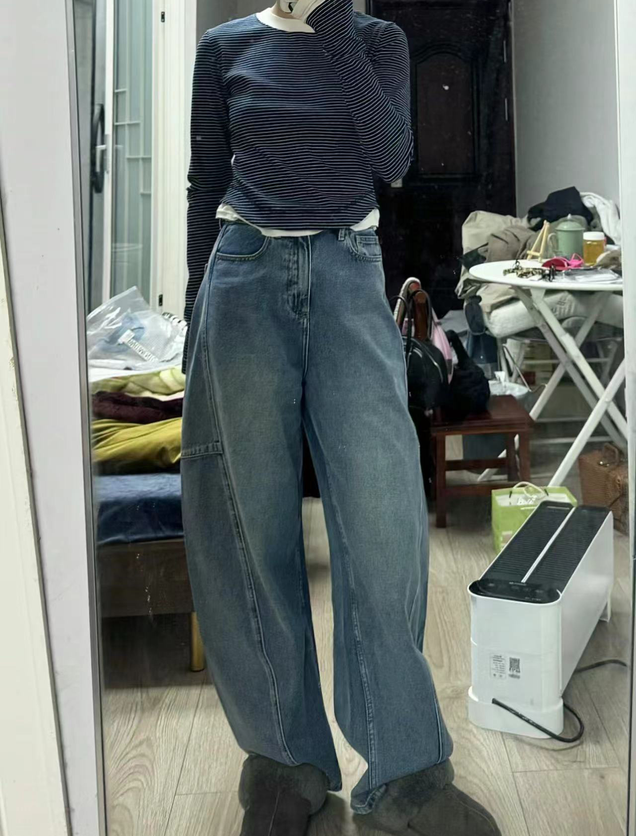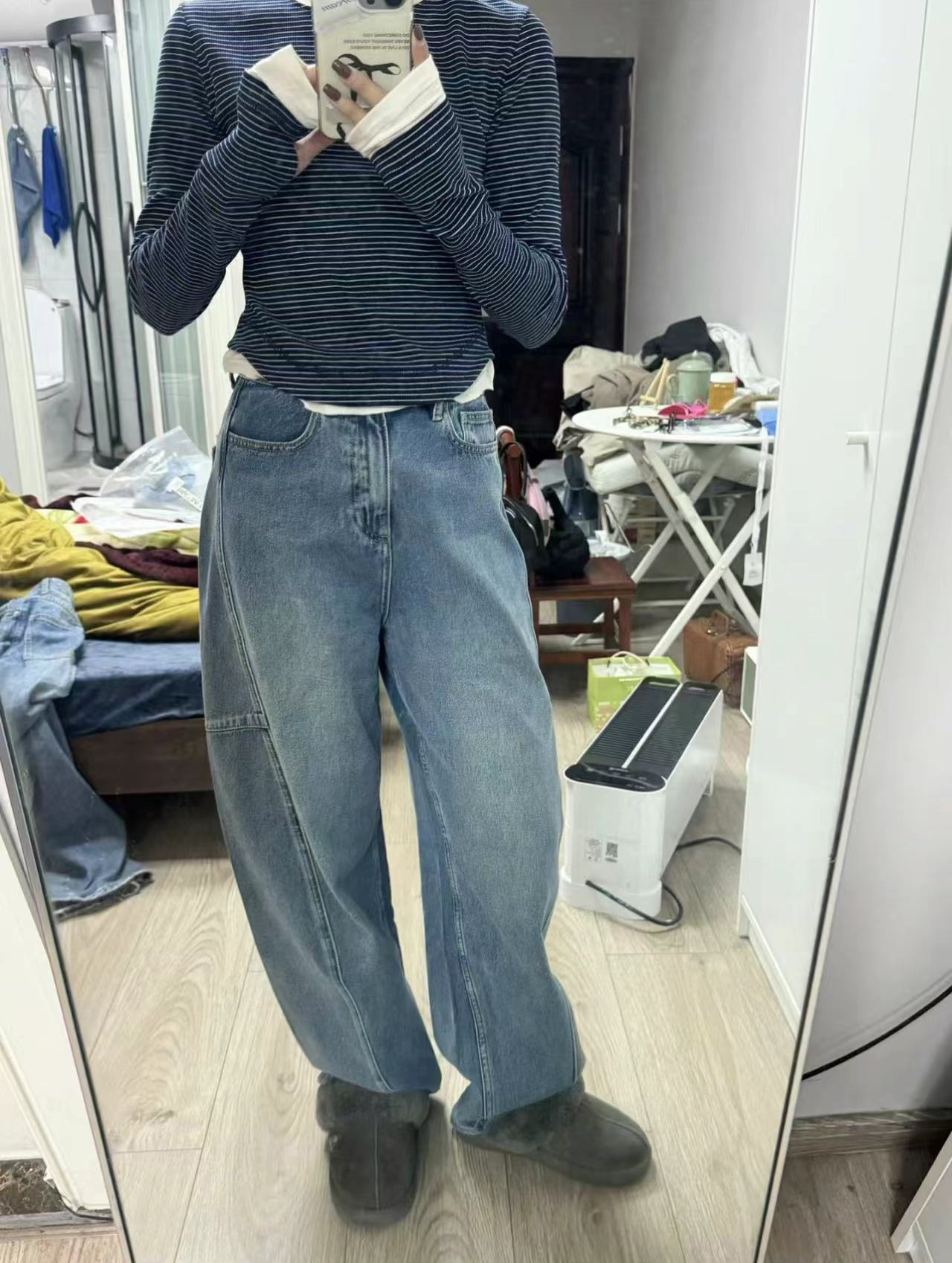 오픈 홈 유행 해체 분할 선 아크 코쿤 청바지 여성 25 봄 여름 느슨한 편안한 스키테 바나나 바지