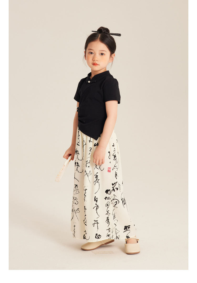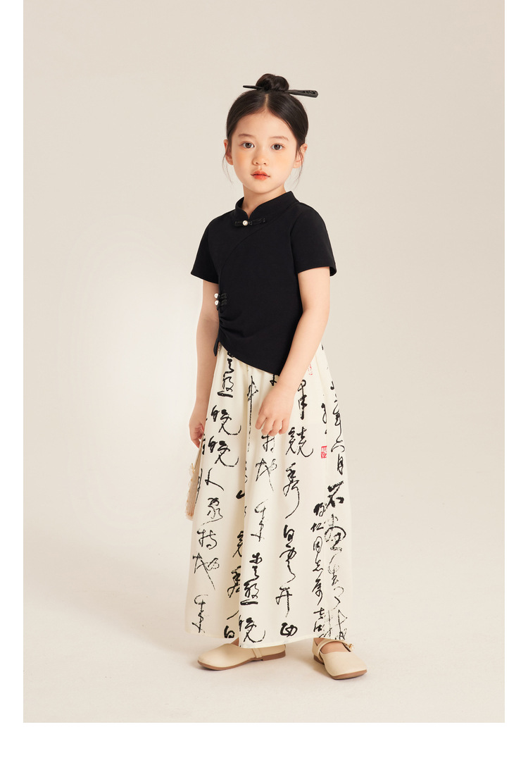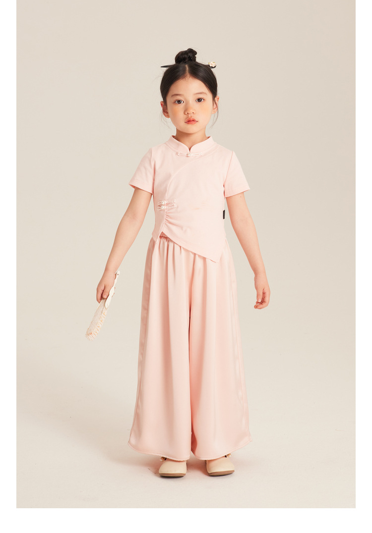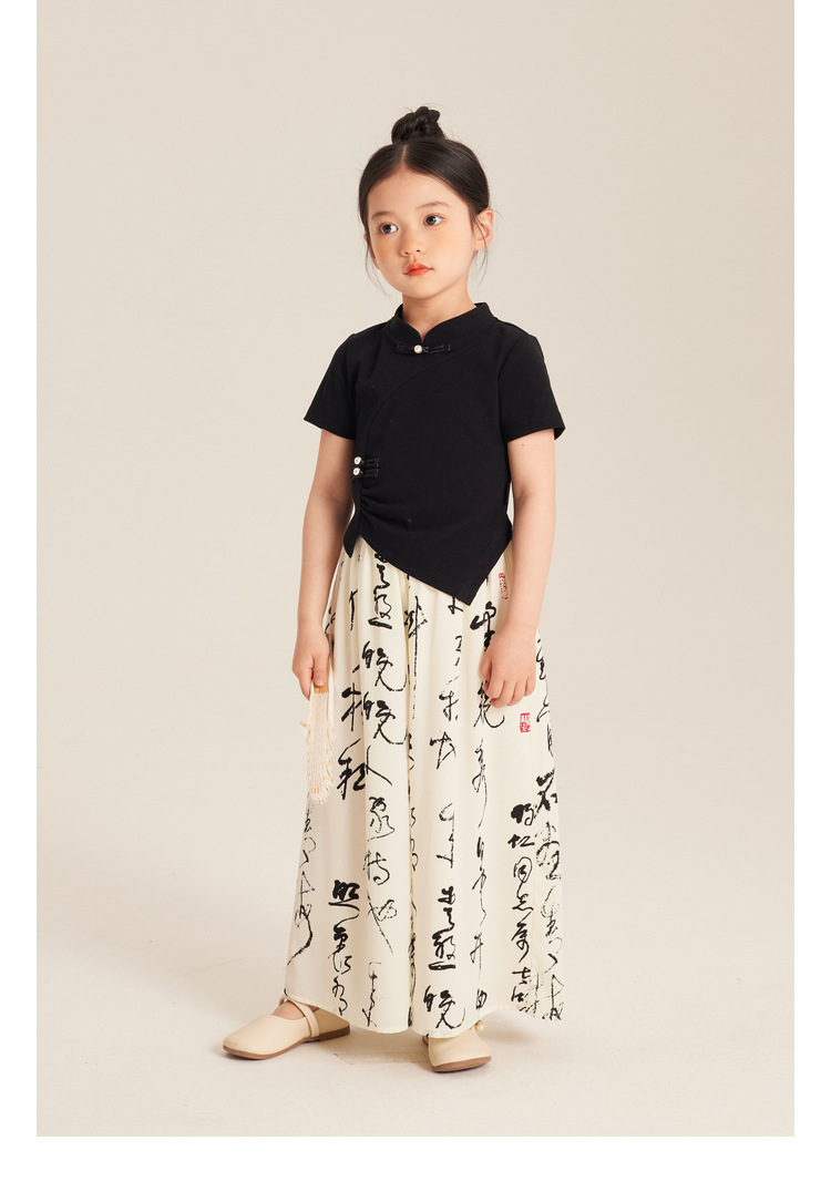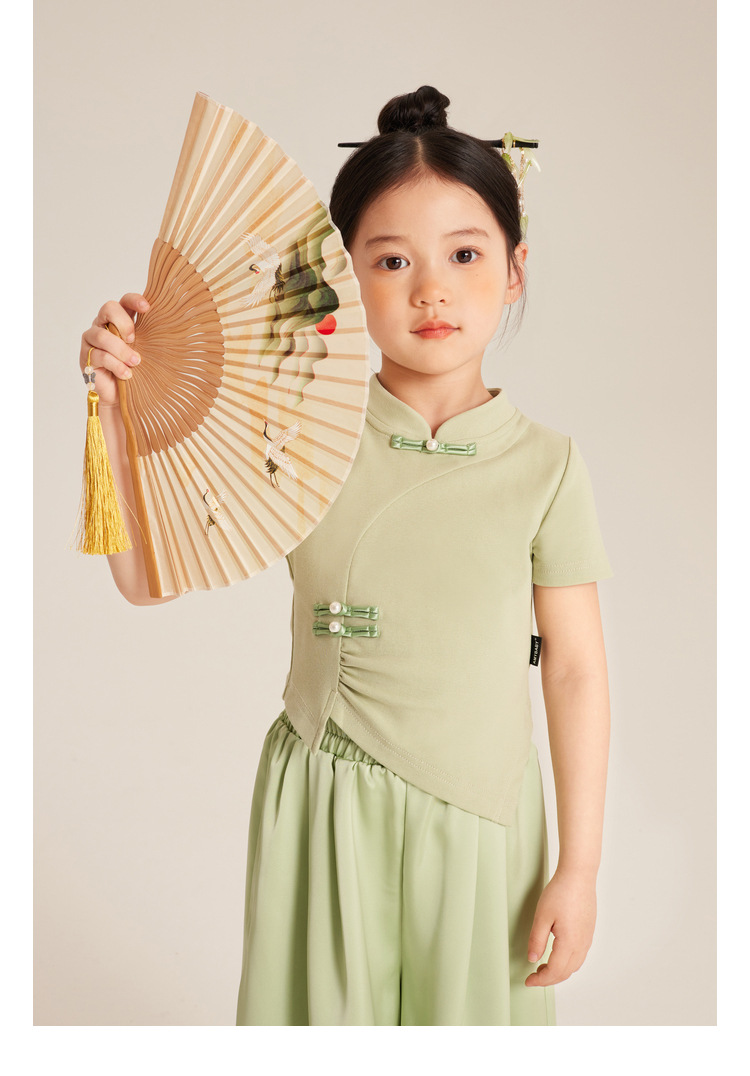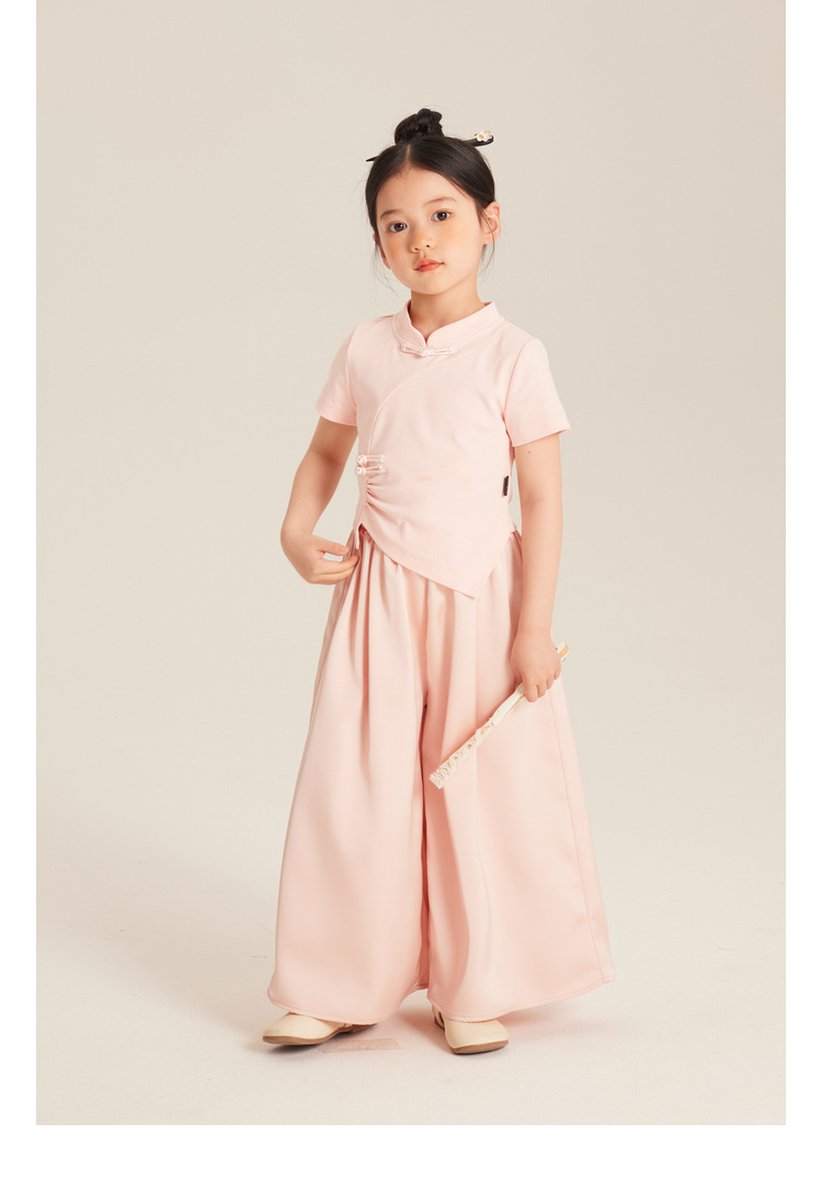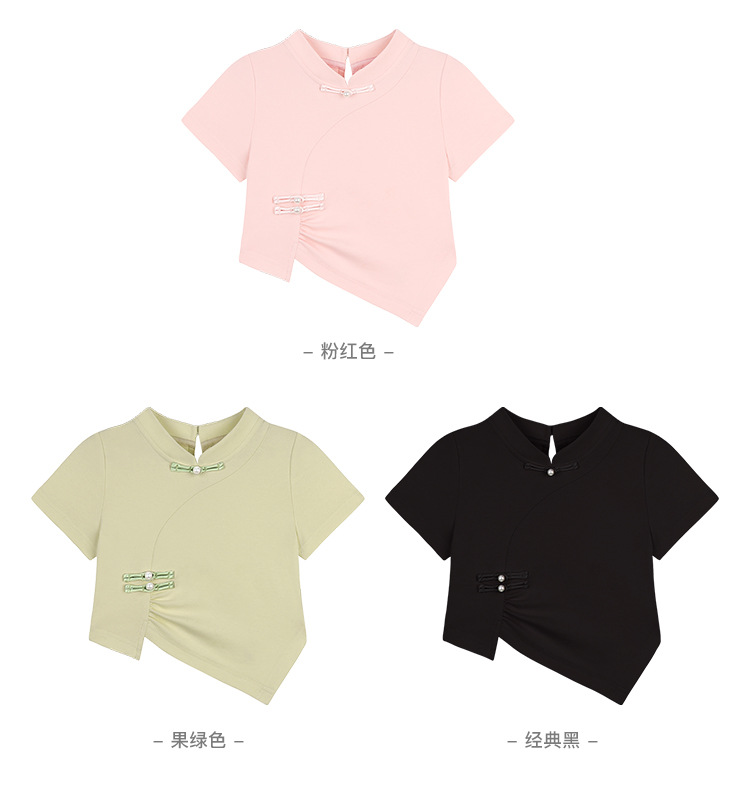 Amybaby Girls 'T 셔츠 2024 여름 불규칙한 중국 스타일 디자인 센스 우아한 버클 반소매 탑