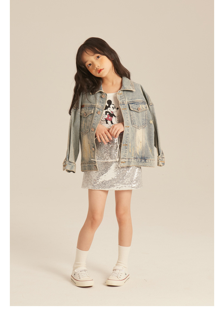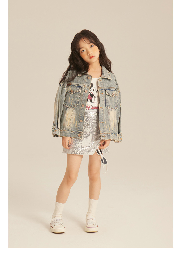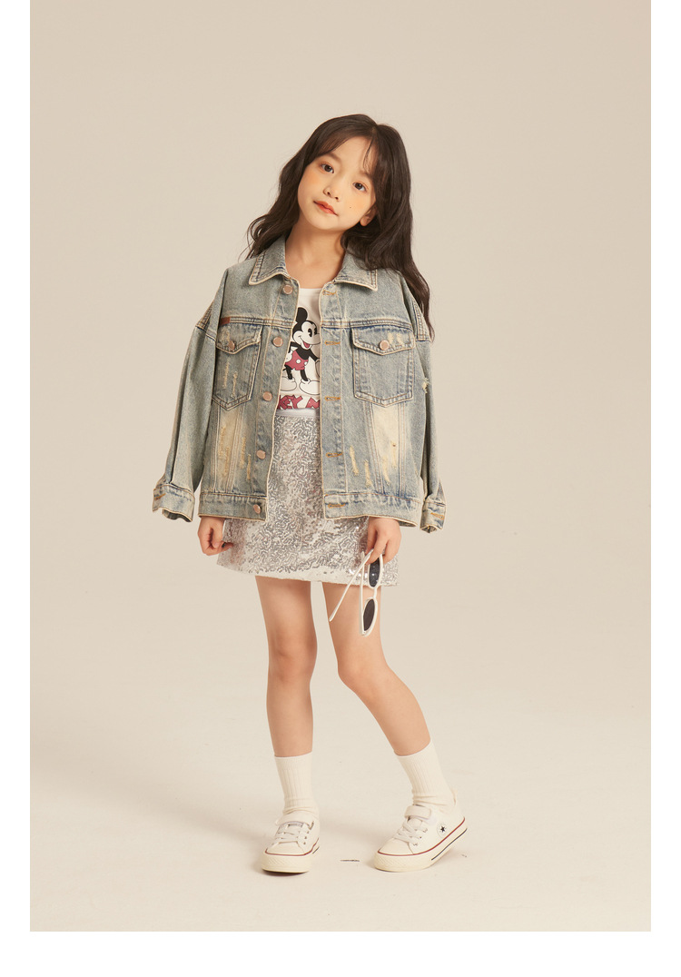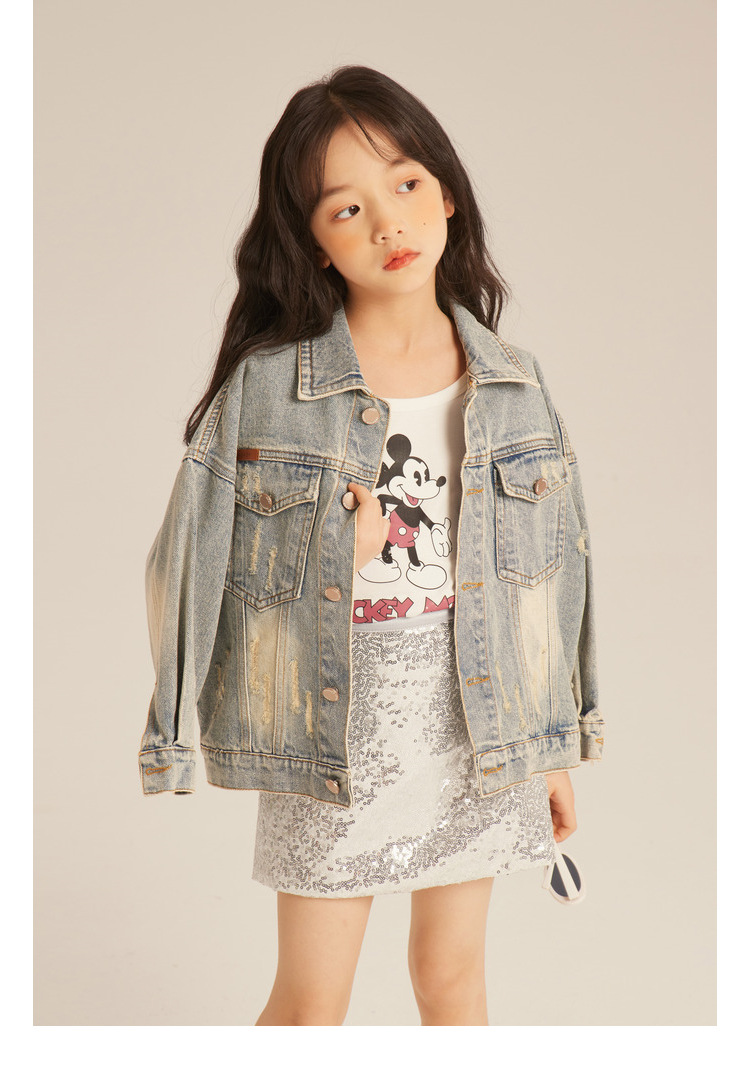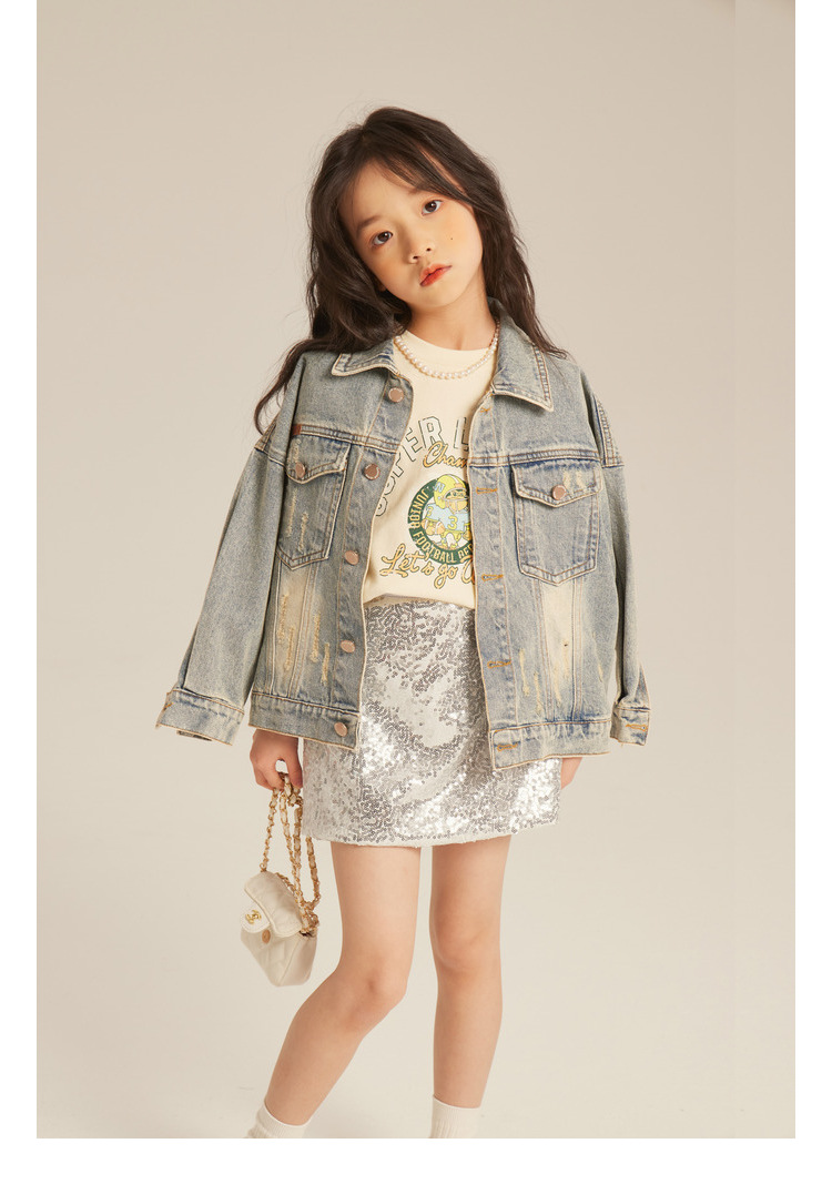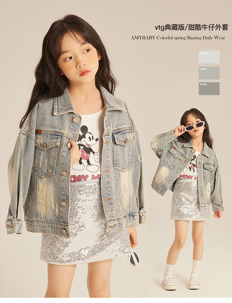Amybaby 소녀의 데님 코트 2024 새로운 어린이 서양 스타일 유행 미국 스타일 트렌디 쿨 데님 탑스토어 가기