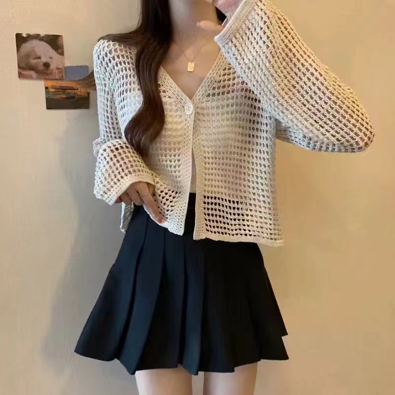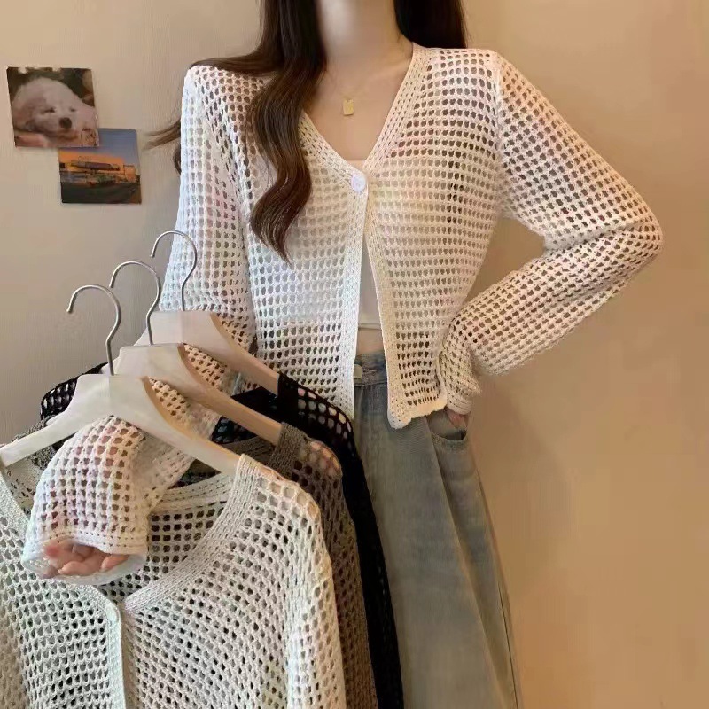 할로우 아웃 긴팔 선스크린 카디건 여자 2024 년 여름 새로운 한국식 느슨한 니트 셔츠 짧은 목도리 탑