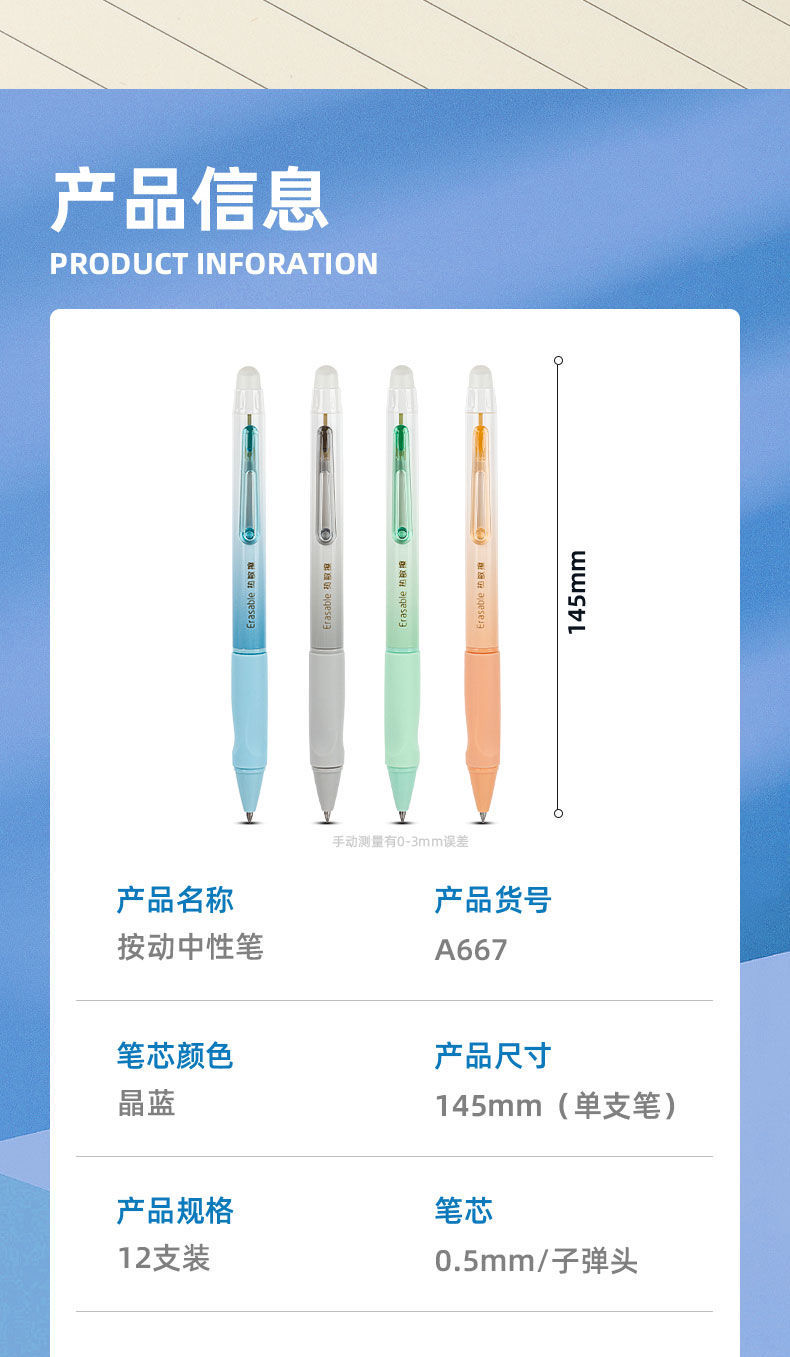 델리 A667 지울 수있는 젤 펜 교정 자세 프레스 지울 수있는 펜 특수 펜 3 학년 학생 0.5mm 펜스토어 가기