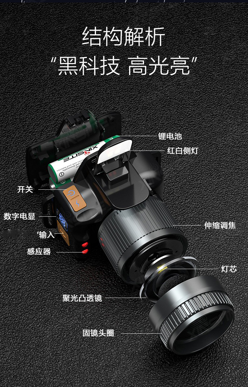 국경 간 야외 캠핑 강한 빛 유도 줌 장거리 USB 충전 배터리 수명 순찰 모험 야간 낚시 작업 헤드 라이트
