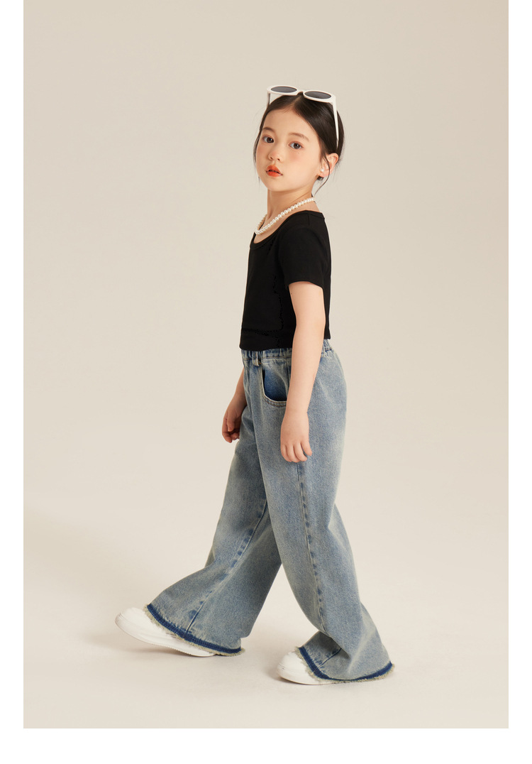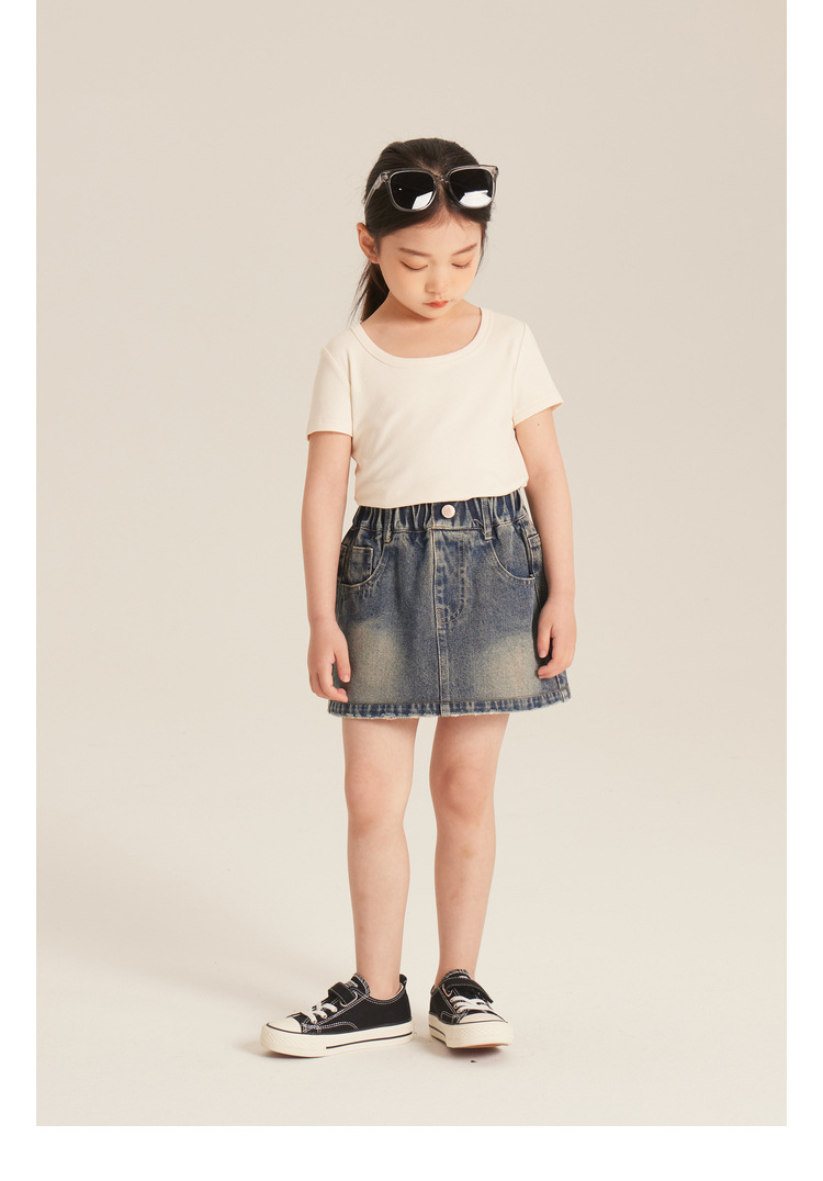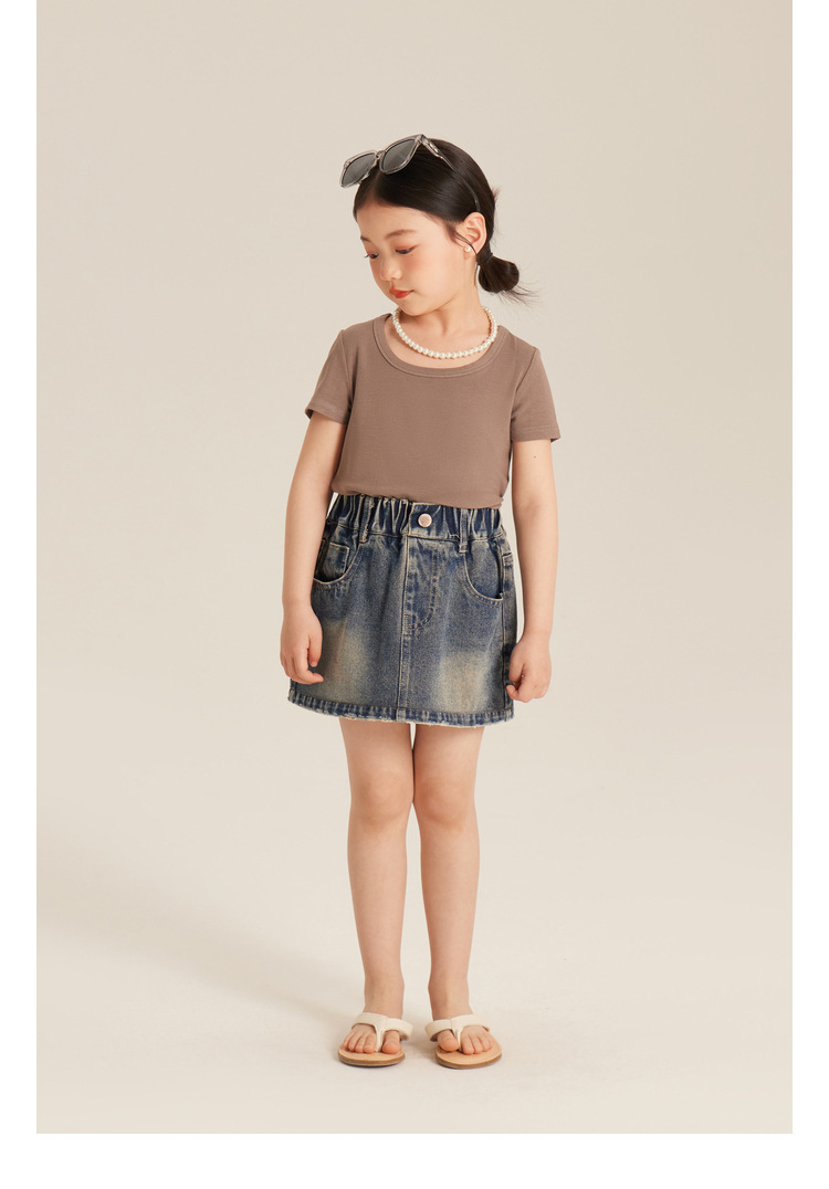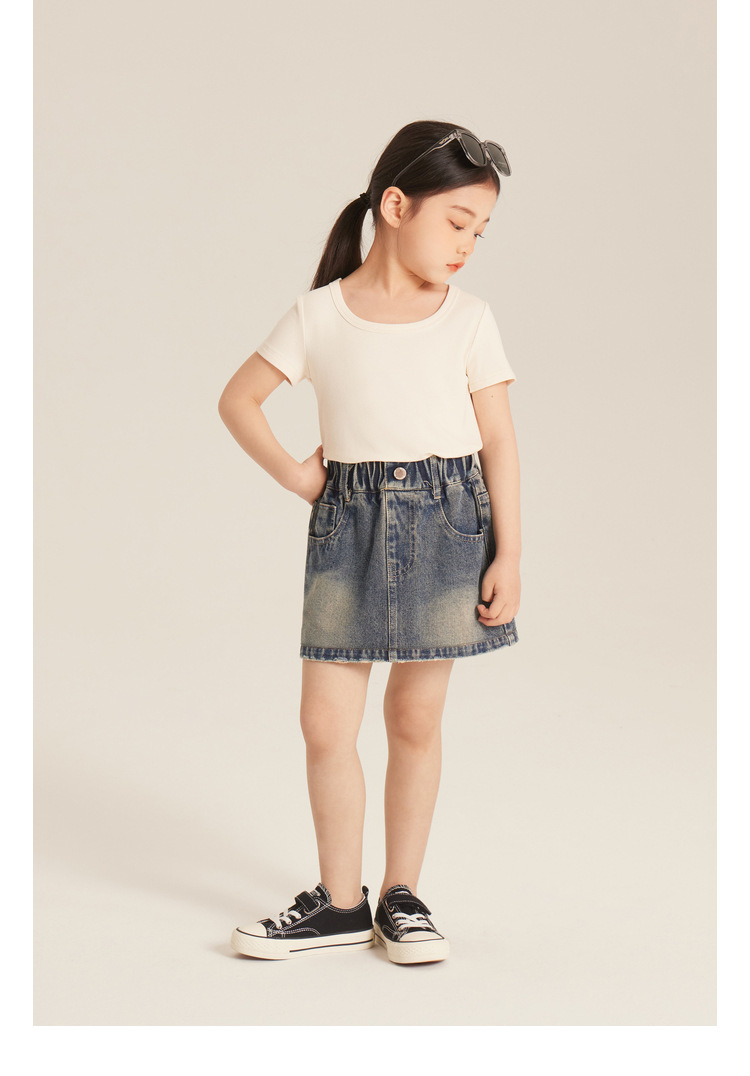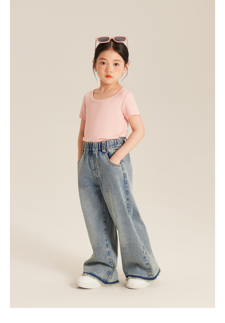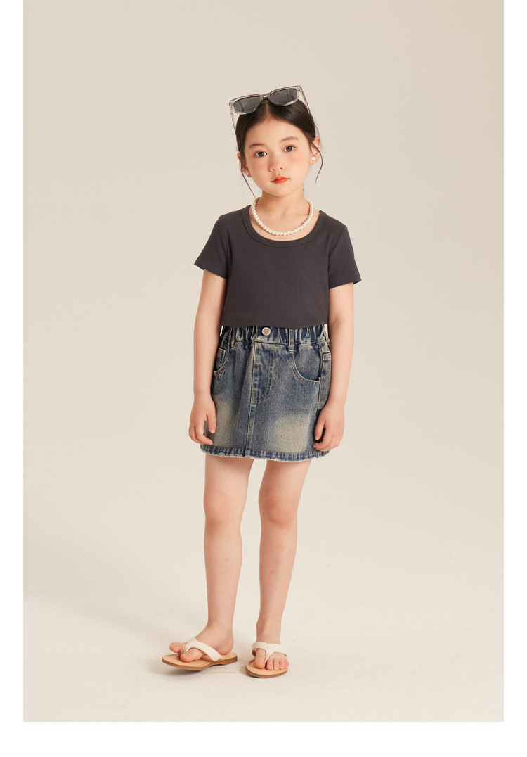 Amybaby Girls 반팔 티셔츠 2024 새로운 어린이 봄과 여름 간단한 캐주얼 솔리드 컬러 라운드 넥 탑스토어 가기
