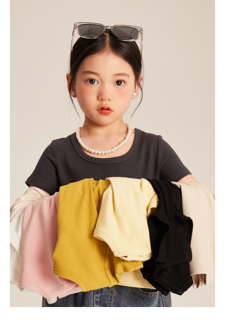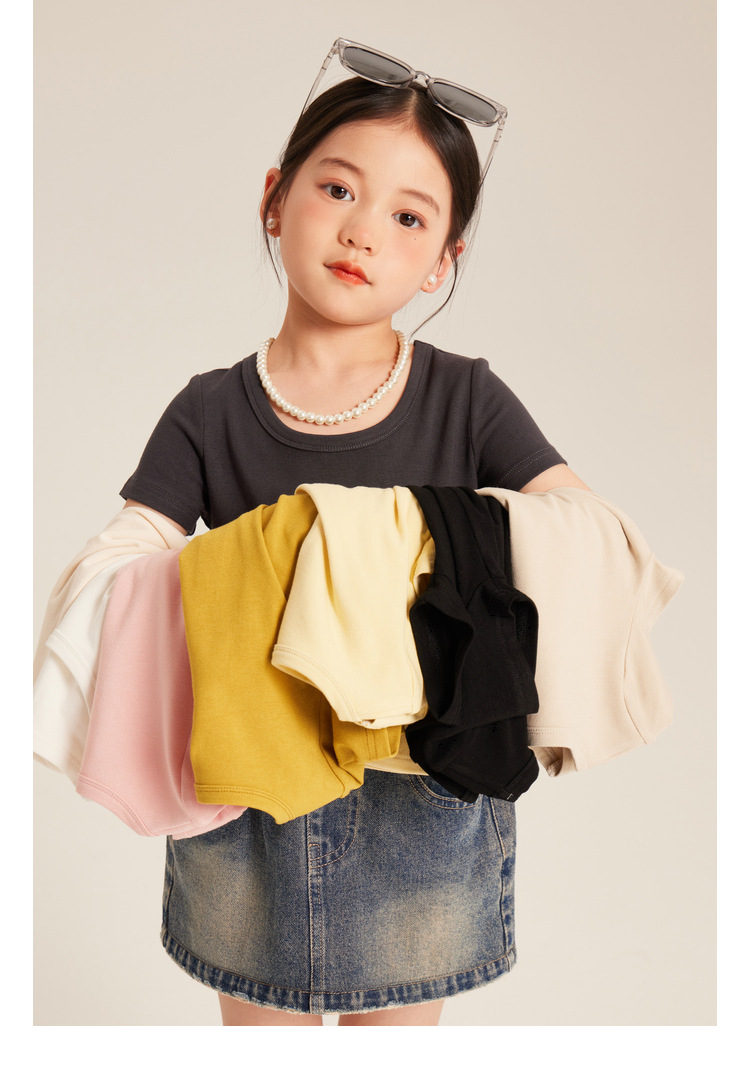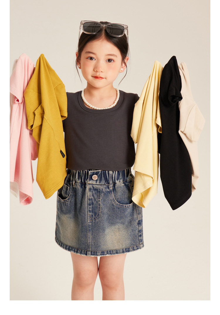 Amybaby Girls 반팔 티셔츠 2024 새로운 어린이 봄과 여름 간단한 캐주얼 솔리드 컬러 라운드 넥 탑