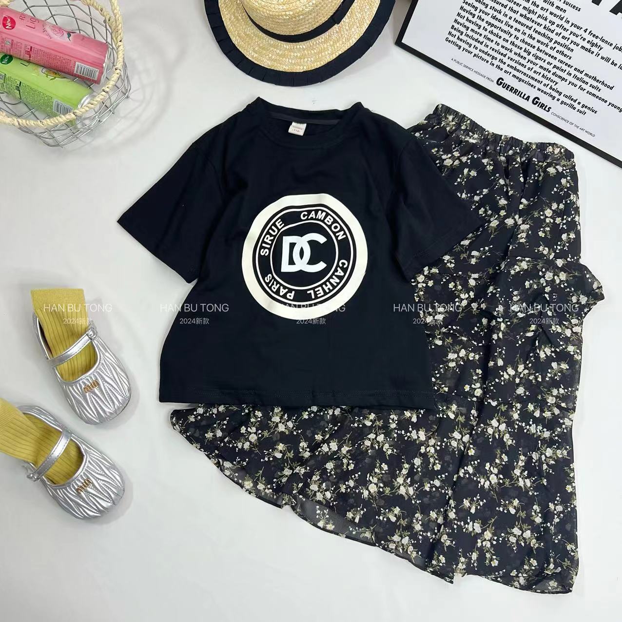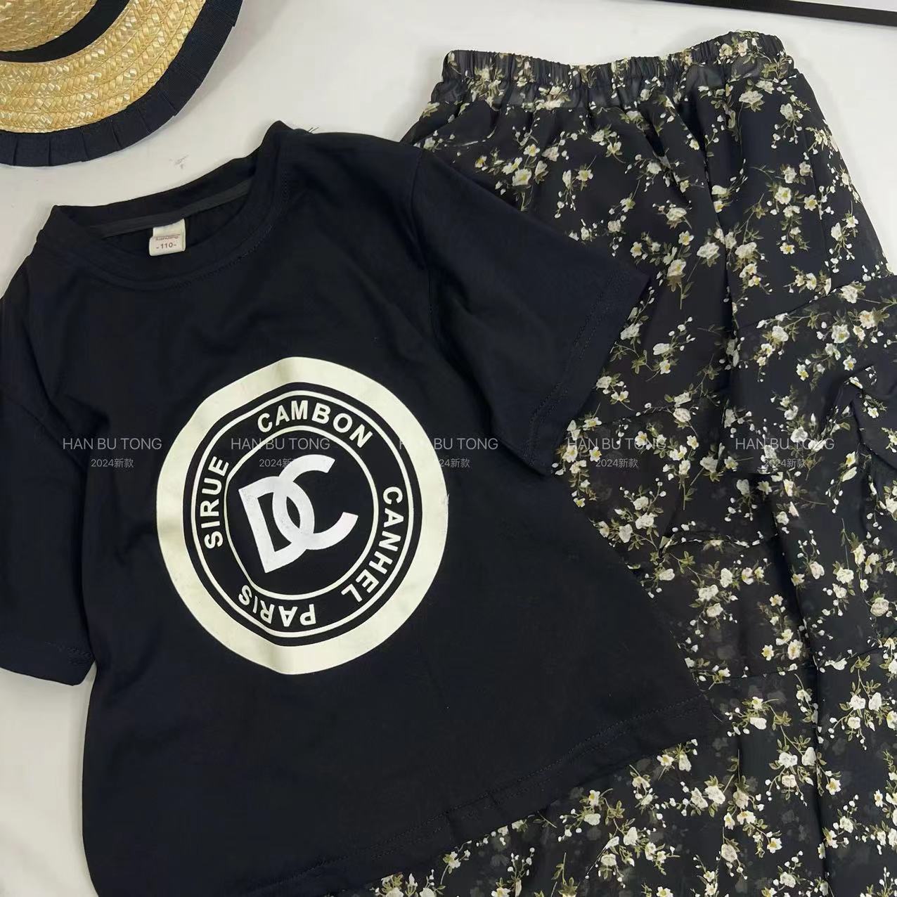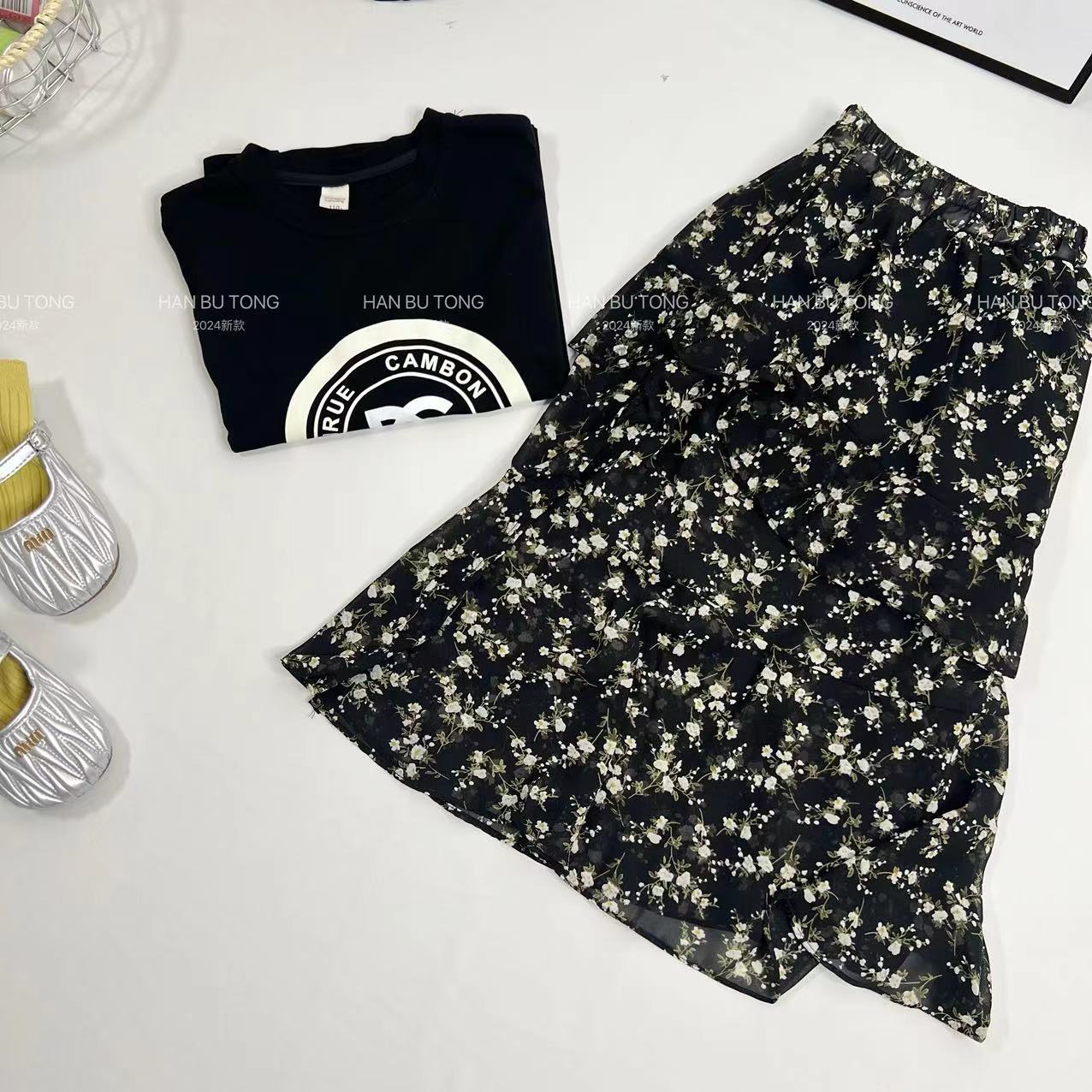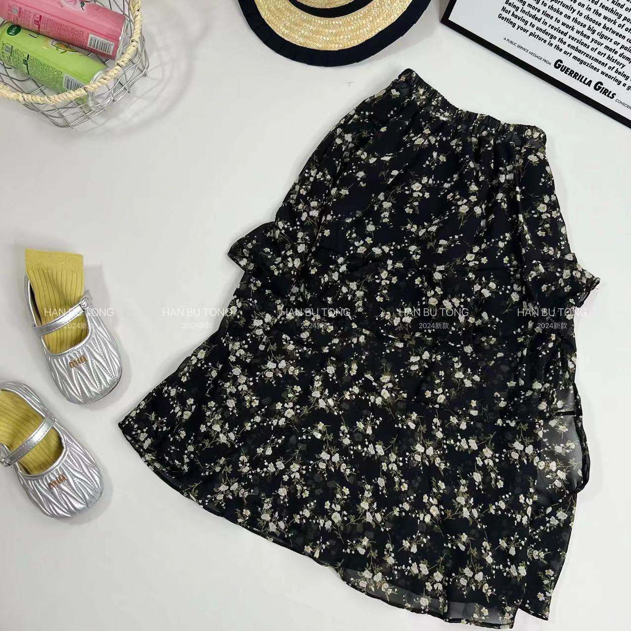소녀의 여름 원피스 2024 새로운 스타일 여름 서양식 소녀의 짧은 소매 쉬폰 꽃 절반 길이 원피스 투피스 세트