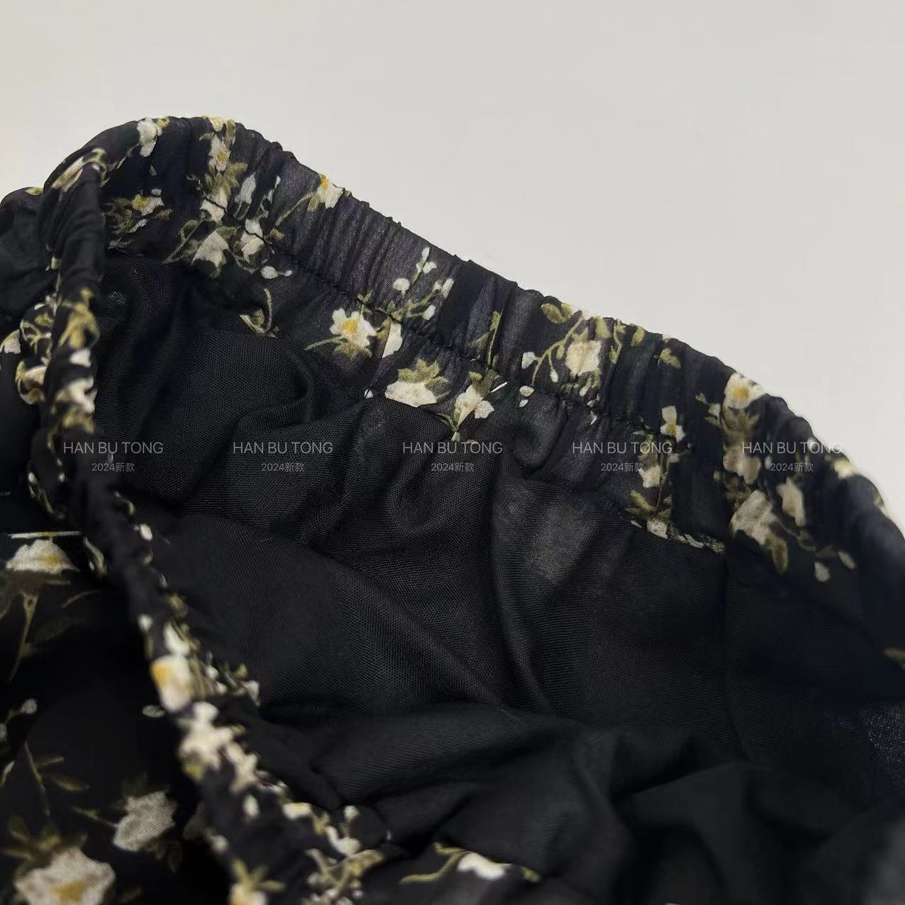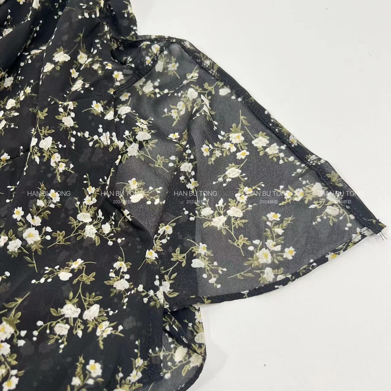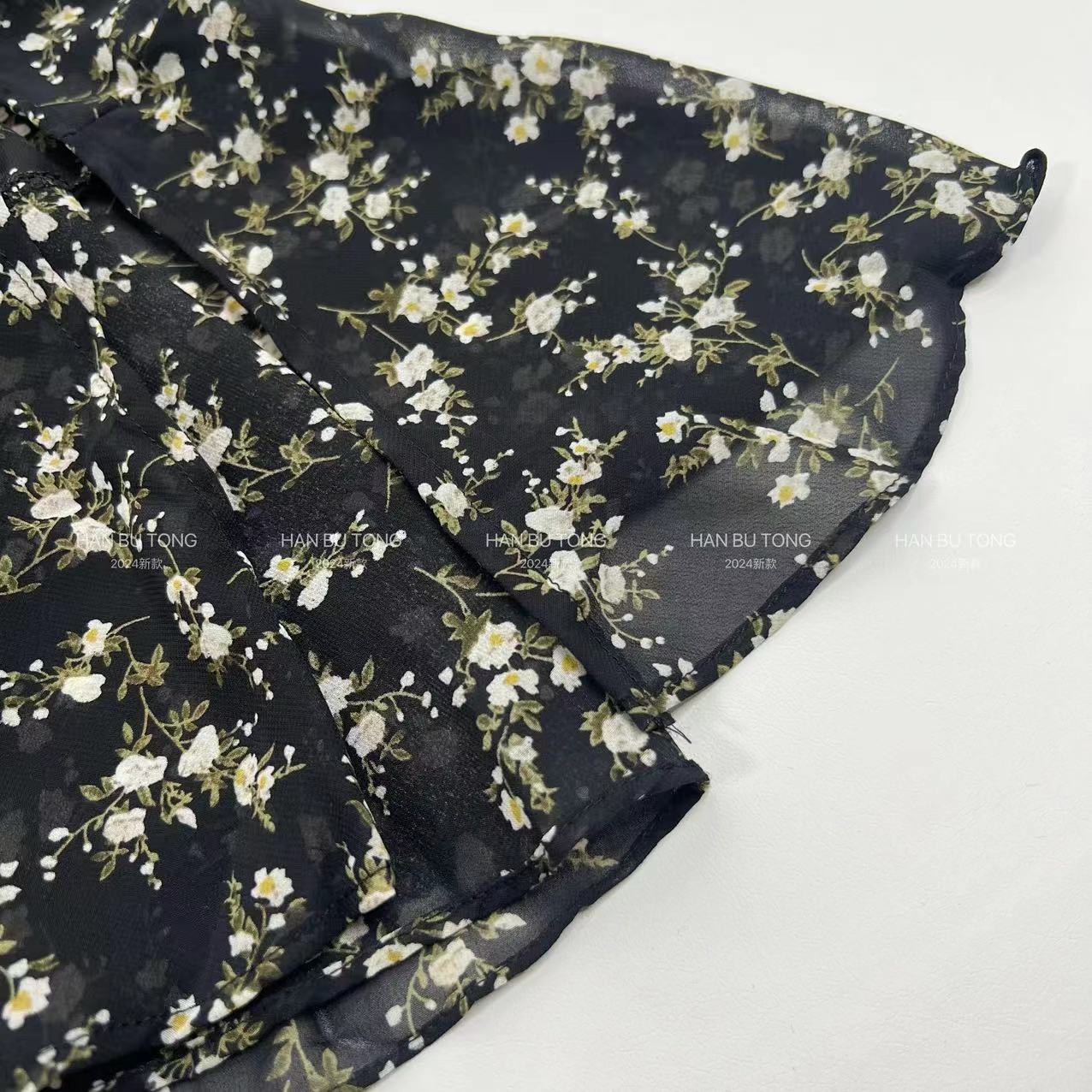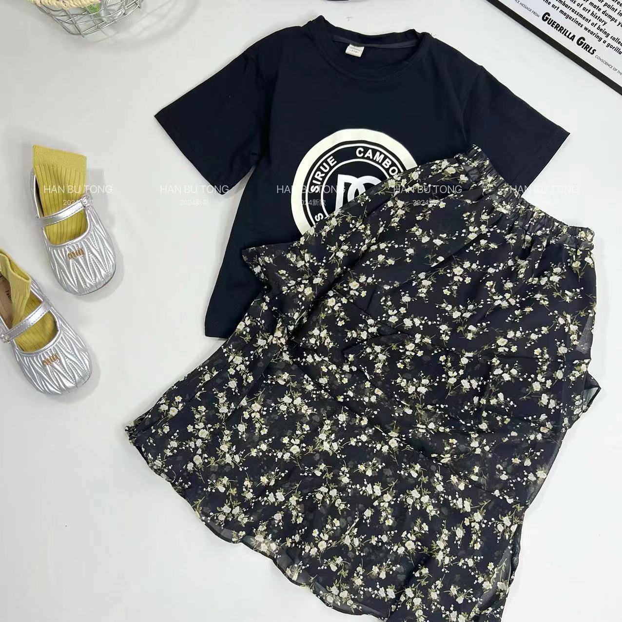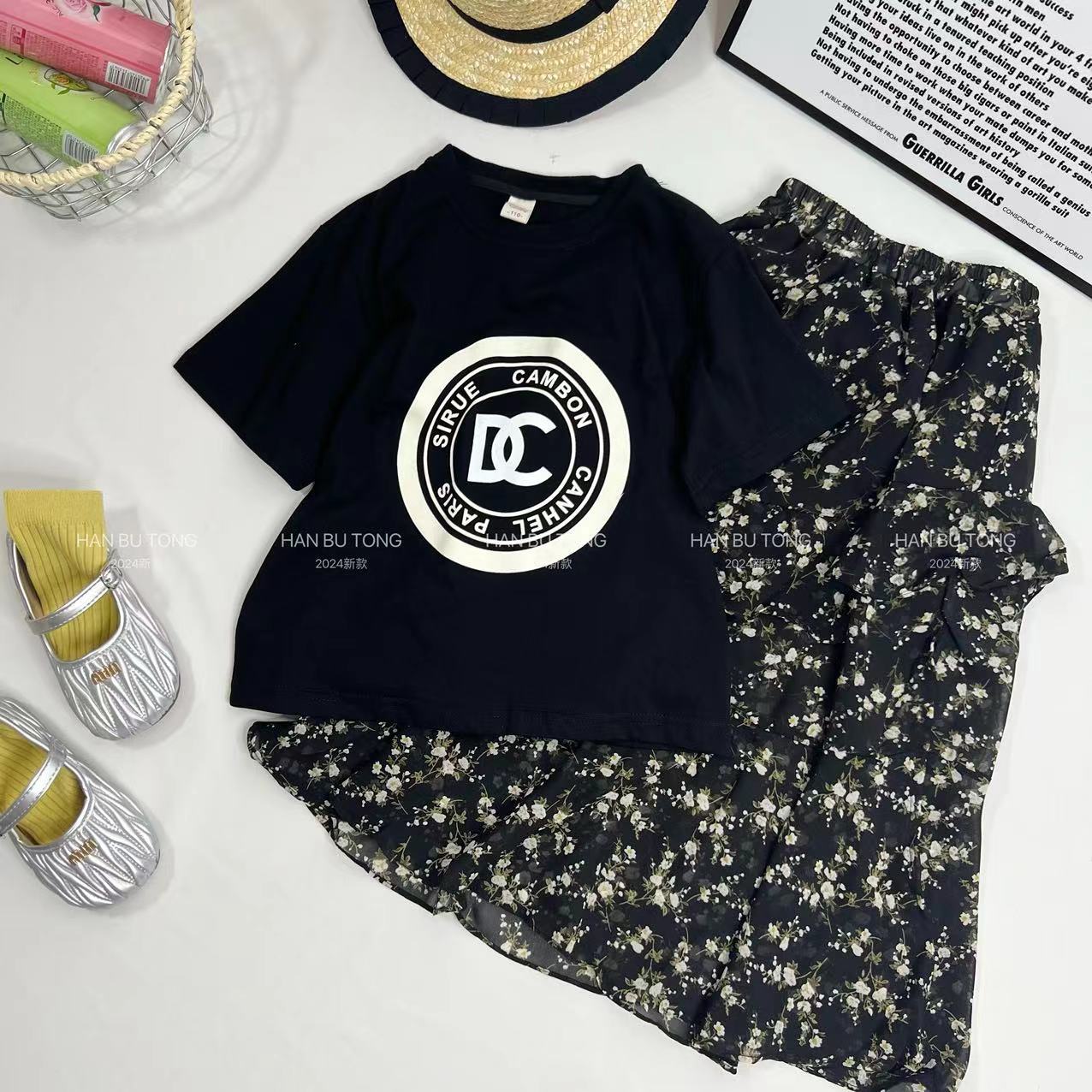소녀의 여름 원피스 2024 새로운 스타일 여름 서양식 소녀의 짧은 소매 쉬폰 꽃 절반 길이 원피스 투피스 세트