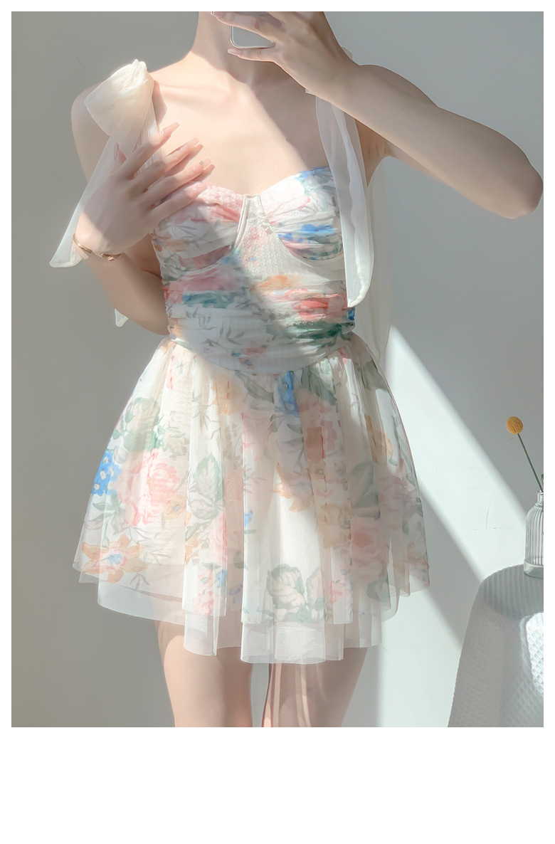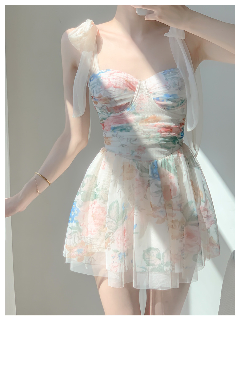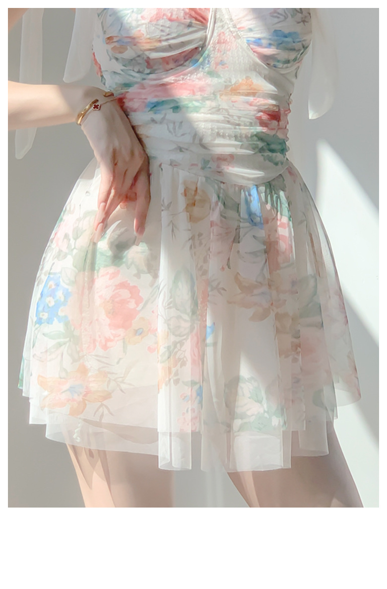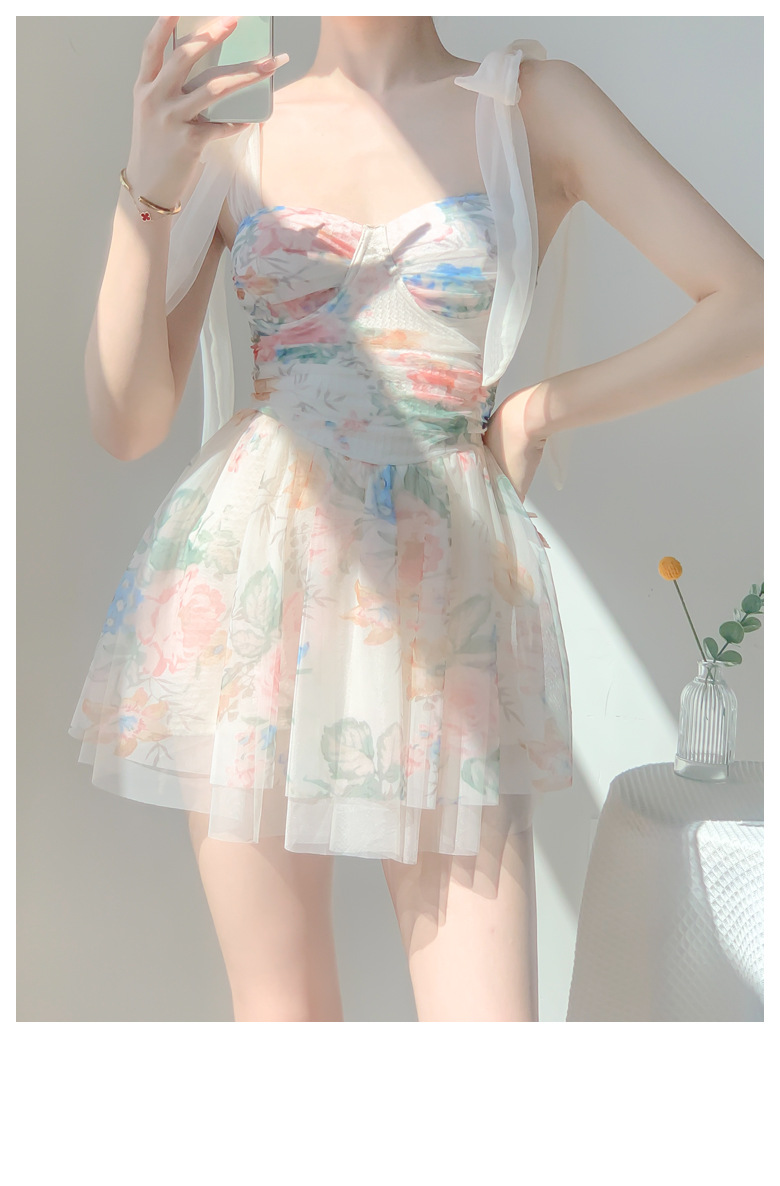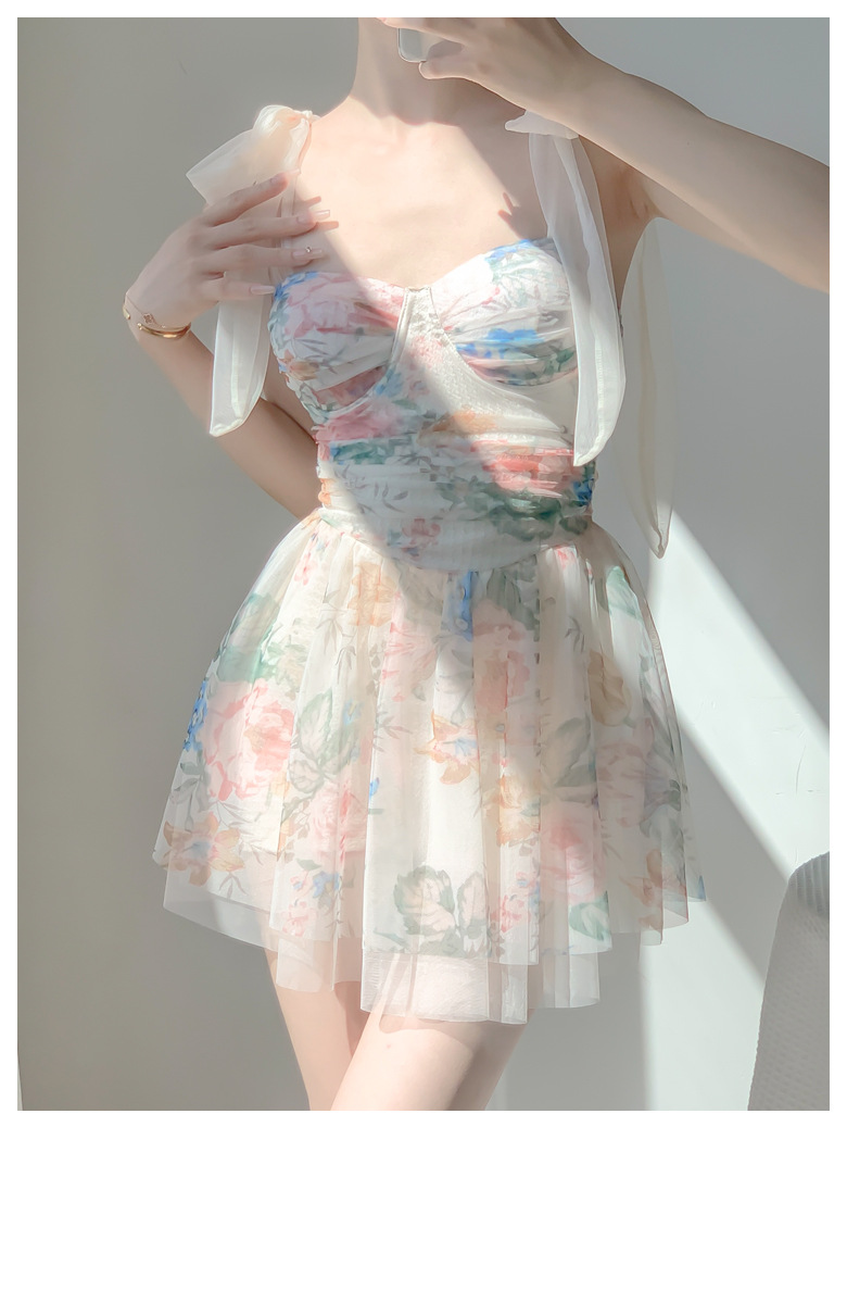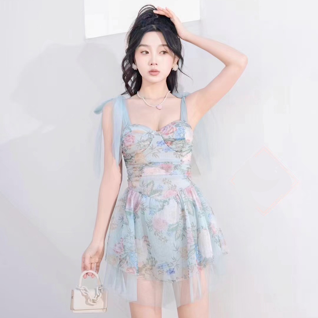 끈끈이 달린 순수한 소녀스러운 수영복, 고급스러운 요정풍 리본 꽃무늬 스커트 스타일의 원피스 수영복, 배를 커버해 날씬해 보이는 보수적인 수영복스토어 가기