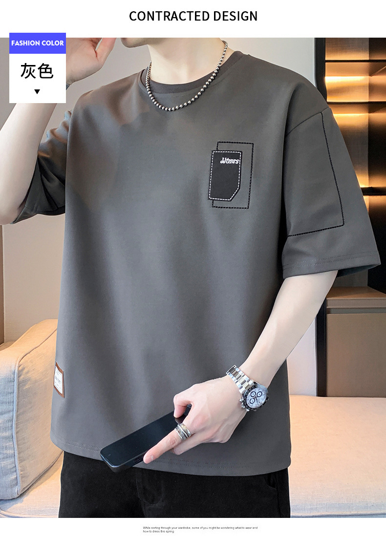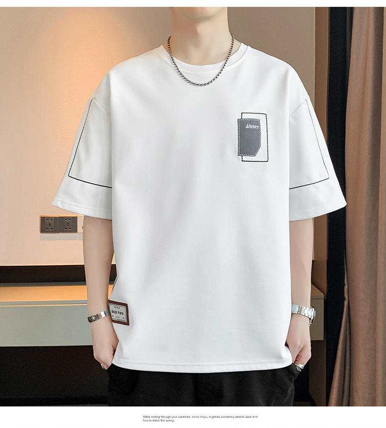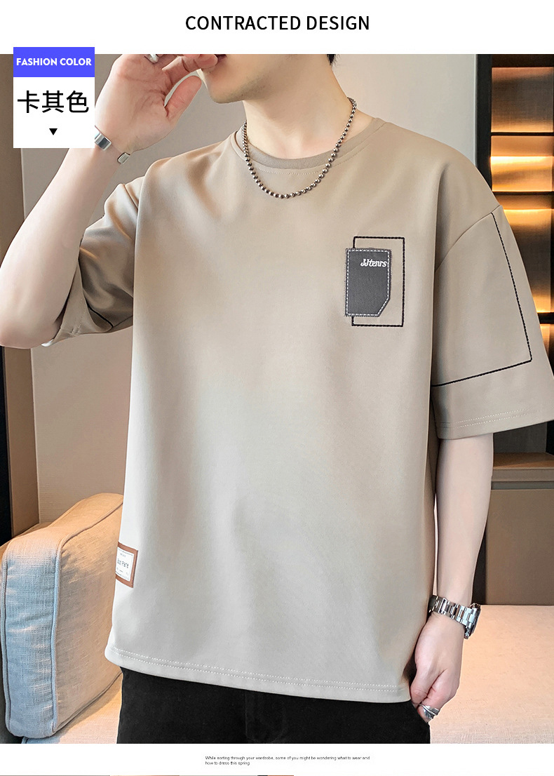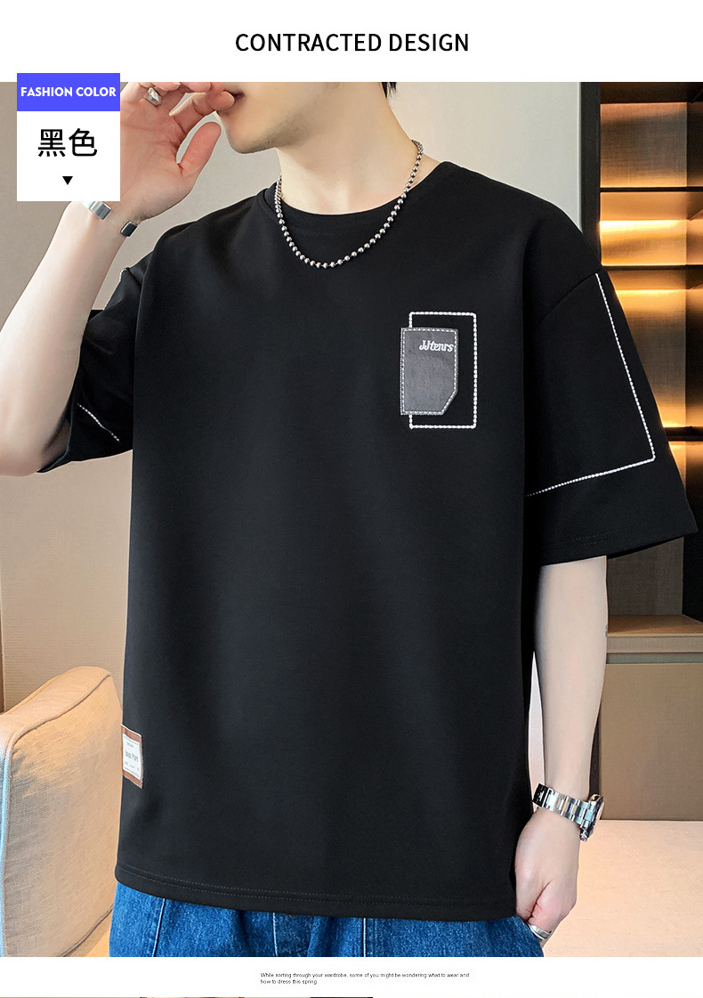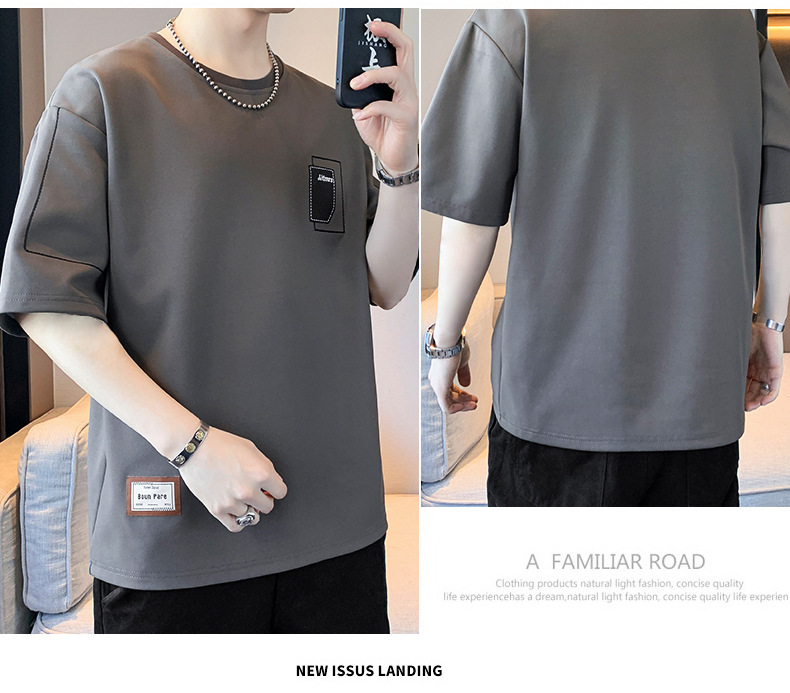 여름 트렌디 한 홍콩 스타일 남성 자수 크루 넥 반팔 티셔츠 통통한 남성 플러스 사이즈 대형 루즈 단색 티셔츠스토어 가기