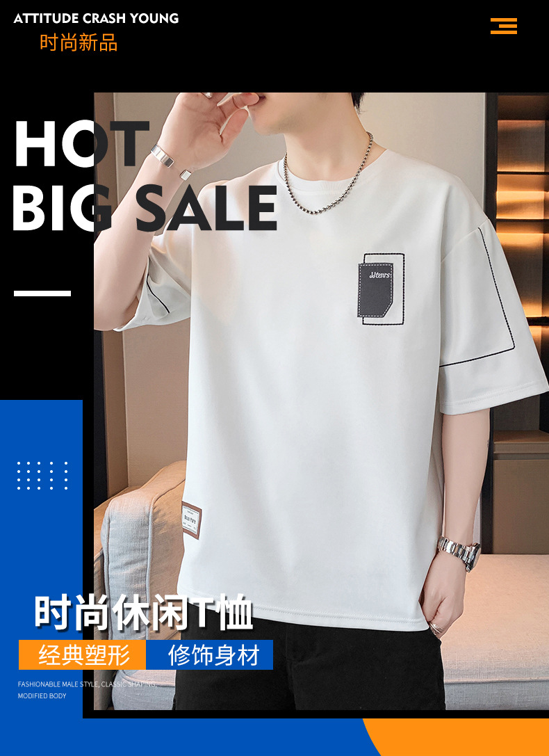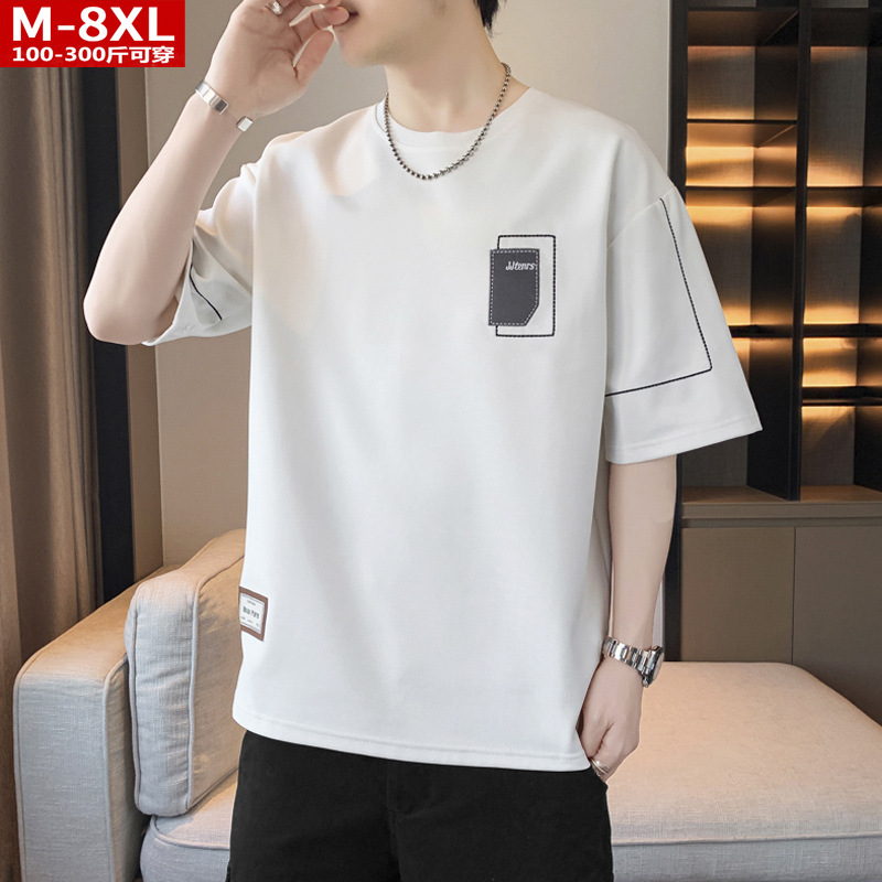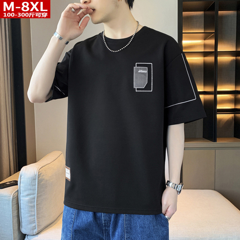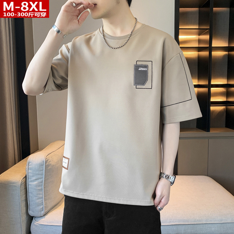 여름 트렌디 한 홍콩 스타일 남성 자수 크루 넥 반팔 티셔츠 통통한 남성 플러스 사이즈 대형 루즈 단색 티셔츠